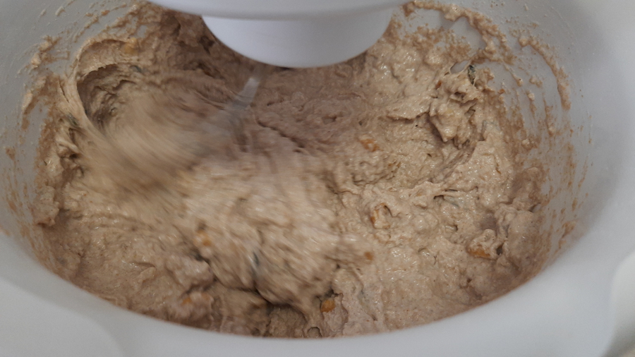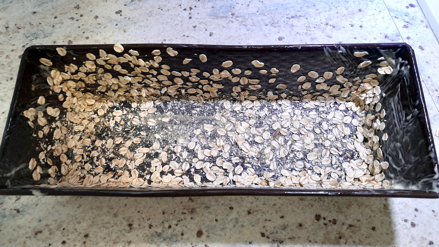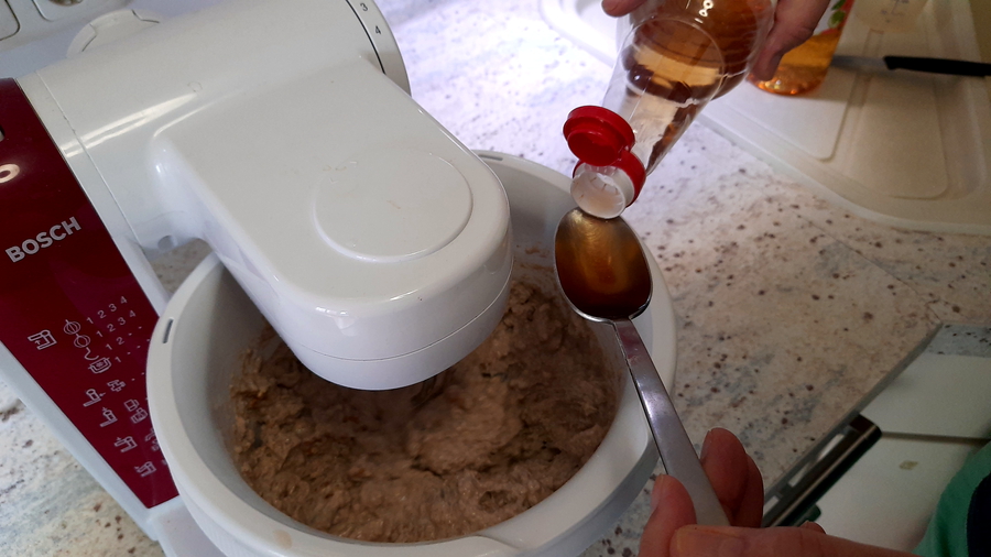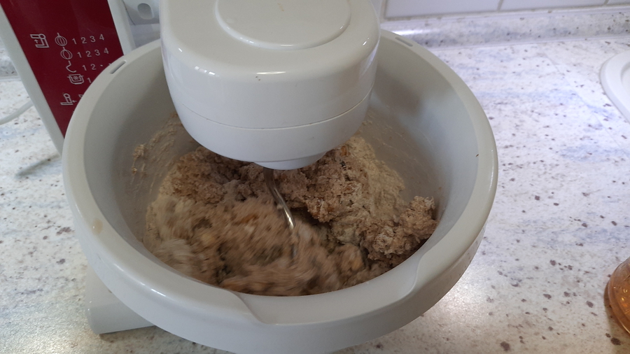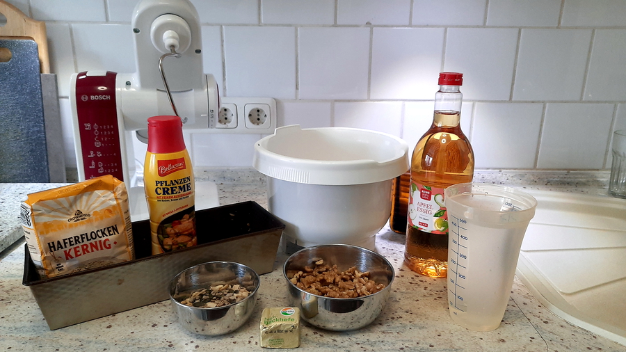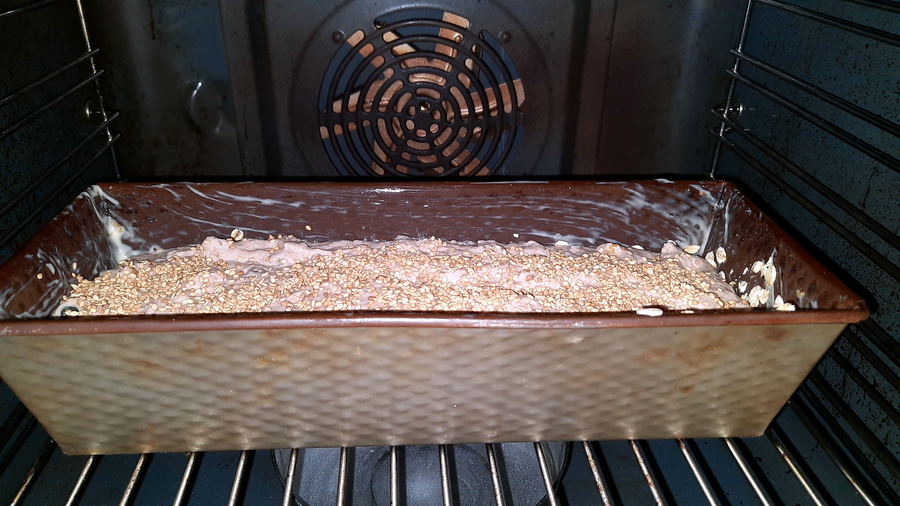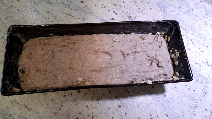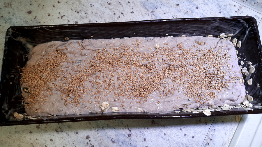 Alles zusammen in die Rührschüssel geben und ca. 10 Minuten rühren (lassen), bis der Teig anfängt zu reißen. Zwischenzeitlich die Backform dünn mit Fett einreiben und mit 2-3 EL groben Haferflocken bestreuen. Nach dem Einfüllen des Teiges können geröstete Sesamsamen, Sonnenblumenkerne oder Chiasamen obenauf gestreut werden.