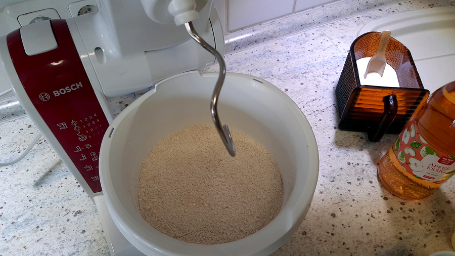 Mehl: wir verwenden eine Mischung von verschiedenen Mehlsorten, aber immer Vollkornmehl. Die besten Ergebnisse haben wir bei: 300g Weizenvollkornmehl, 100 g Dinkelvollkorn und 100 g Roggenvollkornmehl. Ihr könnt die Mischung zusammenstellen, wie es euch am besten schmeckt. Bedenkt, dass die verschiedenen Mehle evt. mehr oder weniger Wasser benötigen. Einfach ausprobieren. In der Mühle haben wir vor einiger Zeit Emmervollkornmehl entdeckt. Das ist ein Urkorn und gibt dem Teig einen herzhaften Geschmack. Der Teig braucht etwas weniger Wasser. Ich ersetze 100g Weizen durch Emmermehl. Reines Dinkelbrot trocknet schnell aus und wird krümelig.