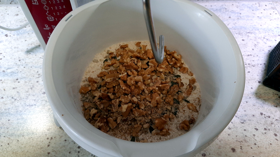 Körner, Nüsse: 150 – 200 g. Wieviel muss jeder selbst entscheiden. Ich mische meist 100 g Nüsse (die Sorte ist Geschmacksache) und 100 g Körner. Beim Discounter gibt es Kerne Mix für Salat. Die Mischung eignet sich hervorragend. Royal Nussmischung oder Walnüsse zerkleinere ich etwas. Sonnenblumenkerne oder Chiasamen sind ebenfalls mögliche Zutaten. Wenn es ein besonders leckeres Brot werden soll, gebe ich nur Nüsse zu. Statt Nüsse/Kerne kann man auch Röstzwiebeln (max. 150g!) in den Teig geben. Zwiebelbrot eignet sich besonders für herzhaften Brotbelag.