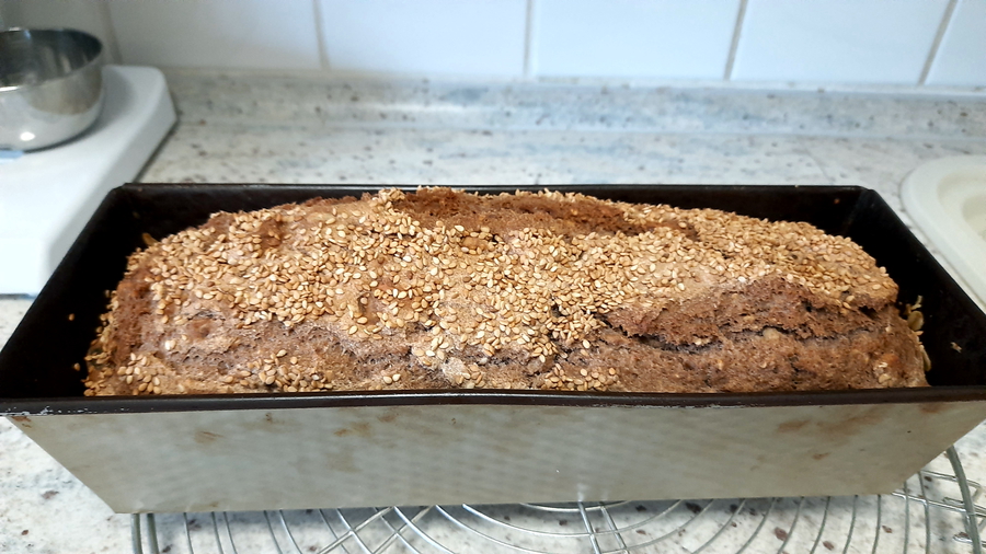 Die Form in den kalten Backofen auf die mittlere Schiene geben. Unten in den Ofen eine Schüssel mit Wasser stellen. Dann den Backofen bei Umluft auf 170 Grad stellen und den Teig 70 Minuten backen. Danach den Brotlaib auf ein Gitter geben und auskühlen lassen. Guten Appetit.