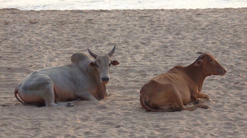 Zum Abendessen gingen wir fast täglich in eines der Lokale, genossen auch hier die farbenprächtigen Sonnenuntergänge und beobachteten dann Urlauber, Hunde und die Herde wilder Kühe, die sich fast jeden Abend vor dem Lokal „Garten am Meer“ versammelten. Der Geruch erinnerte zwar öfters an einen Kuhstall, der Wind sorgte aber immer schnell für eine frische Brise. Erstaunlicherweise waren die rund 40 Kühe mit Kälbchen, Rinder und Stiere jeden Abend ein Magnet für die Urlauber, um unzählige Fotos zu machen. Sie turnten zwischen der Herde herum, posierten bei den vier oder fünf kleinen Kälbchen, die sich als Gruppe zusammengelegt hatten oder getrauten sich auch mal an einen der Stiere mit Höcker heran. Wenn dieser dann aber den Kopf senkte, mit den Hufen den Sand nach hinten scharrte und ein brunftiges Schnaufen von sich gab, nahmen die meisten Fotografen doch lieber Reißaus. Gleiches galt für die wilden Hunde. Wenn diese sich zur Horde zusammentaten und bellend, knurrend und zähnefletschend auf eine der Kühe losgingen, trabte der Stier sofort hin, senkte seinen Kopf und ging mit den Hörnern auf die Hunde los. Denen verging dann schnell der Angriff und sie stoben in alle Richtungen.