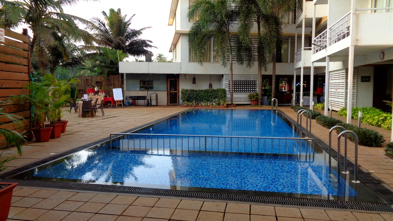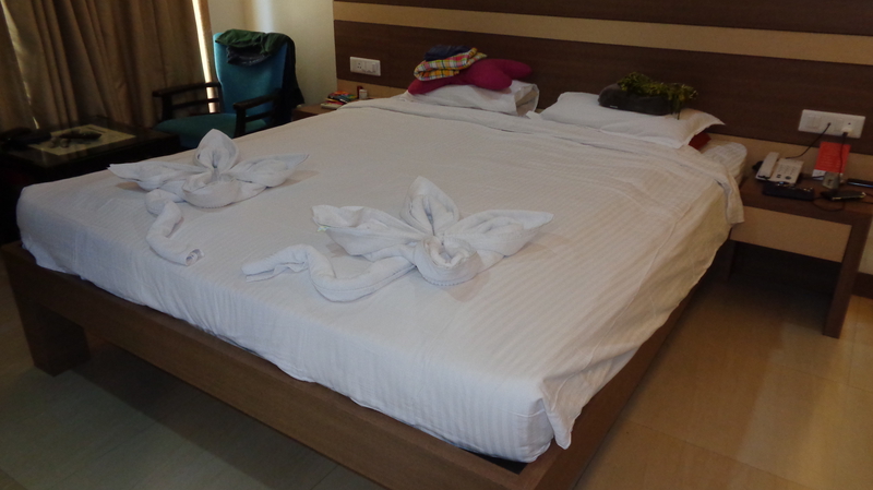 Pünktlich um 12 kam unser Taxi. Von wegen eine Stunde Fahrt. Schon nach einer knappen halben Stunde waren wir am Calangute Beach. Wie immer, begann dann wieder die Sucherei. Durch enge Gassen, mehrere Baustellen und den unendlich lebhaften Verkehr gelangten wir schließlich zum „Pinnacle Blue by the See“ ( zu deutsch: der blaue Gipfel am Meer), einem kleinen Hotel mit rund 10 Zimmern. Sauber, zweckmäßig eingerichtet und preisgünstig. Die Übernachtung mit Frühstück kostet hier für uns Beide nur 23 €. Das blaue Gebäude ist von allen Seiten gut zu erkennen.