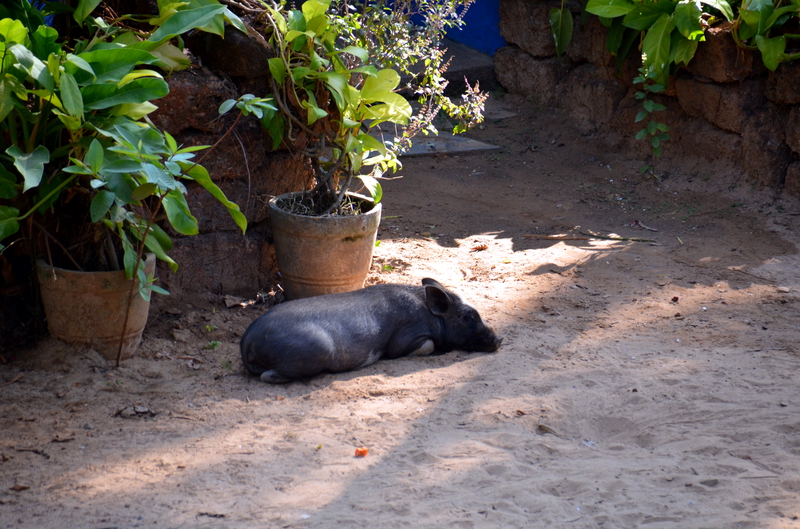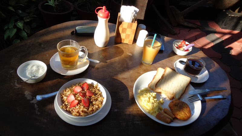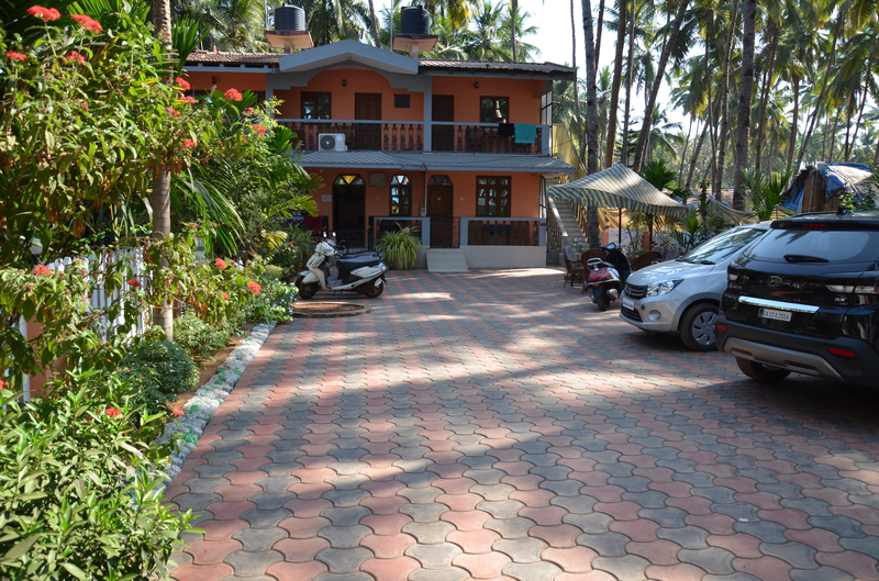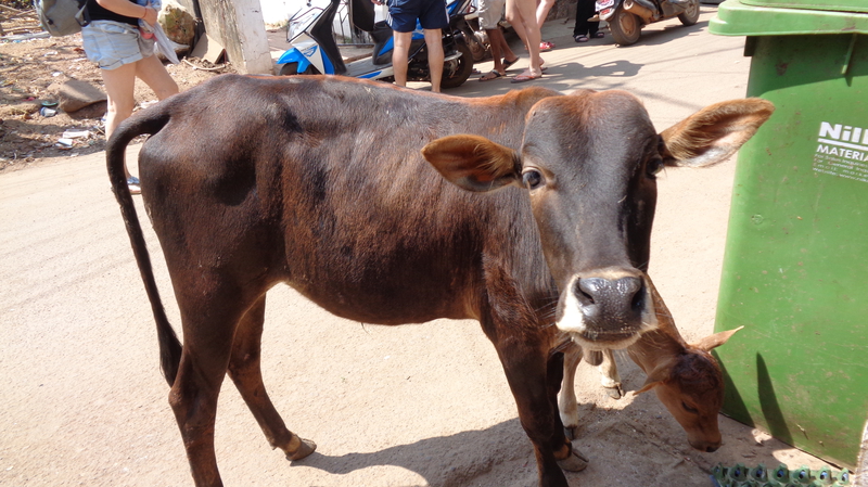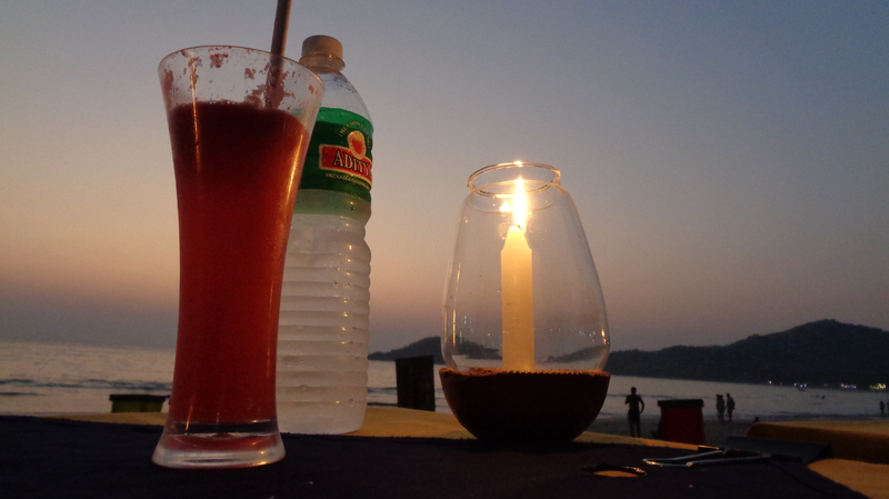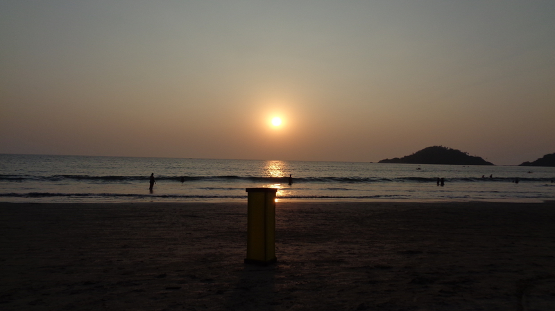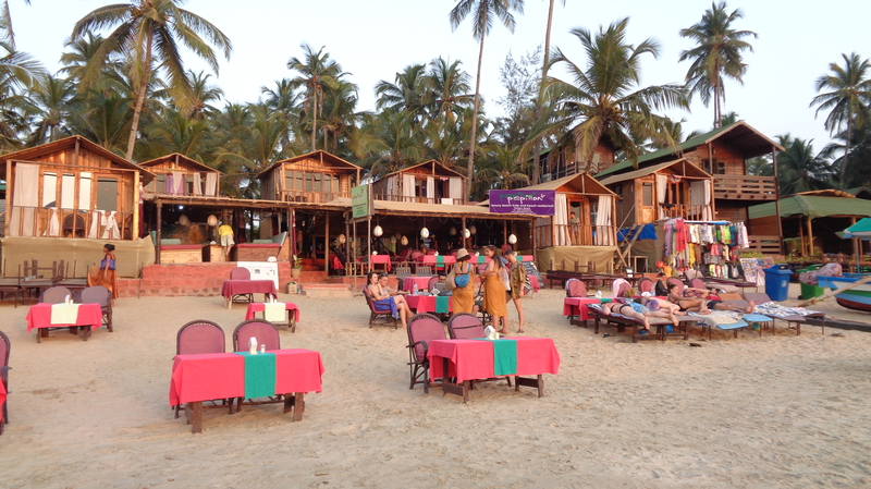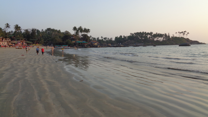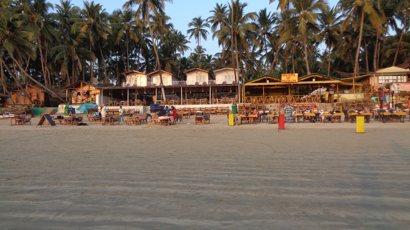 zwei Stunden. Nikolaus, der Manager des dortigen Hotels hatte uns ja einen „kostengünstigen“ Transport organisiert, da noch zwei andere Kunden im gleichen „riesigen SUV“ mitfahren sollten. Was dann aber kam, war ein normales Auto, welches gerade mal uns zwei und die drei Koffer aufnehmen konnte. „Schade, ich hatte gedacht, ich könnte euch Geld sparen…“ Da war es uns schon lieber, 13 € mehr zu bezahlen und dafür bequem sitzen zu können. Da die Strecke zum Schluss sehr kurvig wurde, waren wir ohnedies gezwungen, Pause zu machen, um Achims Reiseübelkeit entgegen zu wirken. In Palolem angekommen, begann die Suche nach dem Hotel. Nach einer halben Stunde fand der Taxifahrer nach mehrfachem Nachfragen schließlich das schöne, kleine Haus „Hilias Retreat“. Sehr sauber, mit gepflegter Anlage fanden wir unser Zimmer im 1. Stock vor. Es war zwar nicht groß, verfügte aber über einen Kühlschrank, Wasserkocher und Balkon zum Garten hin. Zu Fuß sind es nur zwei Minuten bis zum Strand. Endlich hatten wir wieder die Möglichkeit, lange Spaziergänge am und im Wasser zu machen. Seit unserer Ankunft zählt es zu unseren täglichen Ritualen, die zwei km bis zum Ende des Strandes und zurück zu gehen und anschließend eine halbe Stunde im Meer abzukühlen. Unsere Sachen legen wir dann am Lieblingsrestaurant auf einer Liege ab, wo die Bedienungen darauf achten. In seiner Art erinnert uns dieser Strand an den Strand von Calangute. Vor jedem Lokal sind Sonnenliegen aufgebaut. Als Kunde des Lokals kann man diese kostenlos nutzen, wird aber (im Gegensatz zu Calangute) hier von keinen Verkäufern oder Masseurinnen belästigt. Abends verschwinden diese Liegen, die ohnedies nur an den unteren 15 Lokalen zu finden sind, und es werden Tische, direkt am Meer aufgebaut, wo die Urlauber dann den Sonnenuntergang bestaunen und sich anschließend das Abendessen schmecken lassen können.