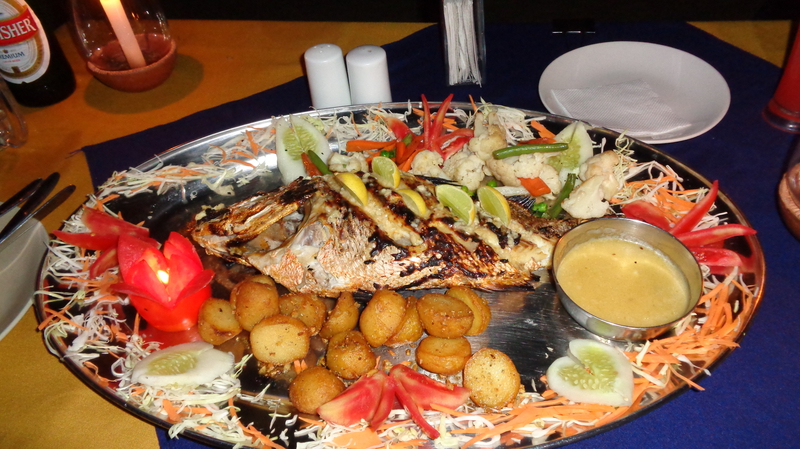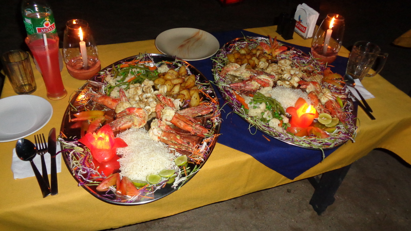 Ein einmaliges Erlebnis, abends hier zu sitzen, das farbenprächtige Spektakel des Sonnenuntergangs zu verfolgen und dann anschließend einen frisch zubereiteten Fisch mit Gemüse und Kartoffelchips zu genießen. Mit Getränken und Dessert kostete uns dieses Vergnügen 26 €. Für heute Abend haben wir uns Jumbo Garnelen und Tintenfisch bestellt und feiern so den 26. Jahrestag unseres Kennenlernens. Dieser ist zwar erst in viert Tagen, ist aber mit einem Tagesausflug verplant. Sollte es sich ergeben, feiern wir den Tag eben nochmal. Schließlich ist jeder Tag ein Grund zu feiern und das sollte man tun, solange es geht.