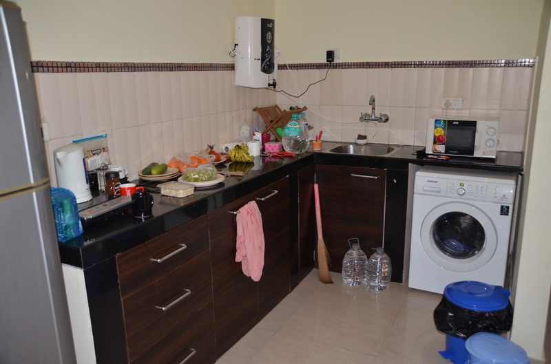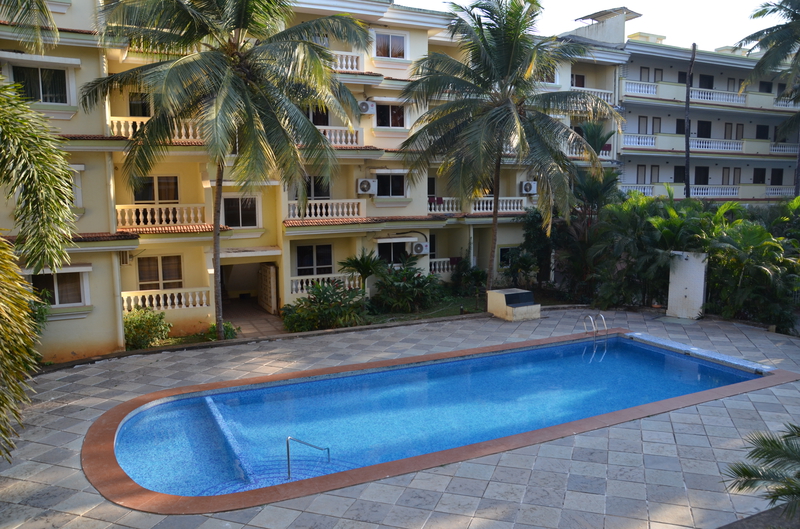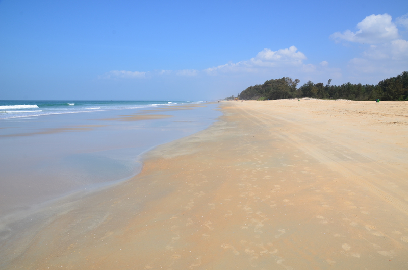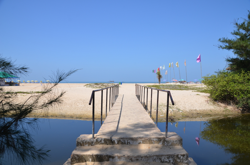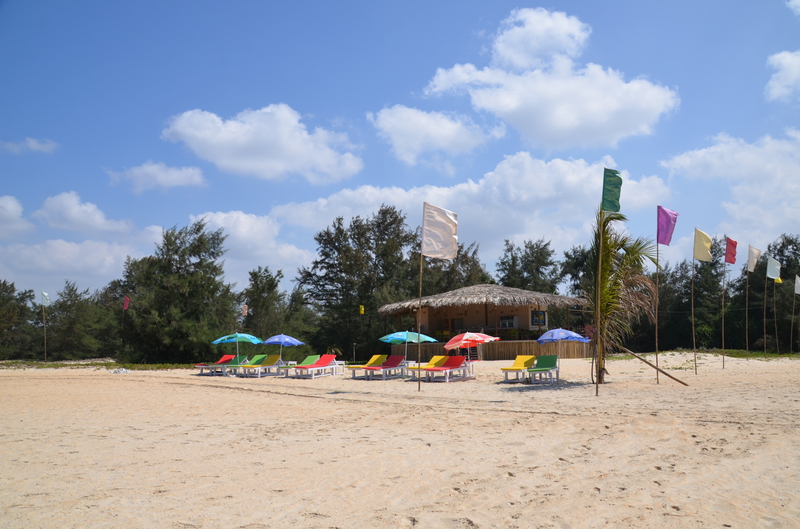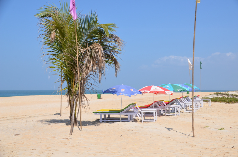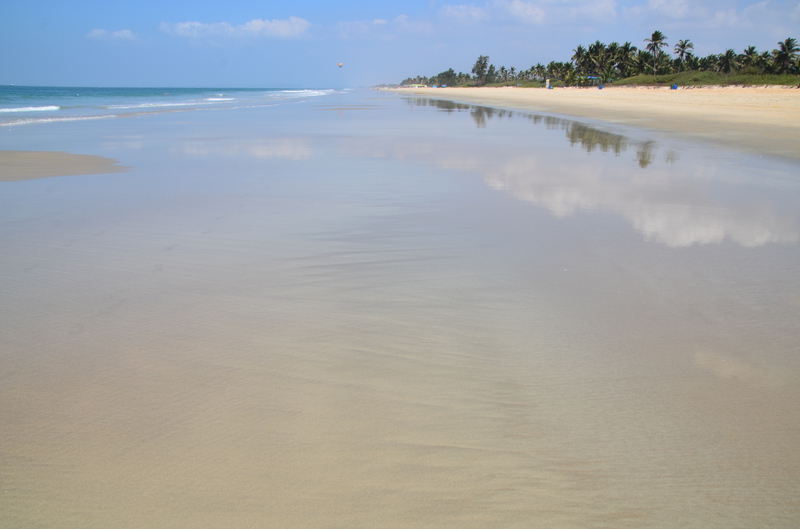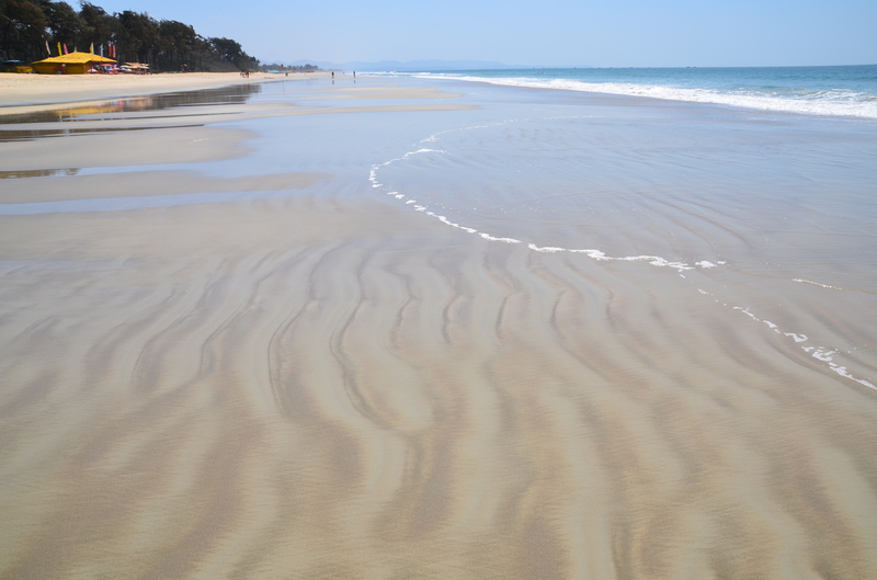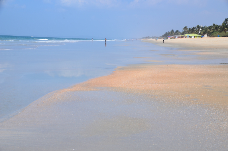 Als der Taxifahrer von seinem Termin kam, war er sehr erleichtert, von dieser Entwicklung zu hören. Da er sich selbst nicht sicher war, das Hotel heute noch zu finden (was gab es zu finden, wenn es diese Höhle nicht gab?), hatte er vorsorglich in seiner Nachbarschaft ein Hotelzimmer für eine Nacht gebucht, welches er jetzt wieder absagte. „Das Hotel kenne ich, auch den Eigentümer. Es wird euch gefallen…“ In der Tat lag die neue Unterkunft genau gegenüber dem Punkt, wo er uns vom Taxi aus Agonda übernommen hatte. Wäre schön gewesen, wenn wir die Stunden dazwischen hätten streichen können. In der Anlage erwartete uns bereits der Besitzer. „Freut mich, dass sie sich für meine Wohnung entschieden haben.“ Wir sahen uns erstaunt an. Wohnung? In der Tat war es kein Hotel, sondern eine Anlage mit verschiedenen Wohnungen. Er selbst hatte mit seiner Schwester sieben Wohnungen. „Hättet ihr direkt bei mir gebucht, wäre es für euch bestimmt billiger geworden.“ Witzbold, wie hätten wir direkt über ihn buchen sollen. Unsere neue Bleibe war insgesamt größer, als unsere Wohnung in Köln. Neben Schlafzimmer, Wohn- Essbereich und Küche gab es ein helles, beiges Bad und zwei Balkone. Wir waren begeistert. Neben Mikrowelle, Wasserkocher und Wasserfiltergerät (Ihr könnt das Wasser unbedenklich trinken…) gab es eine Kühl- Gefrierkombination und eine Waschmaschine. Alles da, um sich selbst versorgen zu können. Das hatten wir allerdings nicht vor, da man überall günstig in den Lokalen essen konnte. Pro Nacht zahlten wir 32 €, was der Besitzer direkt bar in Empfang nahm. Nachdem er uns noch einige Kleinigkeiten aus seinem Fundus brachte, hinterließ er uns seine Whats App Nummer und verschwand. Wir waren nicht nur von der Größe der Wohnung, sondern auch von dem riesigen Pool, der uns aus dem Innenhof mit seinem hellen Blau entgegenstrahlte begeistert. Hier würden wir es bestimmt die nächsten zwölf Tage aushalten. Den Weg zum Strand, er sollte laut Angabe rund 500 m entfernt sein, erkundeten wir am nächsten Tag und stellten erstaunt fest, dass die Entfernung mindestens das Doppelte betrug. Was uns dann aber erwartete, war der schönste Strand, den wir bisher in Goa gesehen hatten. Laut Reiseführer sei der Strand an die 30 km lang. Allein die Breite bei der momentanen Ebbe war bis zum Grüngürtel bis zu 100 m. Eine Reihe von Wellen erzeugte eine Reihe von weißen Schaumkronen, die dann auslaufend um unsere Füße spülten. Dieser Anblick war für uns ungewohnt und faszinierend. An diesem Strand verbrachten wir Stunden mit herrlichen Spaziergängen, immer wieder angesprochen von den Bedienungen der einzelnen Lokale, die hier ihr Auskommen mit dem Verkauf von Essen und Trinken suchten. Die davor aufgebauten Sonnenliegen sollten sie dabei unterstützen. Schon der Anblick dieser Liegen, und die Sauberkeit der darauf liegenden Handtücher waren oft entscheidend, ob Urlauber kamen. Machten diese einen schmutzigen, vergammelten Eindruck und waren die Sonnenschirme verschlissen, waren meist auch die Liegen leer. Bei sauberen, gepflegten Liegen und intakten Sonnenschirmen war das meist ein Grund, die Einladung in dieses Lokal auch anzunehmen.