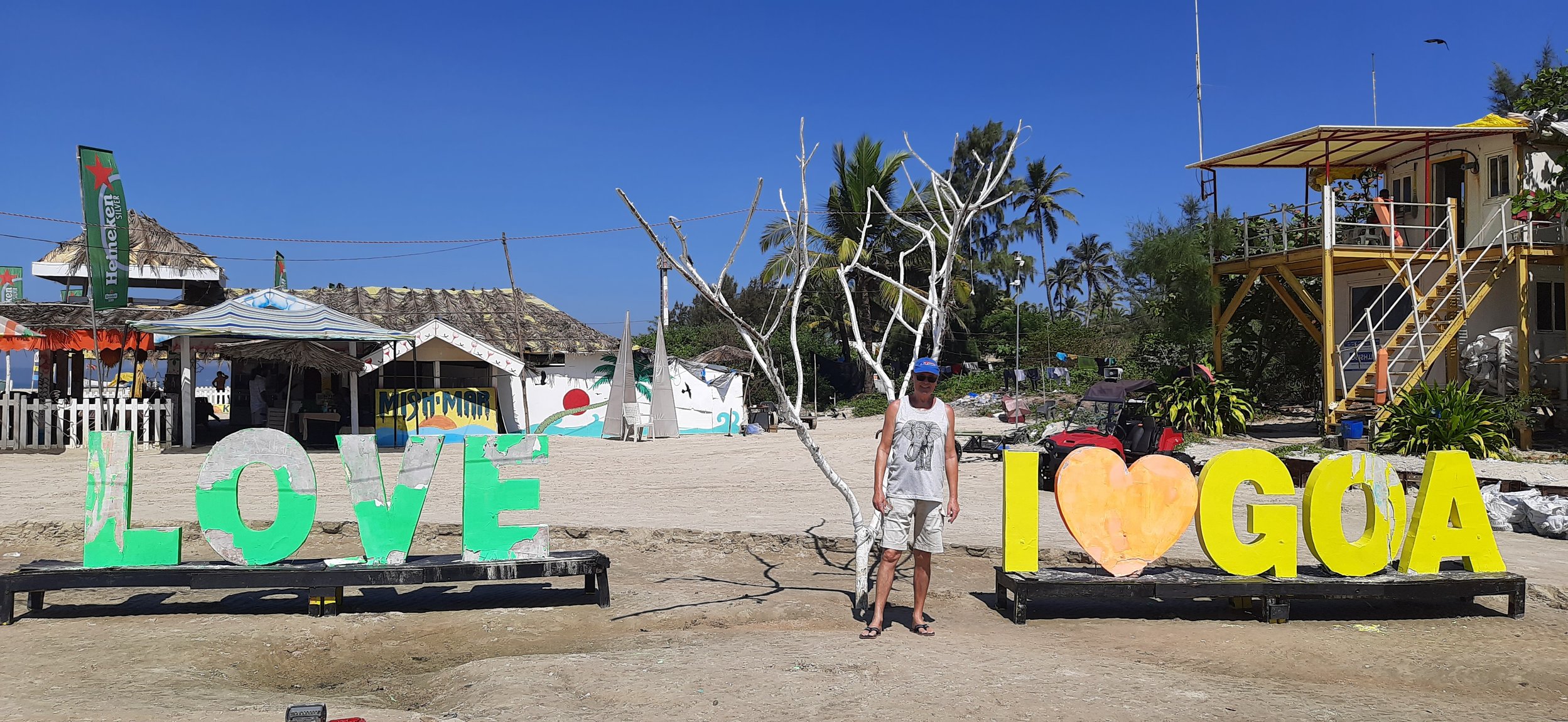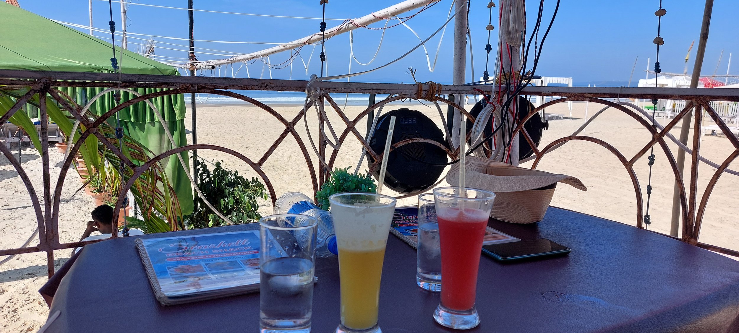 So vergehen die Tage in einer gewissen "Gleichtönigkeit". Frühstück ist meist zwischen 8:00 und 9:00 Uhr. Danach geht es ans Meer, wo wir in einem der Lokale eine Sonnenliege unterm Schattensegel nehmen. Nachdem wir zwei Tage bei Alex sind, vom Personal aber unfreundlich bedient werden und mehrfach unsere Bestellung aufgeben müssen, wechseln wir zum Four Seasons. Dort ist die Bedienung sehr aufmerksam und freundlich, das Essen zwar auch scharf, aber lecker.So reservieren wir täglich die gleichen Liegen schon für den nächsten Tag, was gut klappt.Nachdem Achim dort täglich mindestens eine Stunde im Meer schwimmt, lese ich in meinem E-Book oder verschicke per WhatsApp Nachrichten in alle Welt. WIFI funktioniert am Strand ganz toll. Zum Lunch - gegen 13 Uhr - bestellen wir meist je 1 Portion, die so ausreichend ist, dass wir beide satt sind. Danach bezahlen wir die Rechnung und machen uns auf den 3/4 stündigen Rückweg zu unserem Apartment. Zum Abendessen gehen wir fast immer ins Pentagon, dem einzigen, gut sortierten Restaurant. Der Besitzer hat vor 30 Jahren mit einem kleinen Lokal am Meer angefangen und später dieses gehobene Lokal gegründet und ausgebaut. Fast jeden Abend sind die knapp 200 Plätze ausgebucht. Obwohl wir nie reservieren, werden wir täglich als Stammgäste begrüsst und es findet sich immer ein Platz im Gartenbereich.