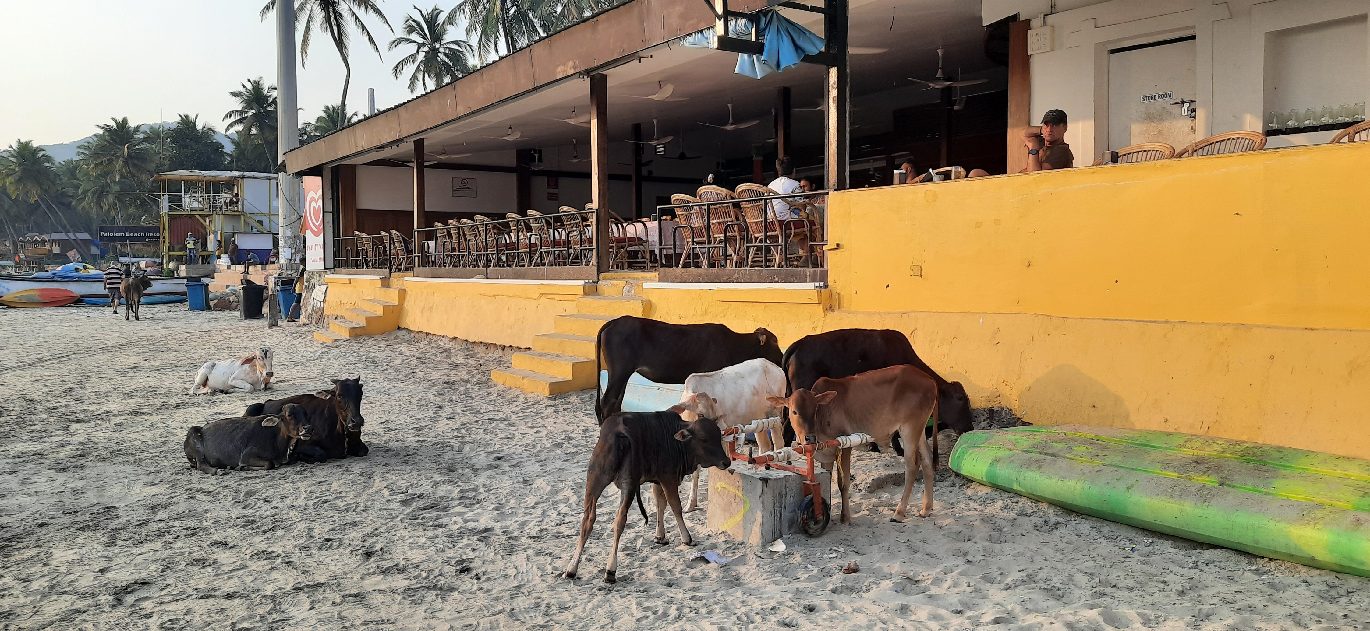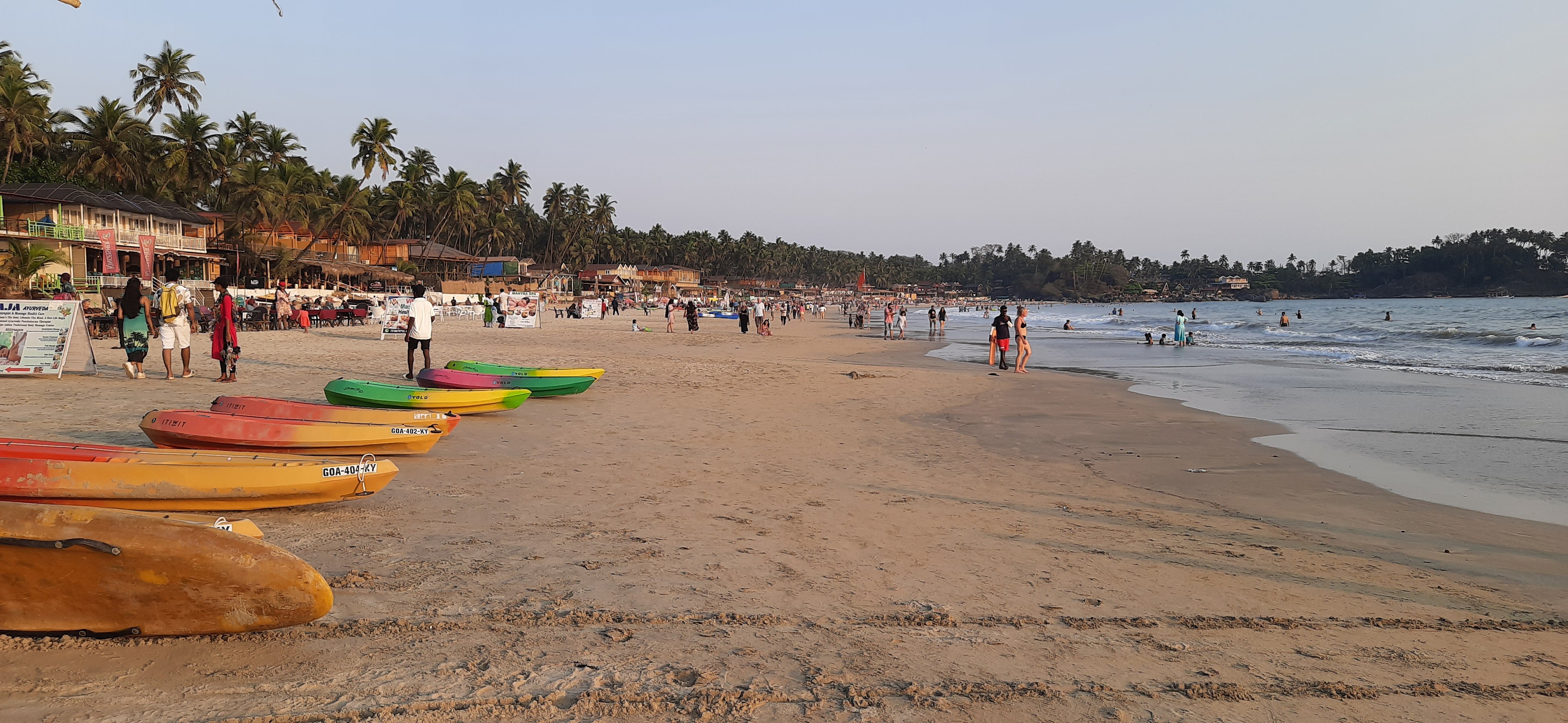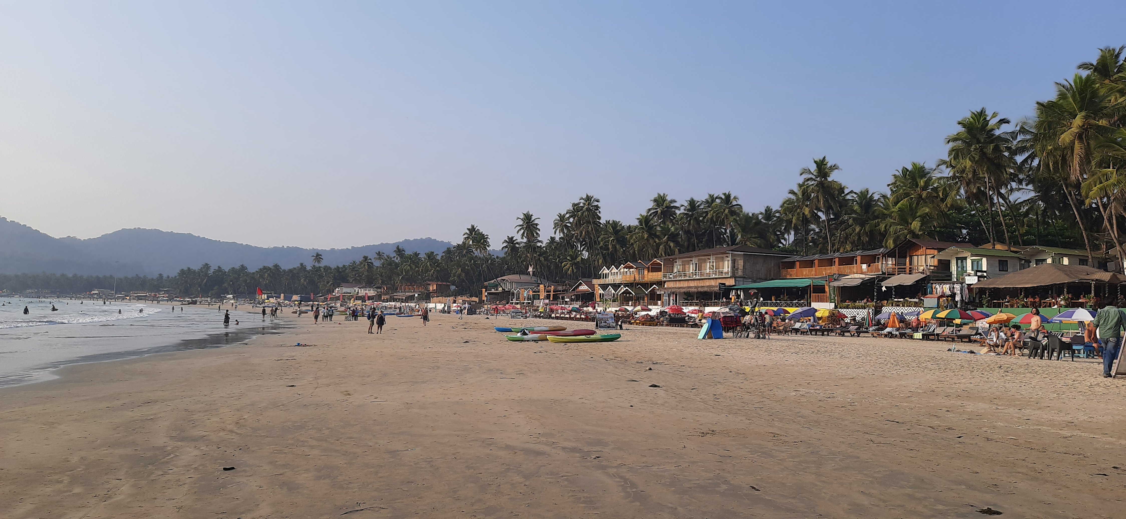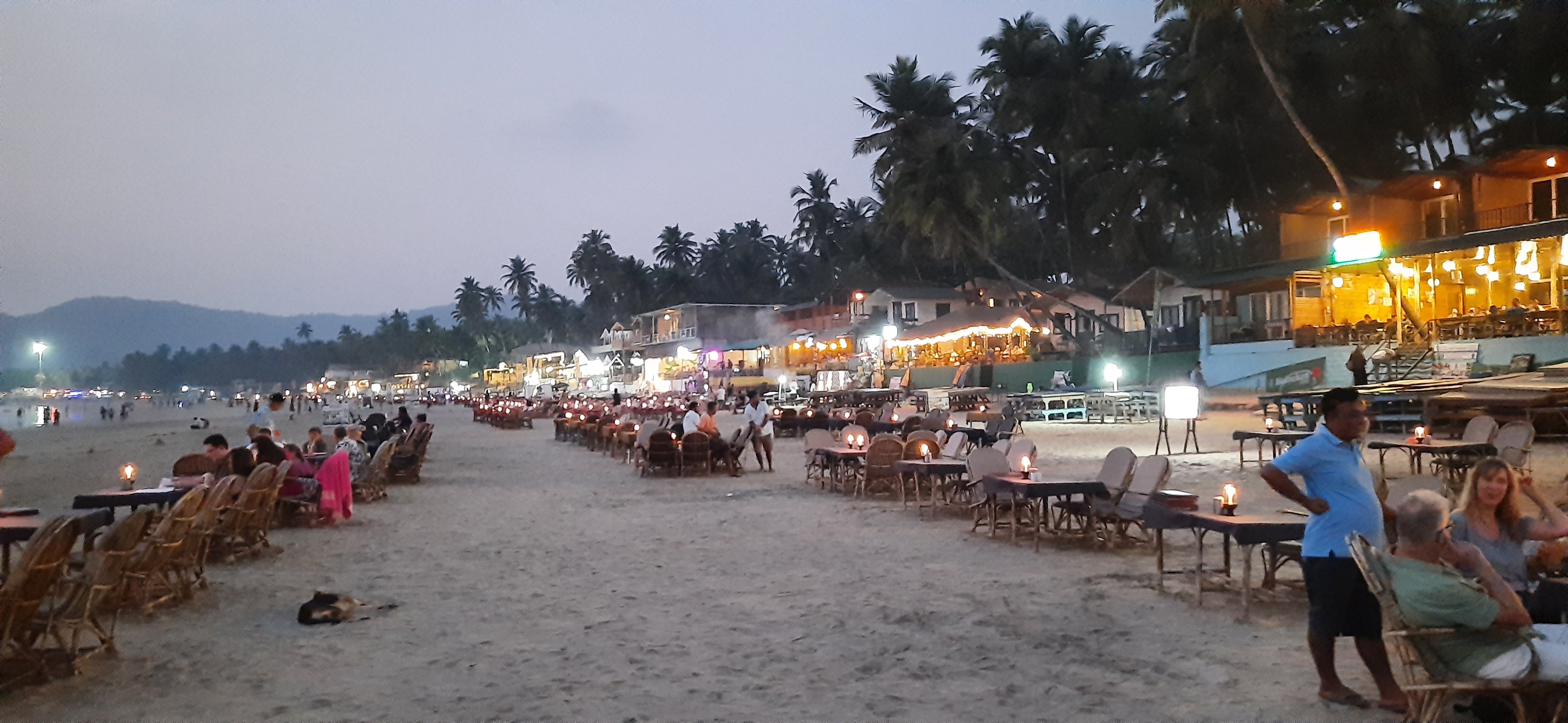 Nachdem wir einige Sachen im Regal verstaut und unsere Matratzentopper auf dem Bett aufgepustet haben, begeben wir uns auf den Weg, den Strand zu suchen. Er soll nur wenige Minuten entfernt sein. "Links, links, rechts, dann durch die Anlage durch - und ihr seid am Meer, keine 5 Minuten..." Der Weg zum Strand führt allerdings durch einige, staubige und mit Schutt verschmutzte Gassen und mündet in einer Anlage, die uns die nächsten Tage zum Frühstück und Abendessen als eine der besten Adressen auffallen soll. Und dann liegt er vor uns, der Traum unserer Sehnsüchte, wenn wir zu Hause an Goa dachten: Der Palolem Beach - bunter und voller, als 2020 erlebt und in Erinnerung behalten. Viele Anlagen haben ihr Gesicht mittlerweile völlig verändert, andere sehen aus, als wären wir gestern erst dagewesen. Wie sich tatsächlich in Gesprächen mit anderen Reiselustigen herausstellt, gibt es nur eine Anlage, die sich in den letzten Jahren kaum verändert hat und deren Besitzer noch der Gleiche geblieben ist: Das Nest. Unsere beliebteste Anlage 2020 heißt nun Coco Capana und hat mit dem ehemaligen Dreams of Palolem nichts mehr zu tun. Alle Hütten sind modernisiert und klimatisiert. Das Restaurant liegt wesendlich höher, da der Strand im Laufe der Jahre von den Wellen stark abgetragen wurde. So gehen wir die Hälfte des rund 2 km langen Strandes ab, bis wir zur "großen Straßenlampe" kommen, dem Wahrzeichen, da hier die Hauptstrasse vom Strand aus abgeht. Alles hat sich geändert, nur eines ist geblieben: Der herrliche, teilweise pudrige Sand und die Wellen, die unsere Füße umspielen. Die Temperaturen liegen, wie fast die ganzen zwei Wochen, um die 32 bis 34°C.