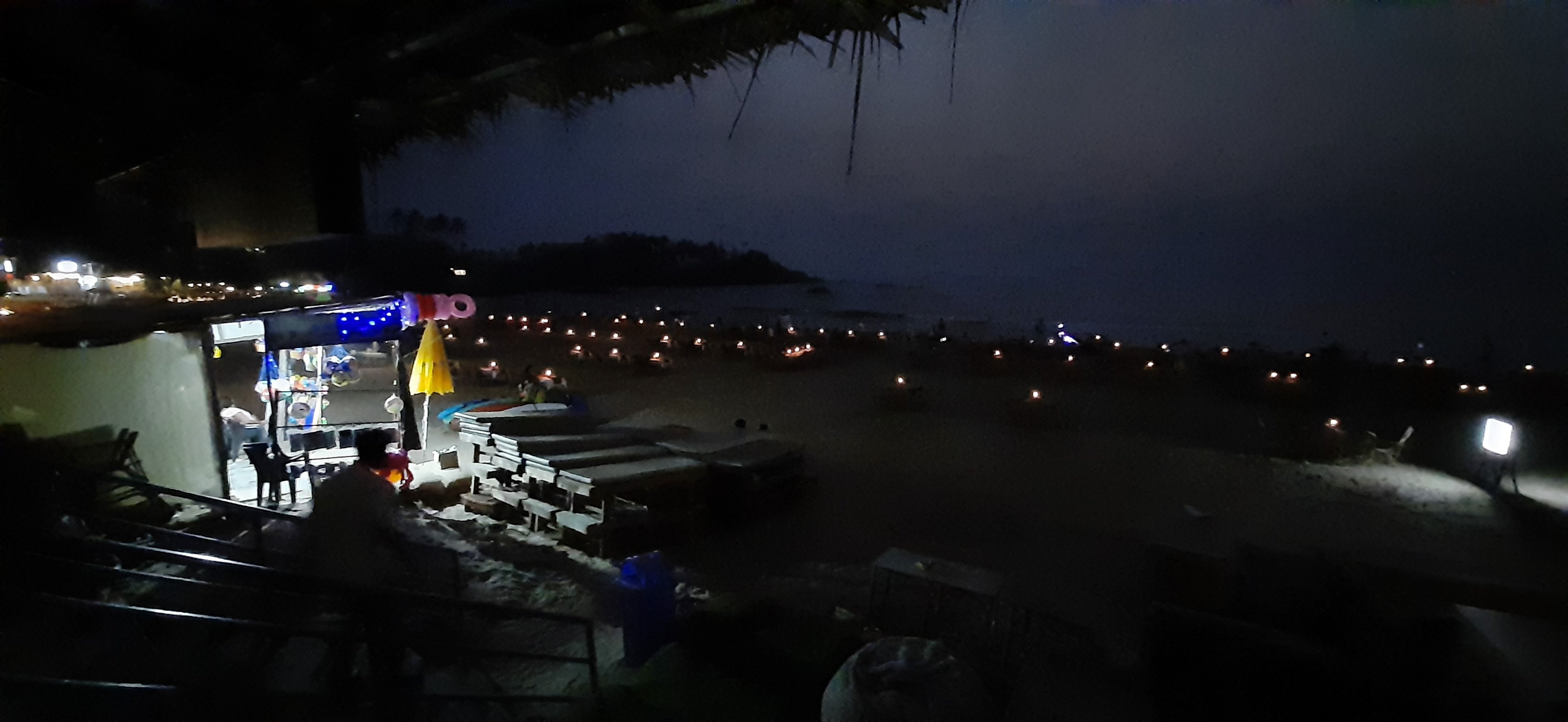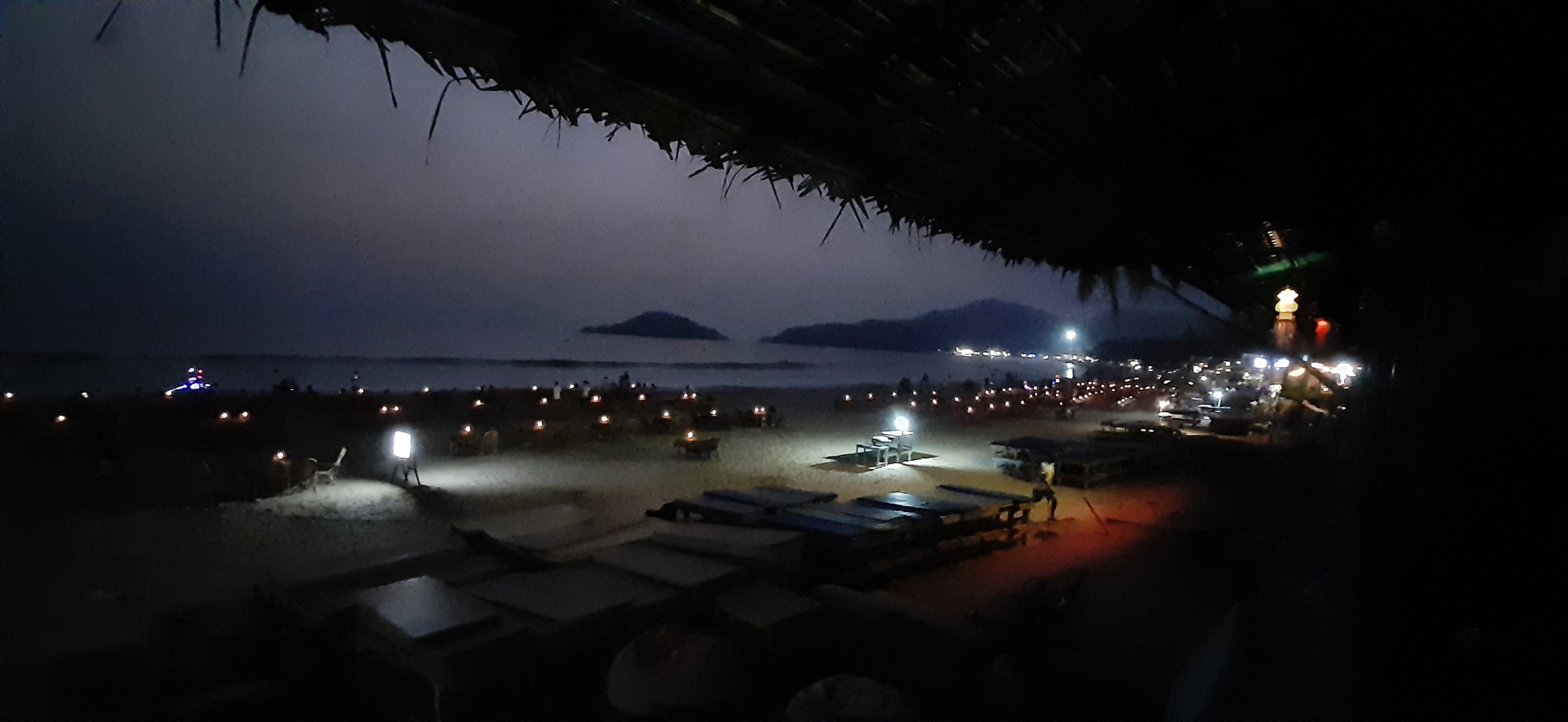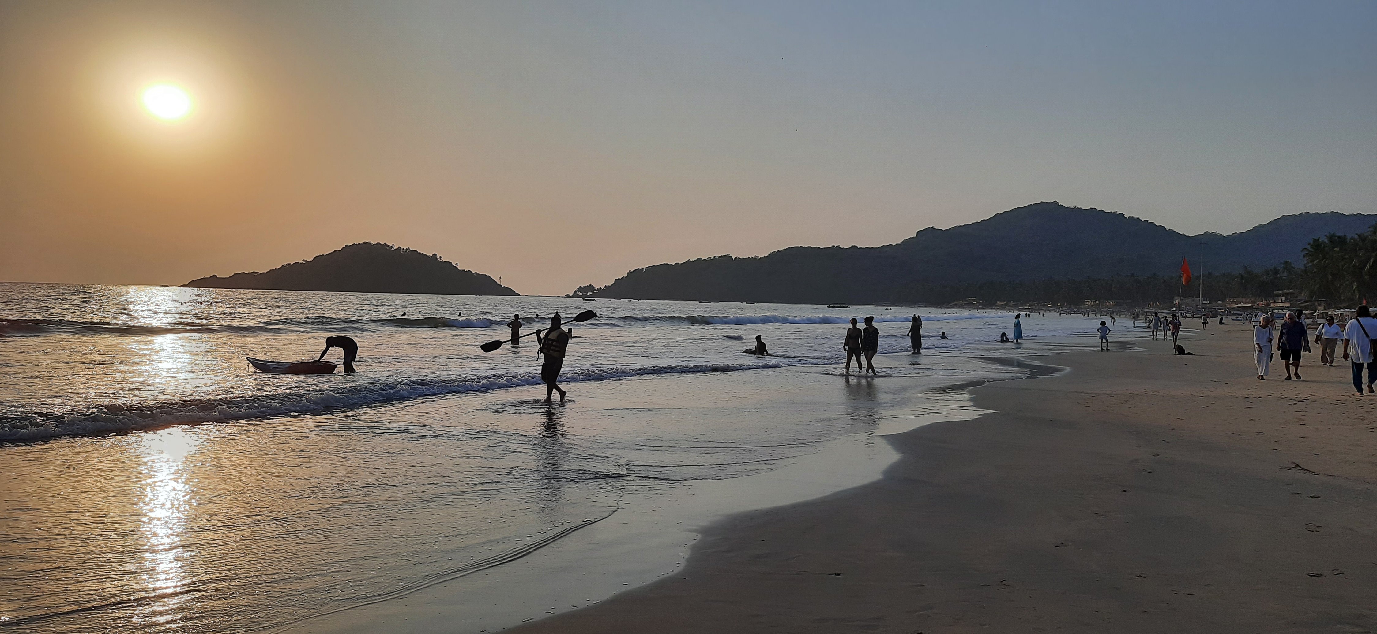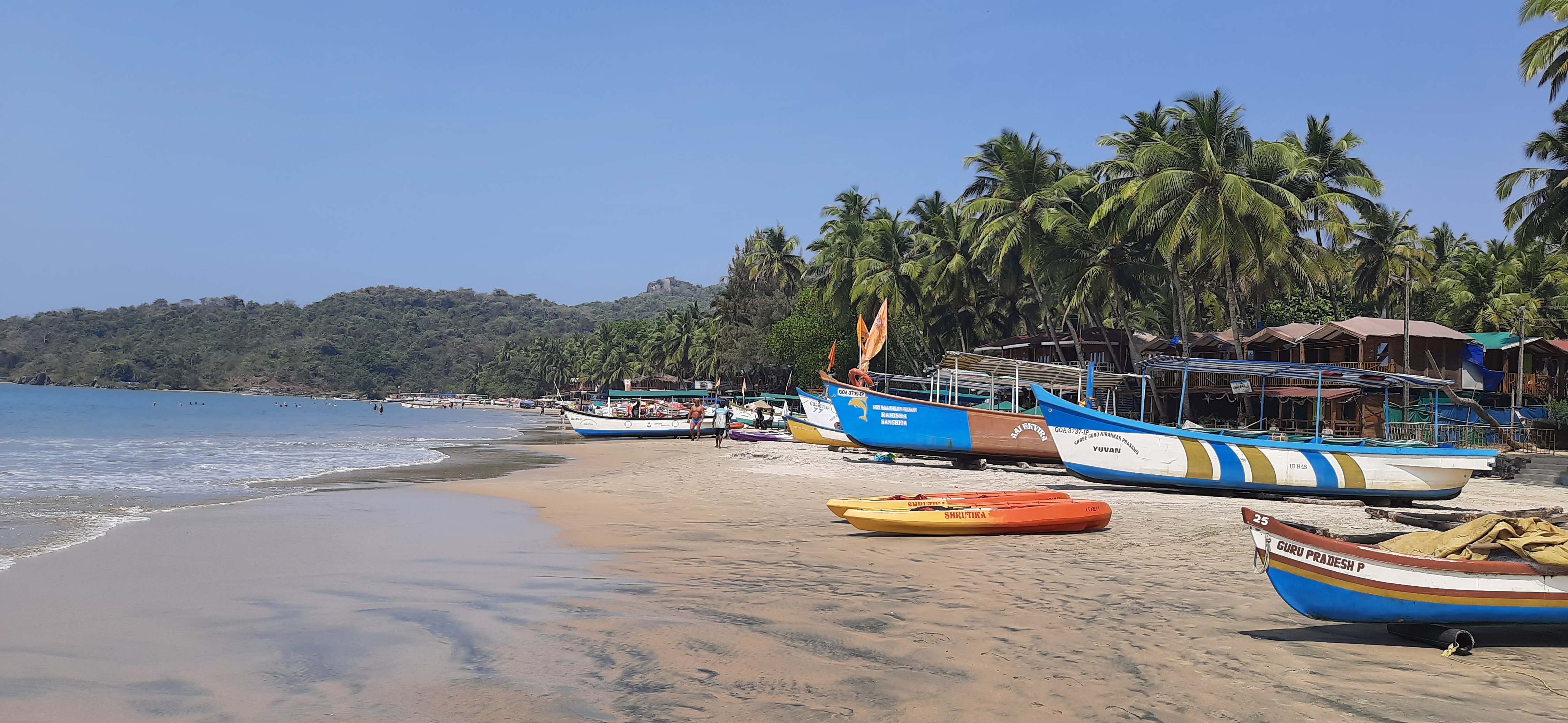Nachdem wir einige Sachen im Regal verstaut und unsere Matratzentopper auf dem Bett aufgepustet haben, begeben wir uns auf den Weg, den Strand zu suchen. Er soll nur wenige Minuten entfernt sein. "Links, links, rechts, dann durch die Anlage durch - und ihr seid am Meer, keine 5 Minuten..." Der Weg zum Strand führt allerdings durch einige, staubige und mit Schutt verschmutzte Gassen und mündet in einer Anlage, die uns die nächsten Tage zum Frühstück und Abendessen als eine der besten Adressen auffallen soll. Und dann liegt er vor uns, der Traum unserer Sehnsüchte, wenn wir zu Hause an Goa dachten: Der Palolem Beach - bunter und voller, als 2020 erlebt und in Erinnerung behalten. Viele Anlagen haben ihr Gesicht mittlerweile völlig verändert, andere sehen aus, als wären wir gestern erst dagewesen. Wie sich tatsächlich in Gesprächen mit anderen Reiselustigen herausstellt, gibt es nur eine Anlage, die sich in den letzten Jahren kaum verändert hat und deren Besitzer noch der Gleiche geblieben ist: Das Nest. Unsere beliebteste Anlage 2020 heißt nun Coco Capana und hat mit dem ehemaligen Dreams of Palolem nichts mehr zu tun. Alle Hütten sind modernisiert und klimatisiert. Das Restaurant liegt wesendlich höher, da der Strand im Laufe der Jahre von den Wellen stark abgetragen wurde. So gehen wir die Hälfte des rund 2 km langen Strandes ab, bis wir zur "großen Straßenlampe" kommen, dem Wahrzeichen, da hier die Hauptstrasse vom Strand aus abgeht. Alles hat sich geändert, nur eines ist geblieben: Der herrliche, teilweise pudrige Sand und die Wellen, die unsere Füße umspielen. Die Temperaturen liegen, wie fast die ganzen zwei Wochen, um die 32 bis 34°C.