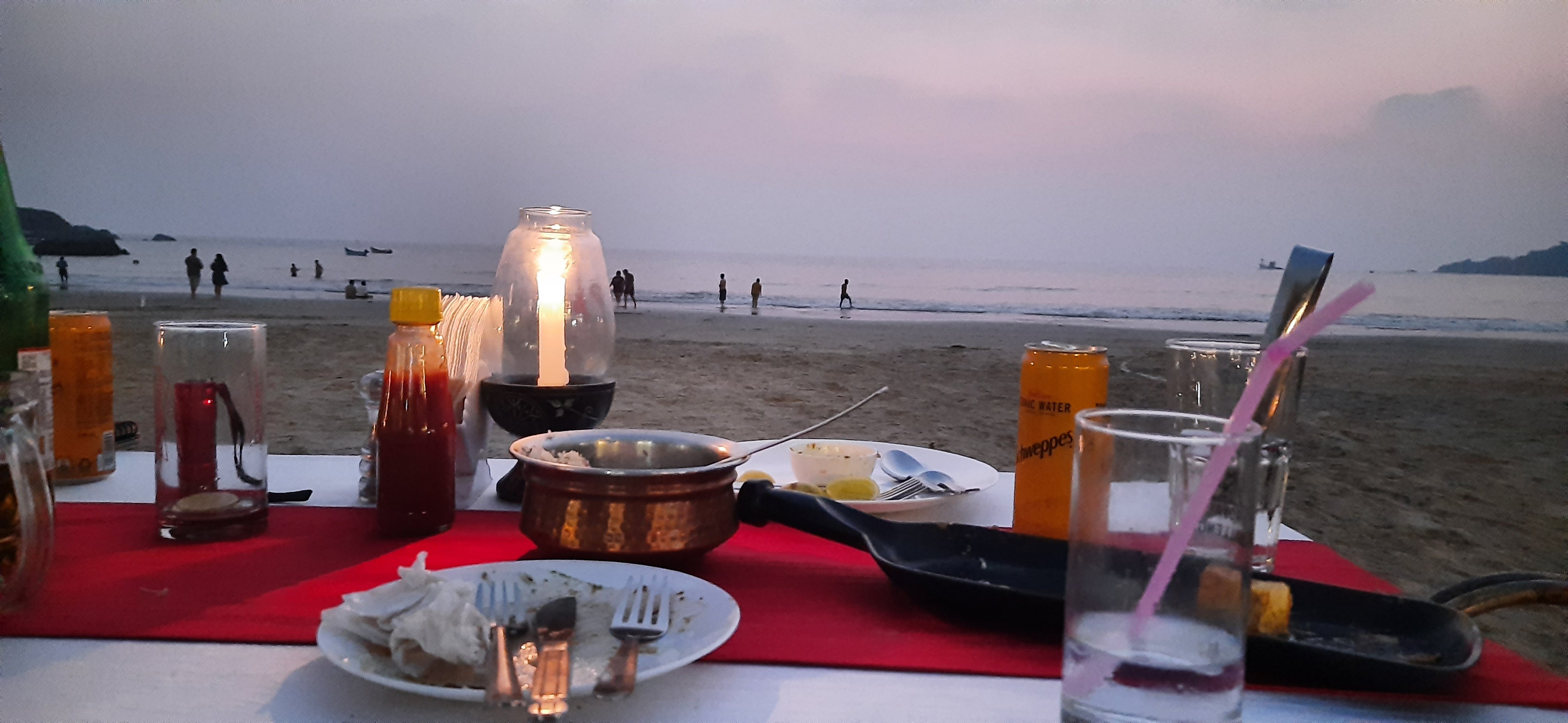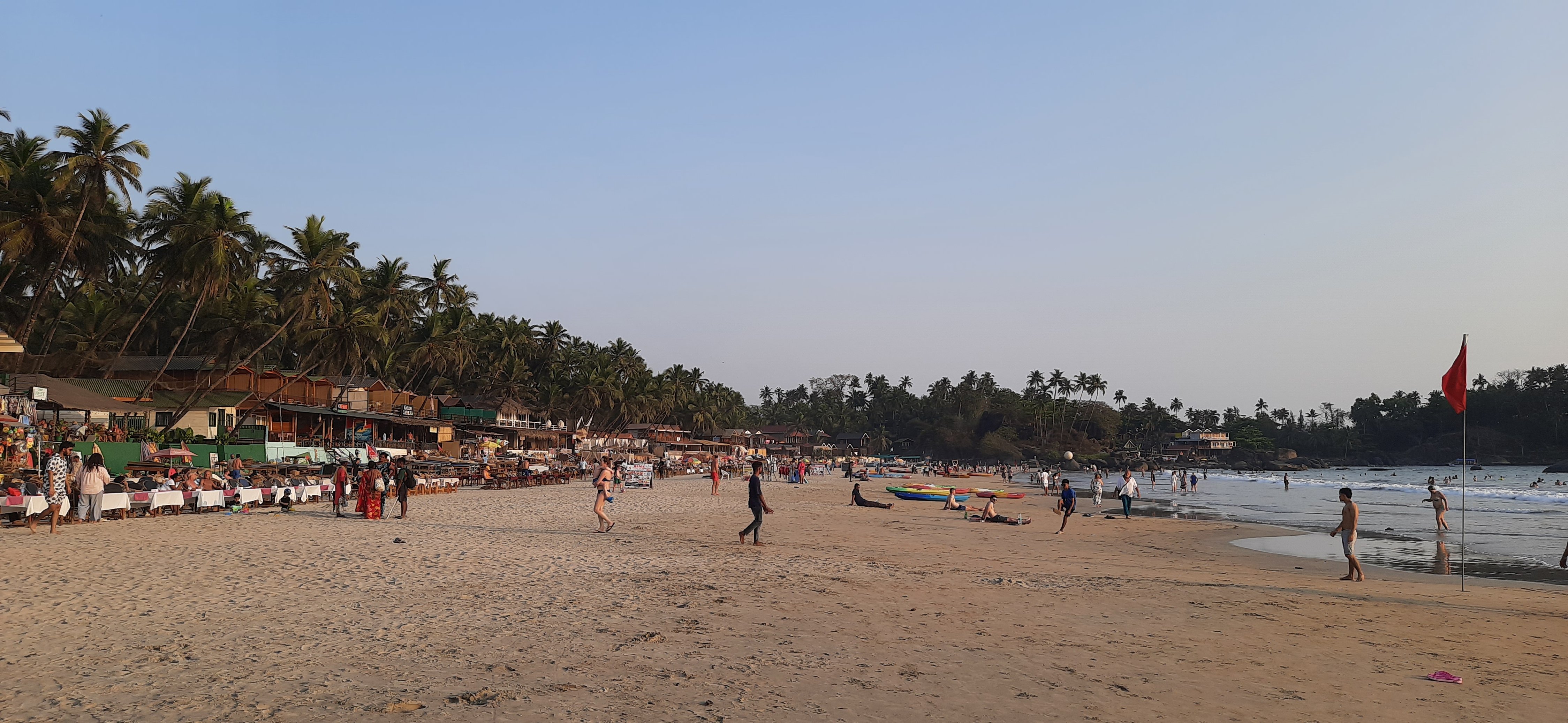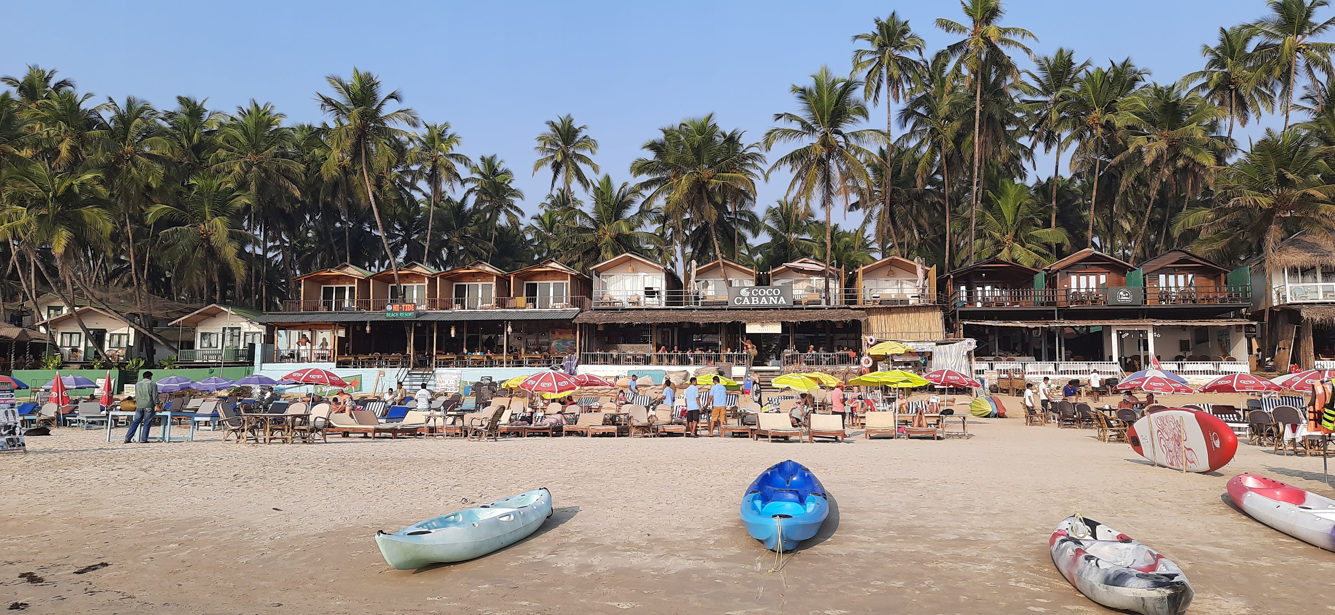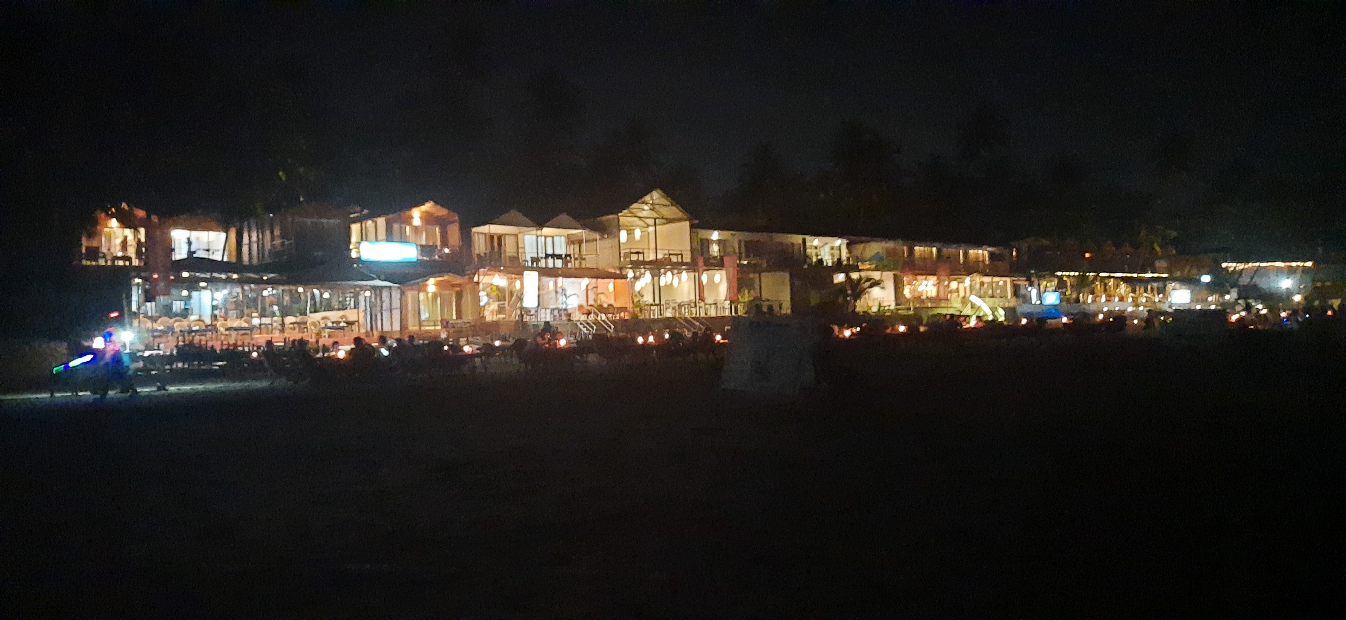 Nachdem wir einige Sachen im Regal verstaut und unsere Matratzentopper auf dem Bett aufgepustet haben, begeben wir uns auf den Weg, den Strand zu suchen. Er soll nur wenige Minuten entfernt sein. "Links, links, rechts, dann durch die Anlage durch - und ihr seid am Meer, keine 5 Minuten..." Der Weg zum Strand führt allerdings durch einige, staubige und mit Schutt verschmutzte Gassen und mündet in einer Anlage, die uns die nächsten Tage zum Frühstück und Abendessen als eine der besten Adressen auffallen soll. Und dann liegt er vor uns, der Traum unserer Sehnsüchte, wenn wir zu Hause an Goa dachten: Der Palolem Beach - bunter und voller, als 2020 erlebt und in Erinnerung behalten. Viele Anlagen haben ihr Gesicht mittlerweile völlig verändert, andere sehen aus, als wären wir gestern erst dagewesen. Wie sich tatsächlich in Gesprächen mit anderen Reiselustigen herausstellt, gibt es nur eine Anlage, die sich in den letzten Jahren kaum verändert hat und deren Besitzer noch der Gleiche geblieben ist: Das Nest. Unsere beliebteste Anlage 2020 heißt nun Coco Capana und hat mit dem ehemaligen Dreams of Palolem nichts mehr zu tun. Alle Hütten sind modernisiert und klimatisiert. Das Restaurant liegt wesendlich höher, da der Strand im Laufe der Jahre von den Wellen stark abgetragen wurde. So gehen wir die Hälfte des rund 2 km langen Strandes ab, bis wir zur "großen Straßenlampe" kommen, dem Wahrzeichen, da hier die Hauptstrasse vom Strand aus abgeht. Alles hat sich geändert, nur eines ist geblieben: Der herrliche, teilweise pudrige Sand und die Wellen, die unsere Füße umspielen. Die Temperaturen liegen, wie fast die ganzen zwei Wochen, um die 32 bis 34°C.