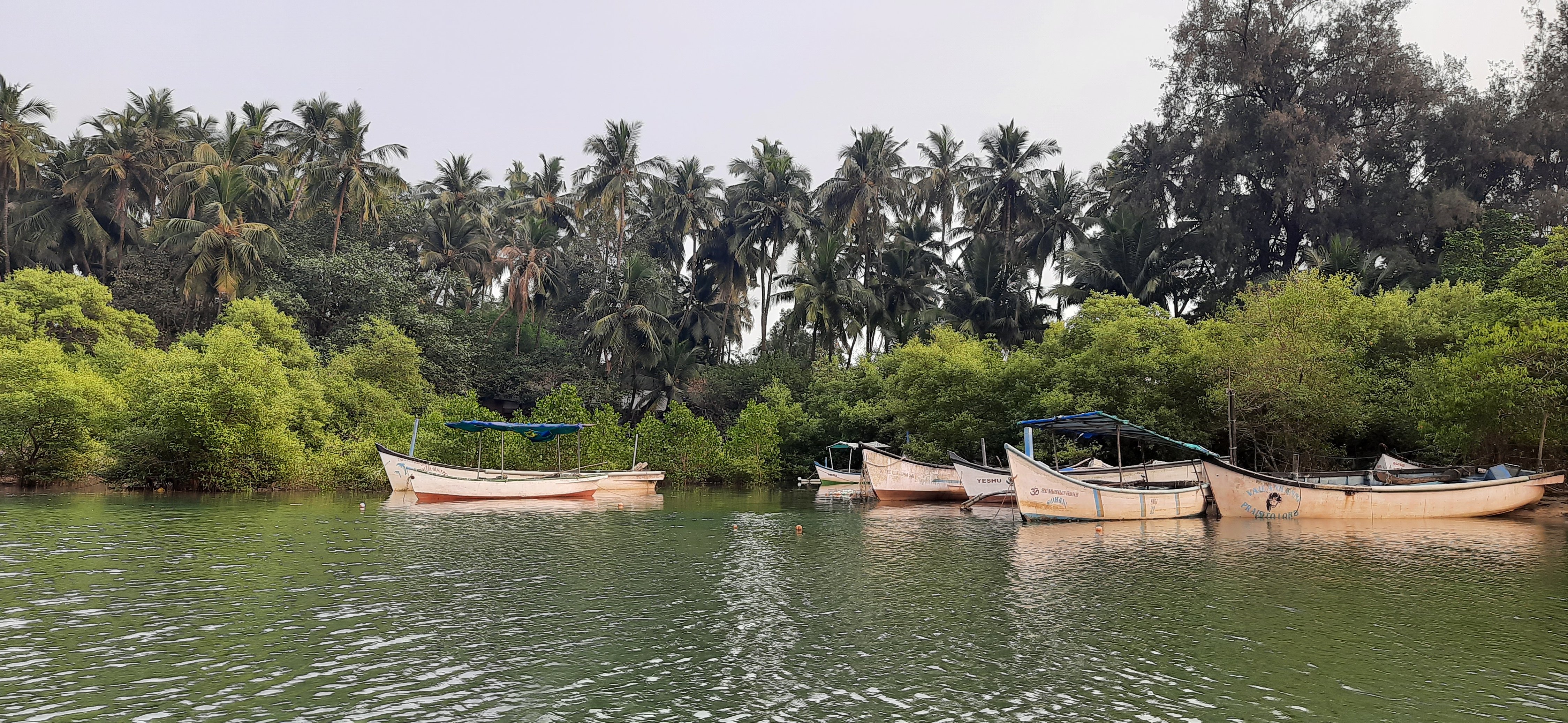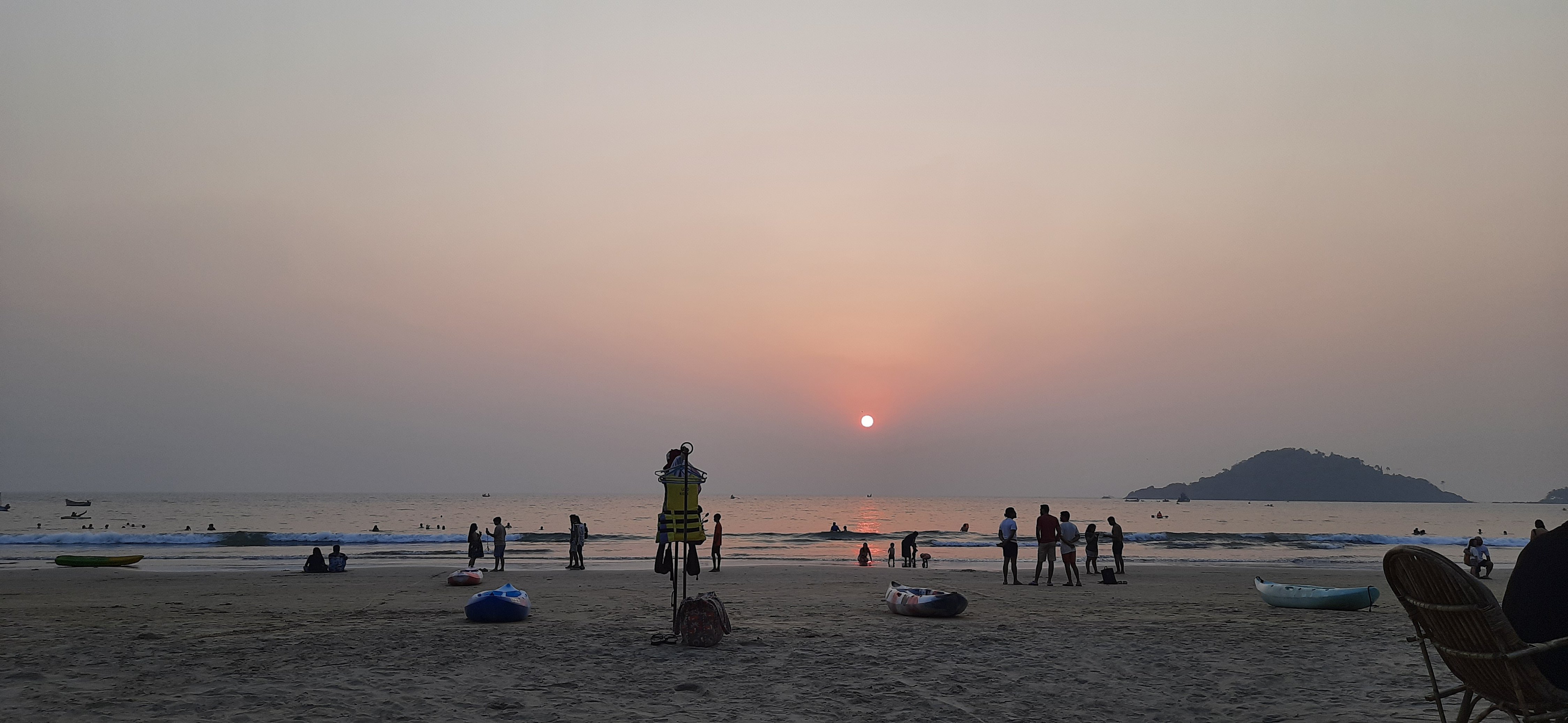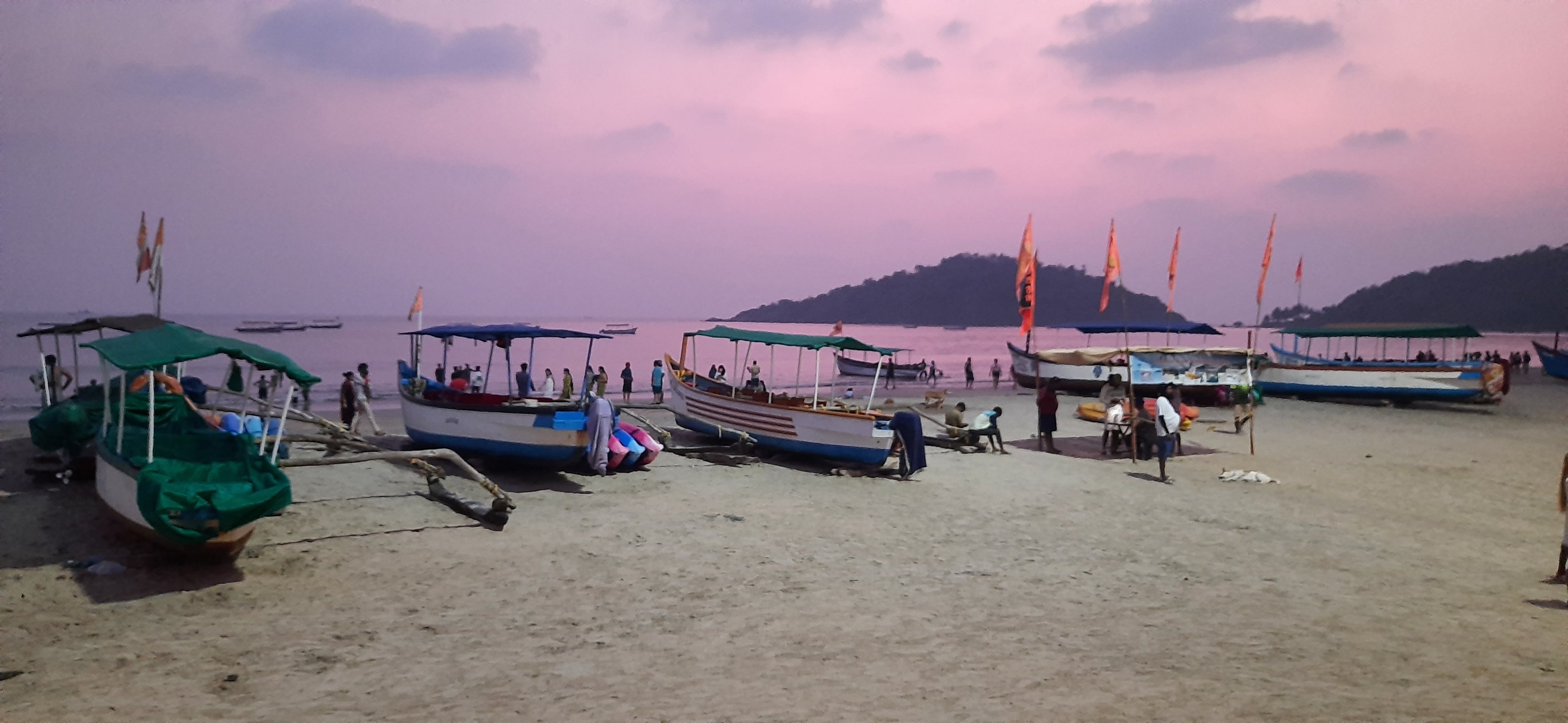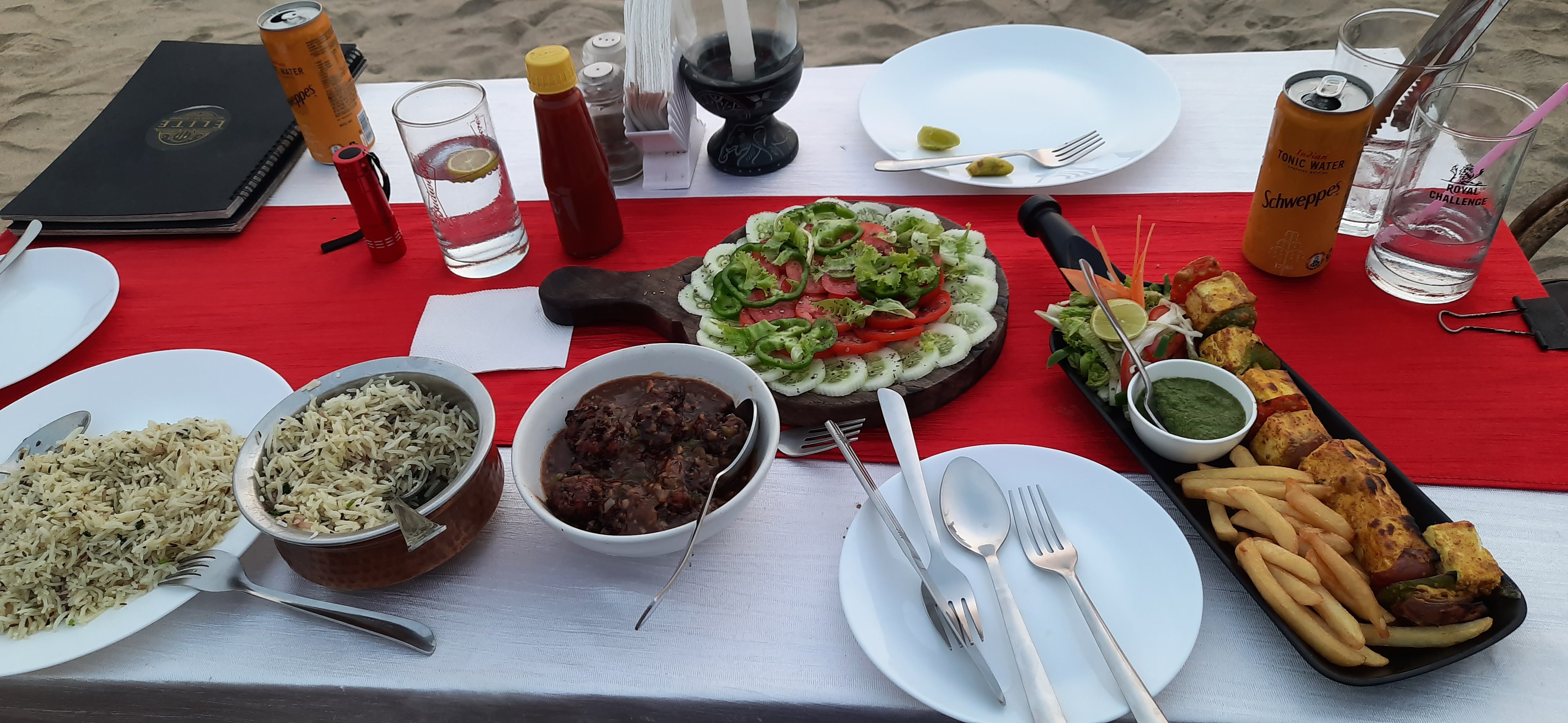 Nachdem wir einige Sachen im Regal verstaut und unsere Matratzentopper auf dem Bett aufgepustet haben, begeben wir uns auf den Weg, den Strand zu suchen. Er soll nur wenige Minuten entfernt sein. "Links, links, rechts, dann durch die Anlage durch - und ihr seid am Meer, keine 5 Minuten..." Der Weg zum Strand führt allerdings durch einige, staubige und mit Schutt verschmutzte Gassen und mündet in einer Anlage, die uns die nächsten Tage zum Frühstück und Abendessen als eine der besten Adressen auffallen soll. Und dann liegt er vor uns, der Traum unserer Sehnsüchte, wenn wir zu Hause an Goa dachten: Der Palolem Beach - bunter und voller, als 2020 erlebt und in Erinnerung behalten. Viele Anlagen haben ihr Gesicht mittlerweile völlig verändert, andere sehen aus, als wären wir gestern erst dagewesen. Wie sich tatsächlich in Gesprächen mit anderen Reiselustigen herausstellt, gibt es nur eine Anlage, die sich in den letzten Jahren kaum verändert hat und deren Besitzer noch der Gleiche geblieben ist: Das Nest. Unsere beliebteste Anlage 2020 heißt nun Coco Capana und hat mit dem ehemaligen Dreams of Palolem nichts mehr zu tun. Alle Hütten sind modernisiert und klimatisiert. Das Restaurant liegt wesendlich höher, da der Strand im Laufe der Jahre von den Wellen stark abgetragen wurde. So gehen wir die Hälfte des rund 2 km langen Strandes ab, bis wir zur "großen Straßenlampe" kommen, dem Wahrzeichen, da hier die Hauptstrasse vom Strand aus abgeht. Alles hat sich geändert, nur eines ist geblieben: Der herrliche, teilweise pudrige Sand und die Wellen, die unsere Füße umspielen. Die Temperaturen liegen, wie fast die ganzen zwei Wochen, um die 32 bis 34°C.