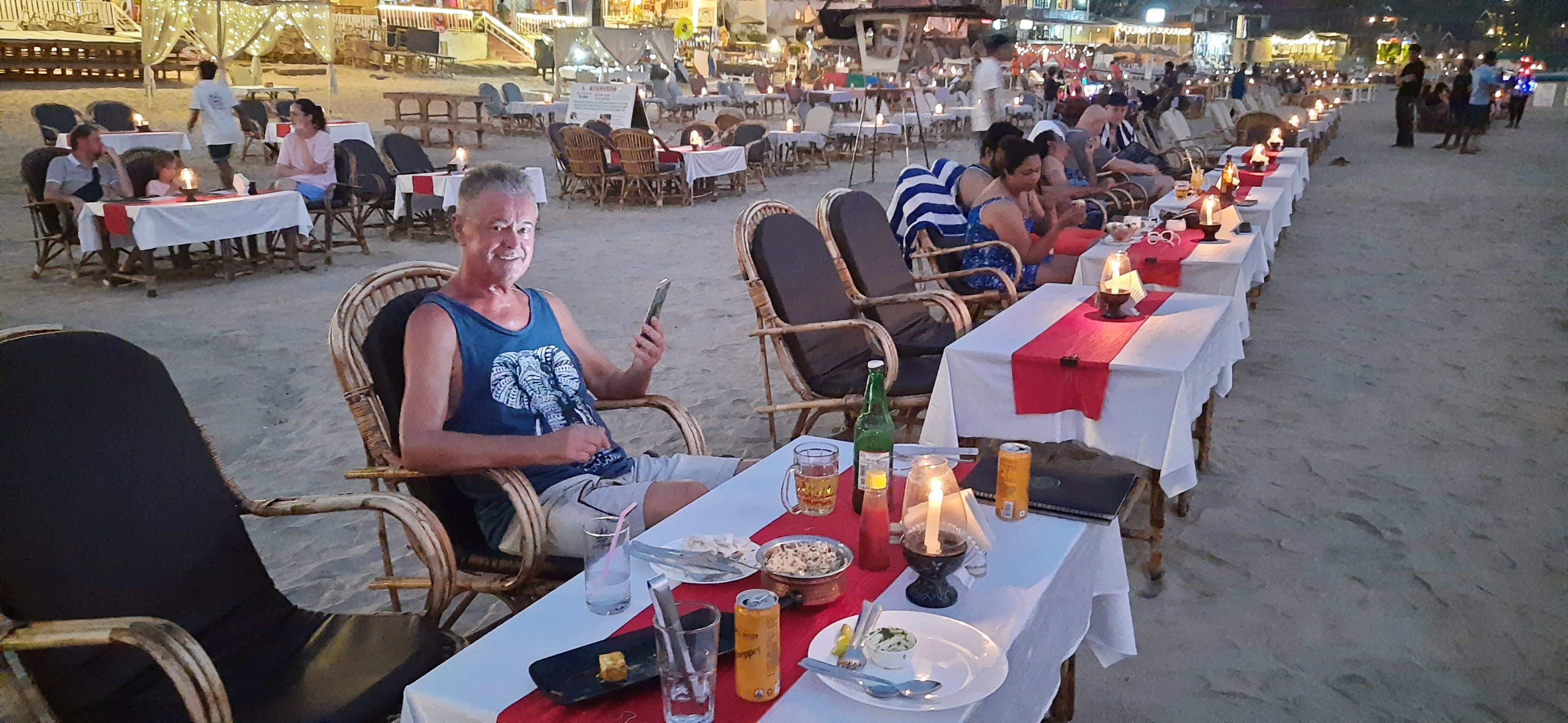 Die Abendmahlzeiten, direkt am Meer, vor uns die Wellen, die Füße im Sand - wie eine Märchenlandschaft, wenn wir in dieser Kulisse jeweile den Sonnenuntergang verfolgen können. Bei einsetzender Dunkelheit werden die Kerzen auf den Tischen angezündet. Am Strand entlang flackern dann hunderte von Kerzen und versetzen den Strand in einen unendlichen Speisesaal. Leider sind an manchen Abenden nur ein kleiner Teil der Tische belegt. Ein Lokal versucht dem nächsten die Kundschaft abspenstig zu machen. So gehen auch wir nur immer in die gleichen zwei bis drei Lokale, dessen Speisekarten wir kennen und wissen, dass es uns schmeckt. Das Personal vom Coco Cabana und Luna Lussa begrüssen uns immer wie alte Stammkunden, egal, ob wir zum Frühstück oder Abendessen kommen. Mittagessen fällt ohnedies aus, da wir immer nur etwas Obst oder Kekse essen. Schwierig wird es am Abend, wenn während des Abendessens plötzlich abertausende von fliegenden Ameisen über uns herfallen, angelockt vom Kerzenschein und den Lampen in den Lokalen. Zusammen helfen Kundschaft und Personal schnell, um ins Innere des Lokals zu kommen, wo sofort alle Lampen ausgemacht werden. Nach wenigen Minuten ist der Spuck vorbei.