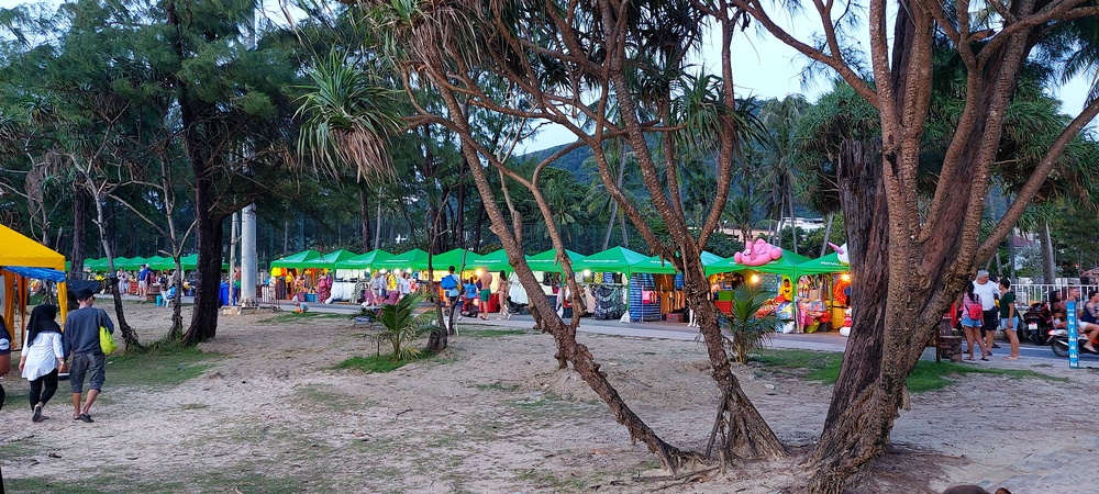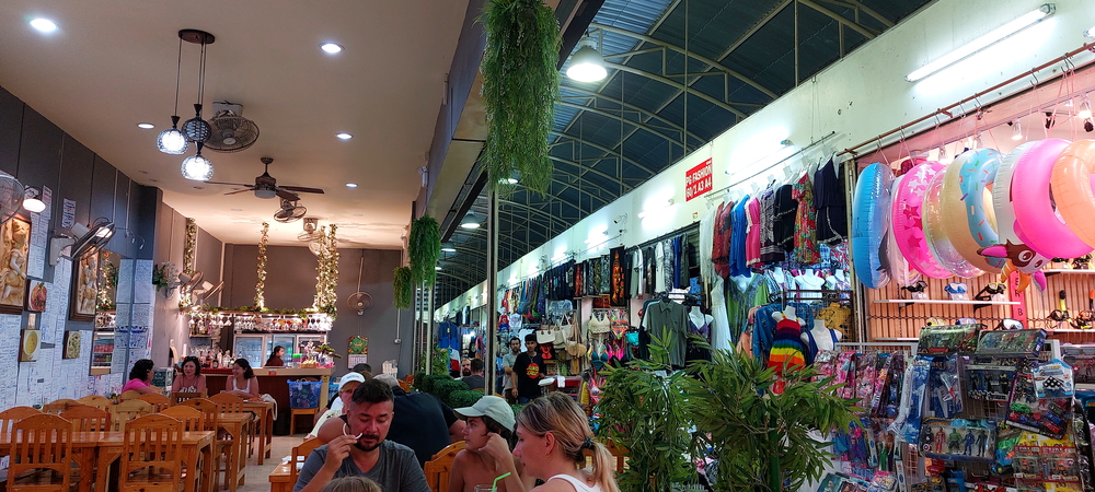 Das Taxi ist pünktlich da. Wir haben ein geschlossenes Auto, da es jederzeit regnen könnte. Der Fahrer lässt uns am Kata Palm aussteigen. Der Chef im Coconut freut sich, uns zu sehen. Er gibt unseren bestellten Fisch direkt in die Küche, da wir noch etwas die Straße auf und ab flanieren wollen. Es ist noch lebhafter als zu unserer Zeit. Als wir zurückkommen, gehen wir durch die Markthalle. Achim findet für knapp 6 € ein Leinen Shirt. Im Coconut bekommen wir den letzten freien Tisch. Wir bestellen die Beilagen zum Fisch, die auch bald geliefert werden. Achim nimmt zur Vorspeise einen Teller Salat vom kostenlosen Buffet. Irgendwann fragen wir nach dem bestellten Fisch. Keiner weiß, wo er abgeblieben ist. So wird eben kurzerhand ein anderer in die Küche gegeben. Was dann kommt, ist allerdings recht geschmacksneutral und viel zu weich gekocht. Nun denn, auch hier kann mal etwas schief laufen. Danach gehen wir zum Italienischen Restaurant und verabschieden uns von Rita und Helmut aus der Schweiz, die morgen auch nach Hause fliegen. Sie essen ein Pfeffersteak mit Pommes und sind von der tollen Qualität begeistert.