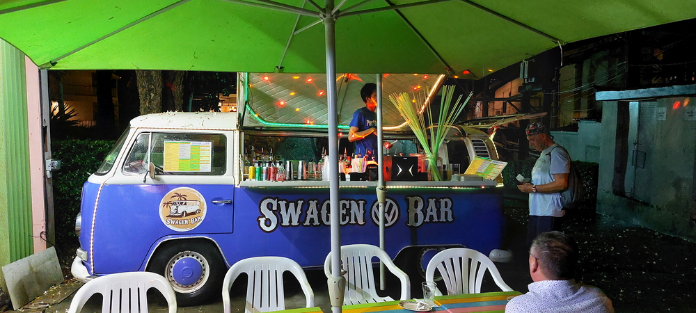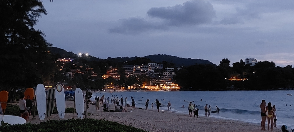 Da wir schon in die Richtung gehen, beschließen wir am SWagen noch einen Cocktail zu trinken. Die Bedienung strahlt, als sie uns wiedererkennt. Die Tische sind fast belegt. Es bieten sich aber noch zwei Stühle an, die direkt neben einem Finnen stehen. Die Musik ist laut, überdeckt jedoch das Geschreie am Nebentisch. Dort gab es schon mehrere Eimer und die nächste Runde wird serviert. Wir stoßen auf Janine, Achims Schwester, an, die heute Geburtstag hat und auf Silke, die gestern 50 wurde. Ein extra Prost lassen wir auf die Freunde folgen, die wir hier in Kata kennengelernt haben: Kim und Anja und Nicole und Mike. Nach zwei Bechern machen wir uns auf, ein Taxi zu suchen. Beim Kata Palm ist bereits Feierabend. Am folgenden Taxistand finden wir ein Tuk-Tuk, dessen Fahrer bereit ist, uns für 400 THB nach Ao Chalong Vila zu fahren. Bei der wechselnden Innenbeleuchtung denken wir an Anja und Kim, die bei lauter Musik an jenem Abend noch nach Pattong gefahren sind. „Bitte keine Musik…“, erinnere ich den Fahrer. Ich denke, er ist froh, dass wir uns mit Lichteffekten zufriedengeben. Er gibt Gas und überholt so manches Auto. Kurz nach 21 Uhr sind wir im Hotel.