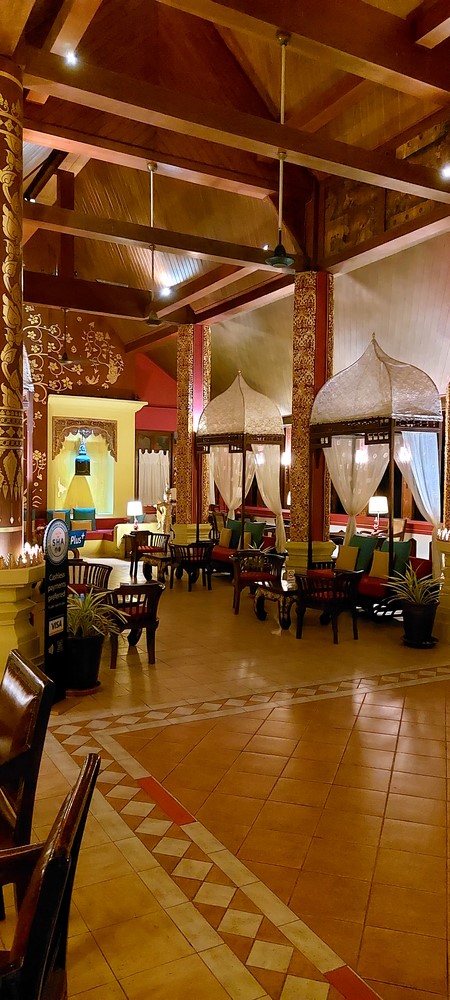 Vor dem Hotel ist festlicher Rummel. Heute gibt es im Abendlokal ein Buffet, bereits seit Tagen im Frühstückssaal per Plakat groß beworben. 400 THB (rund 11 €) ist ein annehmbarer Preis. Trotzdem sind nur wenige Tische belegt und die Live Musik spielt vor leeren Rängen. Kein Wunder, bei der schlechten Küche!