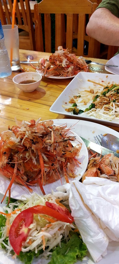 Für den Abend verabreden wir uns mit Kim und Anja, die morgen auch abreisen auf einen Cocktail. Vorher gehe ich mit Achim ins Coconut. Nach den Hungertagen habe ich Appetit auf leckere Garnelen. So bestellen wir 1 Kg gegrillte Garnelen mit deftiger Knoblauchsoße, Pommes und Pad Thai. Köstlich! Ob sie mir bekommen, wird sich dann zeigen. Während wir essen öffnet der Himmel seine Schleusen. Beim Verabschieden legen die Bedienungen die Hände vor dem Gesicht zusammen und verneigen sich. Sie bedauern unsere Abreise und geben der Hoffnung Ausdruck, uns irgendwann mal wieder zu sehen. Wer weiß, Ao Chalong ist nur knapp 20 Minuten entfernt.