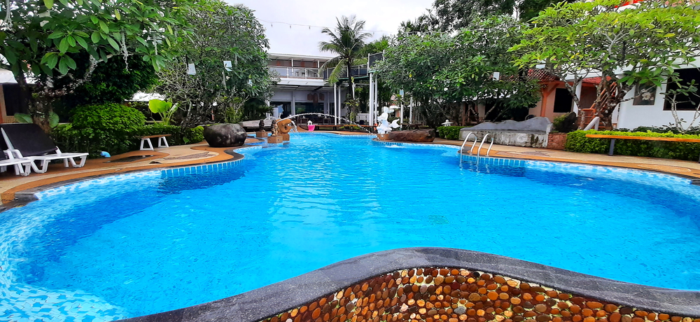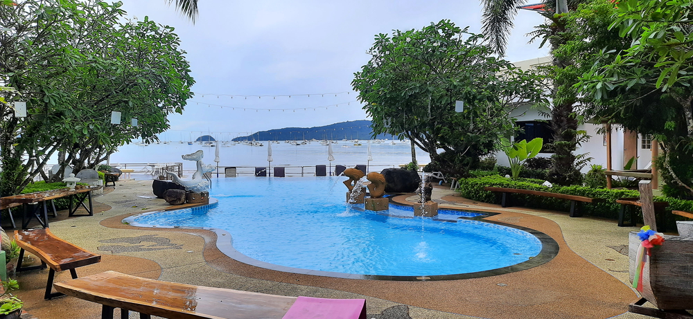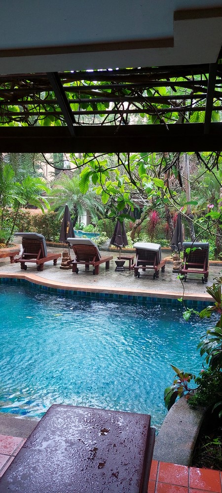 Für uns ist nun ein kleines, dunkles Zimmer im 1. Stock reserviert, welches genau zwischen Restaurant und Rezeption liegt. Unten liegt ein Seerosen Teich, in welchem selbst tagsüber die Frösche wie bekloppt quaken. Achim geht mit dem jungen Mann zurück an die Rezeption und verhandelt mit der „Chef Rezeptionistin“. Sie kommt und zeigt uns ein anderes Zimmer. Riesig groß, ein Doppelbett in dem selbst vier Leute Platz hätten, eine extra Toilette, eine Dusche und ein kleiner Waschraum. Mehrere Regale, Schrank und ein Sofa. Aus dieser Klitsche hätte man zwei Zimmer machen können. Am Ende des Raumes ist eine doppelte Glastür, die ins Büro des Mangers führt. Ein einfacher Vorhang ist hinter der Tür zugezogen. „Da kann ja jeder reinschauen…“ „Nein, das ist das Büro des Managers – und der ist in Australien und kommt frühestens in zwei Wochen zurück.“ Sie greift zu ihrem Handy und spricht kurz mit irgendjemandem. „Ja, der Manager ist in den nächsten zwei Wochen weg…“ Solch ein riesiges Zimmer für 420 €, für zwei Wochen. Und das auch noch inklusive Frühstück. Wir sagen natürlich zu. Zunächst gehen wir ins Restaurant und bestellen uns ein kleines Mittagessen. Auch hier ist alles komplett neu. Das frühere Flair ist weg. Ich denke, wir müssen innerlich loslassen und uns zunächst an das neue Flair gewöhnen. Natürlich ist vom alten Personal, außer dem australischen Manager, niemand mehr da. Und das merkt man: Diese Anlage steht unter ausländischer Führung. Alles ist sauber und ordentlich. Auch der Koch versteht sein Handwerk und liefert geschmacklich sehr gute Arbeit. Nach dem Essen, preislich etwas teurer als in Kata, packen wir die Koffer aus und verteilen alles in den Schränken und Regalen. Für den Safe brauchen wir allerdings Hilfe, da er nach dem 3. Versuch Alarm gibt. Wo ist nur der verflixte Reset Knopf??? Kurz danach kommt einer aus der Verwaltung und erklärt uns das „System“. Schnell sind alle Wertsachen im Safe verstaut und wir können die ersten Runden im Gartenpool drehen. Das Wasser ist (für mich) erstaunlich kühl. Achim ist mit einem Sprung drin. Der Himmel ist ziemlich bewölkt und verspricht, bald wieder beglückendes Nass zu spenden. Bis dahin sind wir aber wieder auf dem Zimmer.