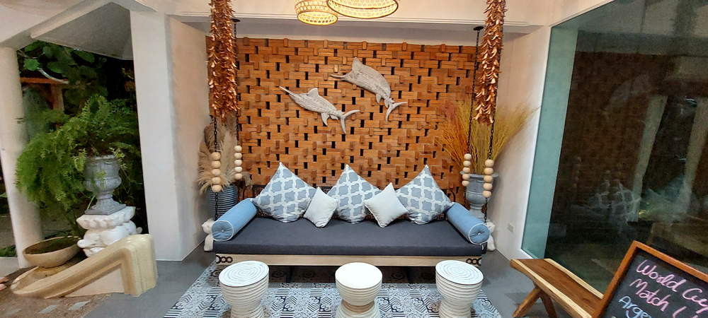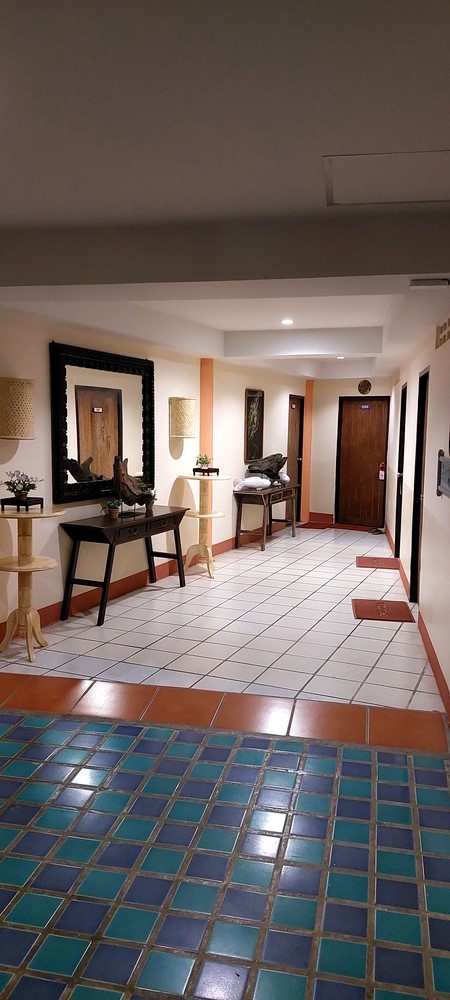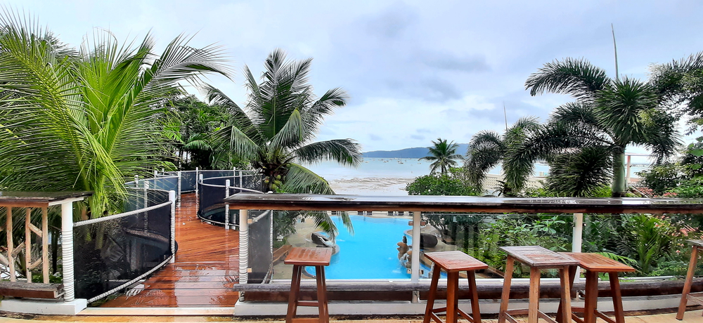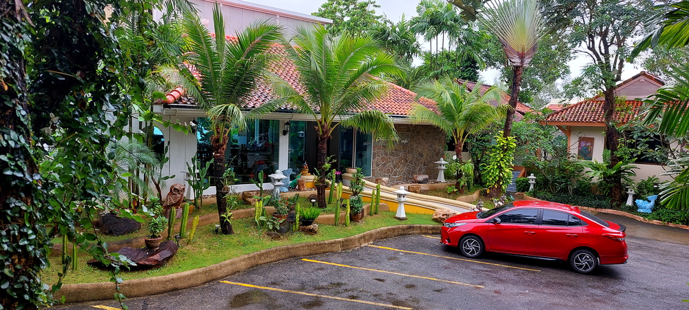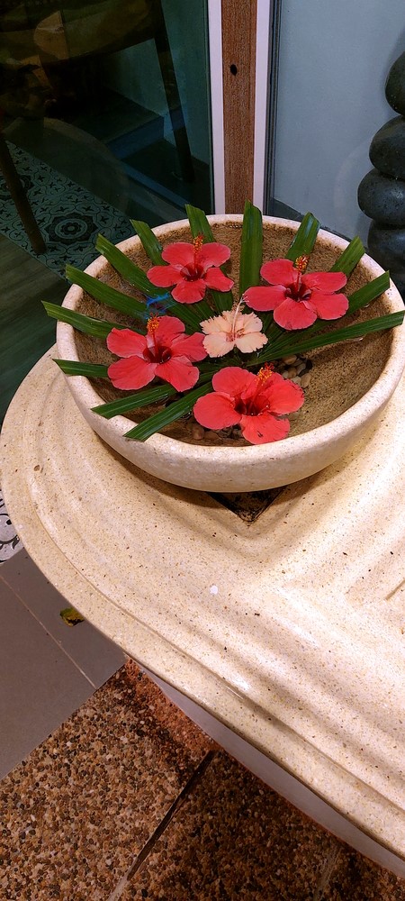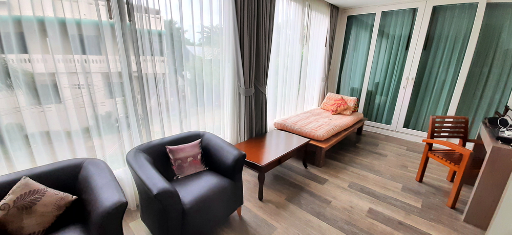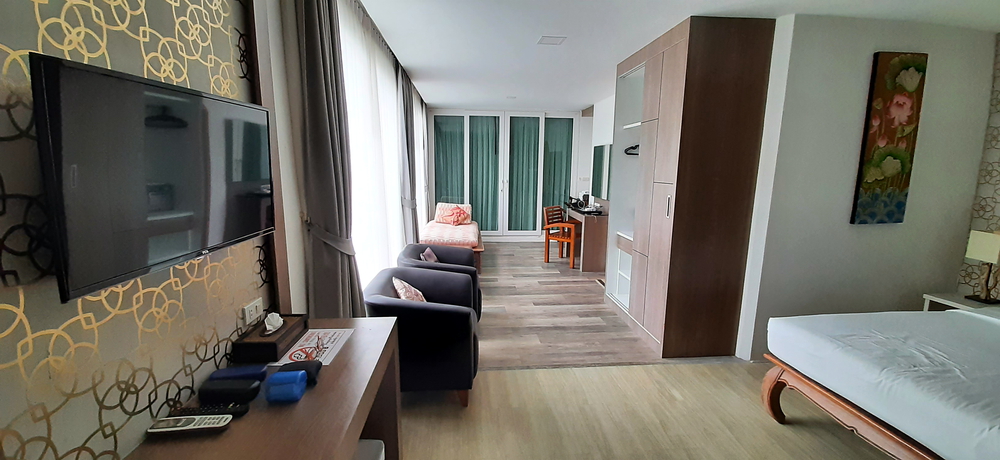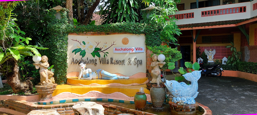 Der andere Wagen kommt schließlich und braucht Hilfe, um unsere schweren Koffer ins Auto zu hieven. Er programmiert sein Navi und wir erreichen schon nach 20 Minuten das Ao Chalong Villa.. Eingangsbereich und Rezeption sehen noch so aus, wie wir es vor 5 Jahren erlebt haben. Der Gartenpool ist jetzt mit einer Brücke versehen. Die Zimmer sind alle neugestaltet und komplett umgebaut. Unser reserviertes Zimmer im 3. Stock gibt es nicht mehr, da die ganze Etage zu Familienzimmern umgebaut wird. Die Zeit von Corona wurde hier genutzt, um für die Tage danach gerüstet zu sein.