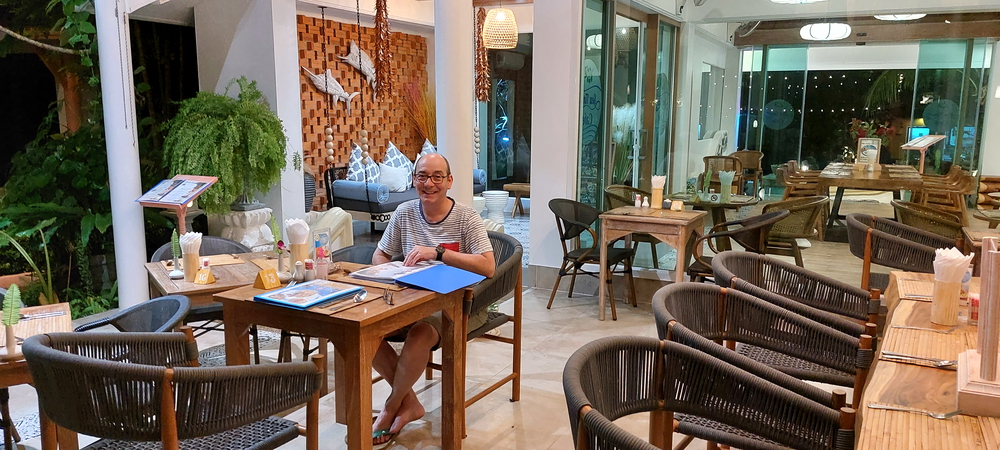 Gegen 19 Uhr gehen wir ins Restaurant. Achim möchte heute seine grüne Kreditkarte mal ausprobieren. Der Einsatz kostet viel weniger Gebühren, als eine Karte von ING. Zur Vorspeise gibt es für mich Hähnchenspieße mit Erdnusssoße, leicht scharf, für Achim Frühlingsrollen. Die nachfolgende Hauptspeise besteht aus gebratenem Reis in der Ananas und Pad Thai, dem trad. Nudelgericht. Die Vorspeise hätte schon ausgereicht, um satt zu sein. Und die Küche schafft es tatsächlich, das Essen innerhalb einer Stunde auf den Tisch zu bringen. Das Lokal ist fast nur mit Schweizern und Deutschen gefüllt. Am hinteren Tisch sitzt ein „einsamer“ Russe. Alle anderen Russen sind heute anscheinend außer Haus. Das sorgt für eine angenehme Ruhe. Am Tisch nebenan sitzen drei Herrschaften aus der Schweiz. Als es ans Bezahlen geht, funktioniert das Lesegerät im Restaurant nicht. So muss Achim mit der Bedienung zur Rezeption gehen, um die Zahlung abzuschließen.