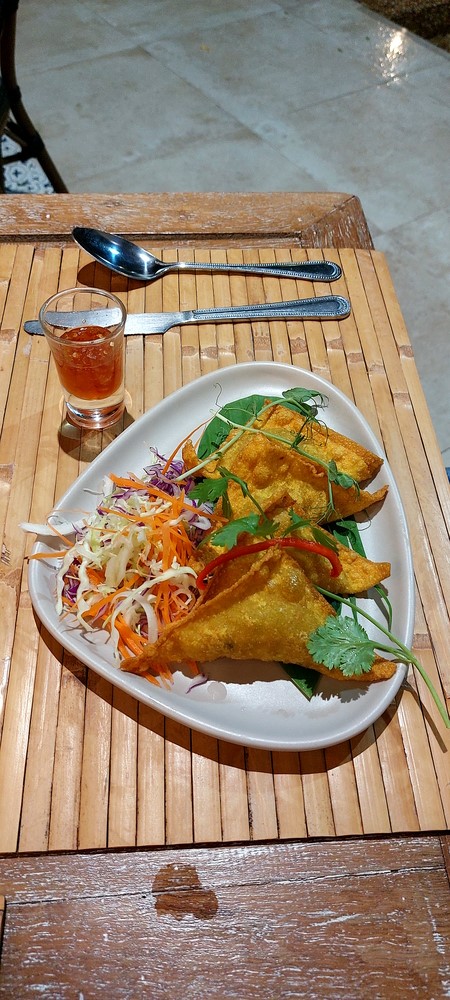 Das Abendessen nehmen wir erneut im Außenbereich des Restaurants ein. Eine sehr schöne, lockere Atmosphäre. Hier versteht man es, dem Kunden etwas zu bieten. Wie herrlich, hier zu sitzen und über das Meer zu schauen. Langsam wird es dunkel. Als die Moskitos loslegen, bringt die Bedienung ein Anti Moskito Spray. Ich bestelle eine Empfehlung des Chefkochs, ein 5 Gänge Menü für 14 €, Achim eine Pizza. Mein Menü ist spitze, Achims Pizza allerdings nur so groß wie ein Kuchenteller. Dafür bestellt er sich ein Dessert: Frittiertes Schokoeis. Wir sind soweit zufrieden. Mit Getränken und Trinkgeld zahlen wir knapp 38 €.