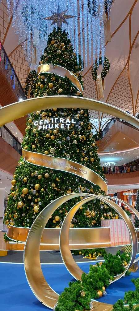 Schließlich verlassen wir den Luxusschuppen, nachdem wir in der Halle noch einige Bilder der Weihnachtsdekoration und des riesigen in Gold gehaltenen Weihnachtsbaumes gemacht haben. In rund einem Kilometer erreichen wir das BIG C, ein Supermarkt, der eher unseren Vorstellungen entspricht. Da gibt es Latschen für rund 7 €, T-Shirts ab 3 € und vieles mehr. Zum Schluss haben wir für rund 70 € eingekauft. Im Vergleich haben wir unsere neuen Koffer und Rucksäcke zu guten Preisen gekauft. Gleiche Qualität kostet hier einiges mehr. Im Untergeschoss finden wir eine Food Mall, wo wir unser Mittagessen zu uns nehmen. An rund 15 verschiedenen Ständen können wir unser Essen aussuchen, nachdem wir zuvor 14 € auf eine Karte eingezahlt haben. An jedem Stand wird der Gegenwert des Essens von der Karte abgebucht. Drei Gerichte mit zwei Flaschen Wasser, danach für Achim einen Grün-Tee –Smoothy und für mich einen tollen Espresso, kostet uns 380 THB = knapp 12 €. Vor der Tür sitzt am Taxistand eine Fahrerin, die bereits ist, uns für 11 € nach Ao Chalong zu fahren. Dort bestellen wir für den Abend ein Taxi, welches uns zum Coconut nach Kata bringen soll. Während ich nach einer kurzen Siesta das Tagebuch aufs Laufende bringe, macht Achim sein Yoga und geht dann eine Runde schwimmen. Bisher war es heute trocken und recht schön, gegen 17 Uhr fällt leichter Regen.