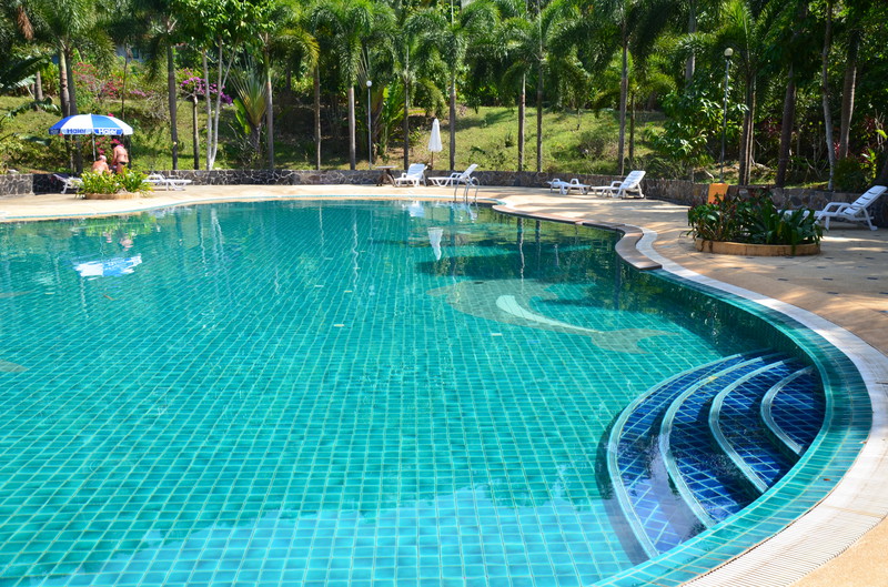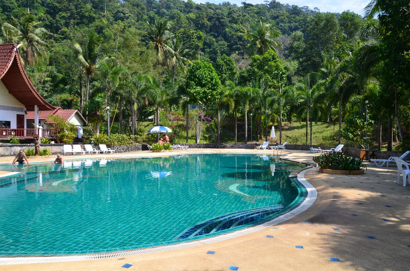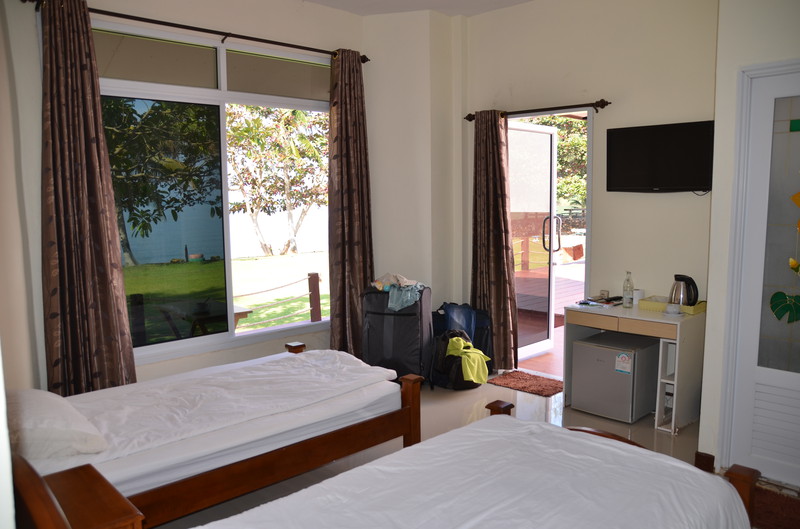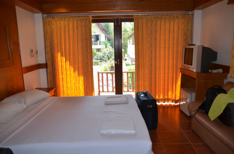 Das Essen in dieser Anlage war sehr speziell. Die Speisekarte lag in jedem Bungalow. Man suchte aus, was man haben wollte, bestellte es beim Chef – und bekam es dann eine gute Stunde später am Bungalow serviert. Aus Ermangelung einer Alternative, war eine andere Möglichkeit, an ein gekochtes Essen zu kommen, leider nicht gegeben. Der Einheimische nebenan führte einen kleinen Kiosk, wo man Getränke und Kleinigkeiten zu sehr günstigen Preisen erstehen konnte. So beschlossen wir, am 1.Tag dort zwei frische Kokosnüsse zu trinken und öffnen zu lassen. Dazu nahmen wir zwei große Flaschen Wasser und zwei „Tütensuppen“ mit, die nur noch mit heißem Wasser übergossen werden mussten. Das alles kostete umgerechnet 3,20 Euro. Am Tag der Abfahrt bot uns der Chef an, uns in seinem Auto mit auf die Fähre zu nehmen und uns ins Hotel auf Koh Chang zu bringen. Das Angebot nahmen wir gerne an, da wir dann unsere Koffer nicht auf die Fähre zu schleppen brauchten und auf der Insel uns nicht um einen Weitertransport kümmern mussten. Er war sehr glücklich, als wir ihm dann umgerechnet 10 Euro in die Hand drückten. Das Thai Garden Hill Resort stellte sich dann schnell als recht „verbraucht“ heraus. Die 27 Häuschen mit je zwei übereinanderliegenden Wohnungen bestehen schon längere Zeit, wurden aber noch nie renoviert. Überall erkennt man den Willen, das Ganze am Laufen zu halten. Wie Achim es sehr treffend ausdrückt: die Anlage hat einen sehr morbiten Scharm. Einen riesigen Vorteil hat diese Anlage: die Betten sind weicher und man wacht nicht immer wieder wegen Schulter- oder Rückenschmerzen auf. Die Karaoke Bar, welche sich direkt gegenüber der Anlage befindet, hält alle bis weit nach Mitternacht mit seiner Musik wach. Auch an das lustige Geschrei von Kindern müssen wir uns erst wieder gewöhnen, da sich viele Familien (besonders Russen) hier niedergelassen haben. Die Rezeption und das Restaurant werden von Ladymen geführt, dem 3. Geschlecht in Thailand. Interessant, die Herren Damen zu beobachten und zu sehen, mit welcher Selbstverständlichkeit sie das Leben hier meistern.