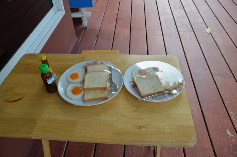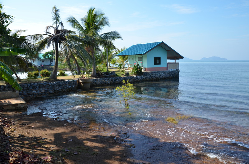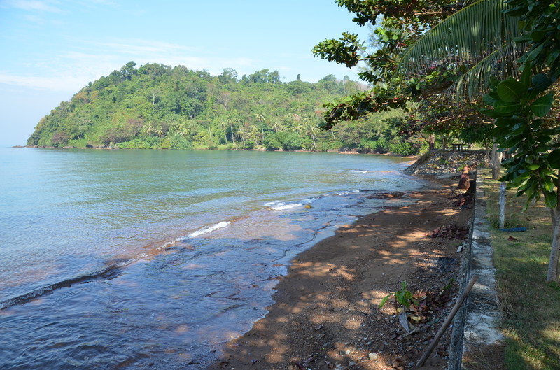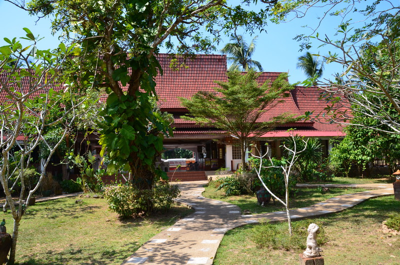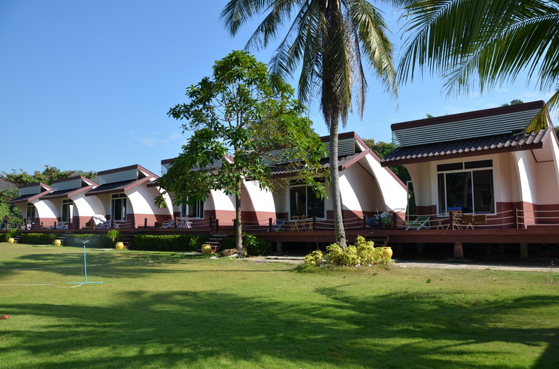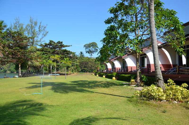 Wie schnell die Zeit verfliegt. Nun ist bereits der 11. Tag unserer Reise gekommen. Während Serene Sands sehr beschaulich und ruhig war, stellt sich die Anlage in der Nähe von Trat als sehr einsam und völlig von der Umwelt abgeschnitten dar. Die sechs Bungalows, direkt am Meer gelegen, waren jede Nacht belegt. Allerdings blieb niemand länger als ein bis zwei Nächte, da es in der näheren Umgebung tatsächlich NICHTS gab. Die Anlage Lamptalay liegt nur fünf Minuten mit dem Auto von der Fähre nach Koh Chang entfernt und wird daher gerne von Reisenden frequentiert, die am nächsten Tag auf die Insel übersetzen, oder von dort zurückkommen. Der Rasen vor den Bungalows ist niedrig gehalten und kann als guter Platz zur Anbetung der Sonne verwendet werden. Gleich danach kommt das Meer, welches jedoch wegen seiner felsigen Küste nicht zum Schwimmen genutzt werden sollte. Wir haben selbst beobachten können, wie eine Schlange vom Meer herkommend an unserer Liegewiese „anlegte“ und von einem älteren Einheimischen mit Stock und Schlägen ins Meer zurückgescheucht wurde. Wie gut, dass Schlangen sehr scheu sind.