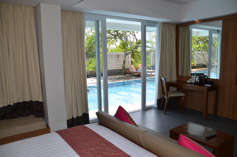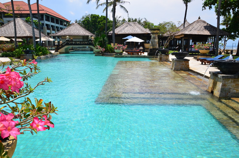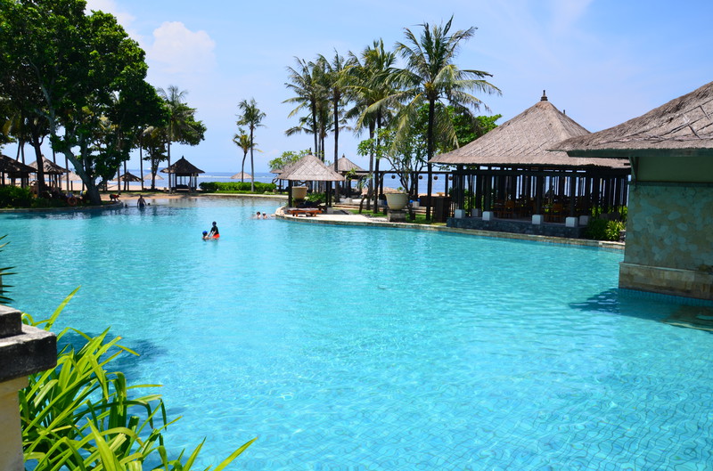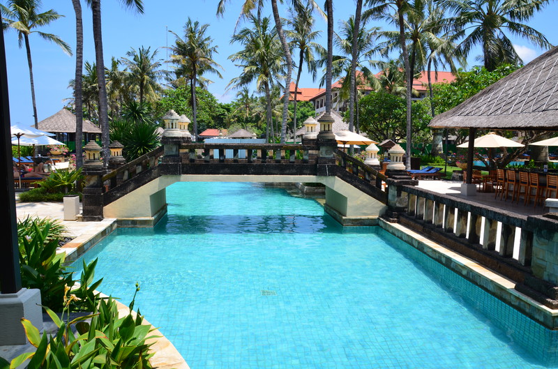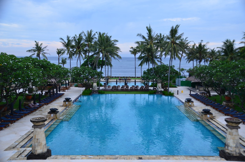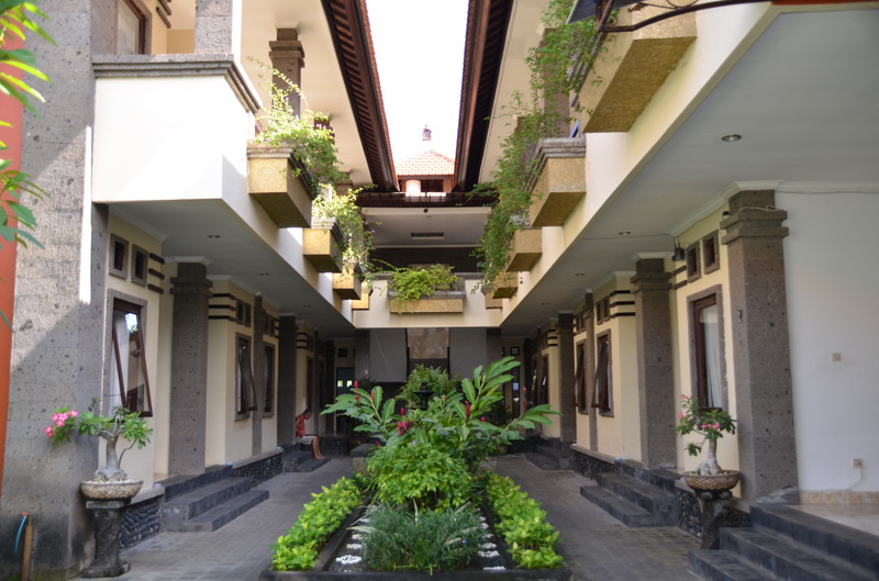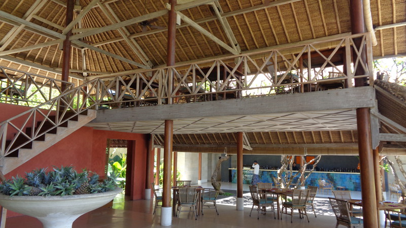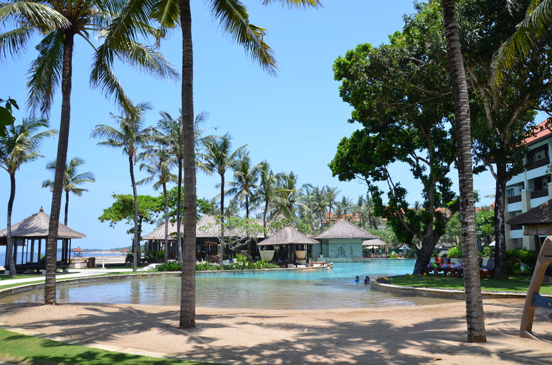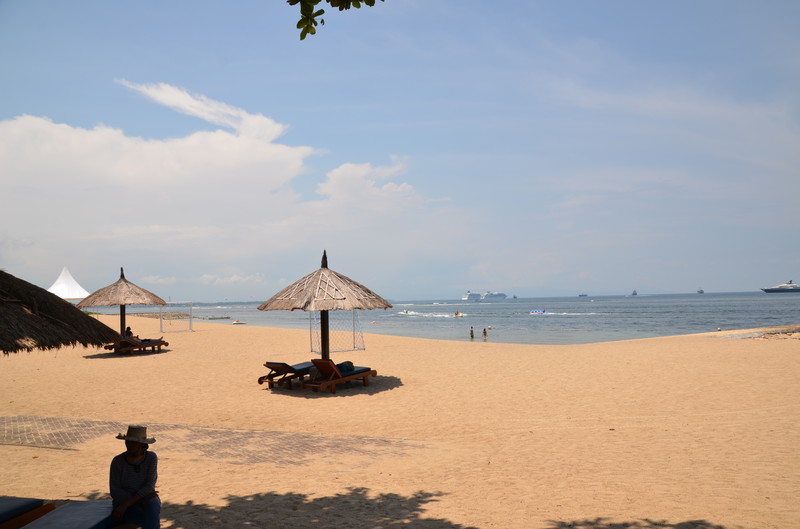 So fiel uns der Abschied von Seminyak nicht schwer, wenn wir uns auch an den Luxus des Zimmers gewöhnen konnte. Die 20 km nach Nusa Dua kosteten mit dem Taxi 18 Euro. Der Verkehr war enorm. Wir kamen dabei auch an der Anlegestelle der Kreuzfahrtschiffe vorbei, wo wir vor ziemlich genau einem Jahr mit der Magellan lagen. Unser neues – und letztes – Hotel ernüchterte uns allerdings recht schnell. Die Außenanlage ist zwar recht schön und gepflegt, die Zimmer aber sehr dunkel und funktionell gehalten. So ist es nicht erstaunlich, dass wir nach der ersten Nacht gemeinsam überlegten, ob wir nicht ins nahe gelegene Ibis Style umziehen sollten. Allein die Tatsache, dass dann wieder ein halber Tag des Urlaubs „verloren ging“, ließ uns zum Entschluss kommen, zu bleiben. Da wir tagsüber ohnedies mehr unterwegs sein wollen, kann uns das Bett zum Übernachten auch nicht schrecken. Die Klimaanlage funktioniert, die Toilette kommt allerdings schon mal ins Wanken, wenn man nicht still sitzen bleibt. Dass die Dusche, trotz Duschvorhang mehr Wasser in die Umgebung abgibt, ist auch nicht die Katastrophe, zumal wir es ja nicht putzen müssen. Das Frühstück besorgen wir uns zum Teil im Supermarkt selbst. So können wir in den letzten Tagen trotzdem jeden Tag mit einem Highlight beginnen.
