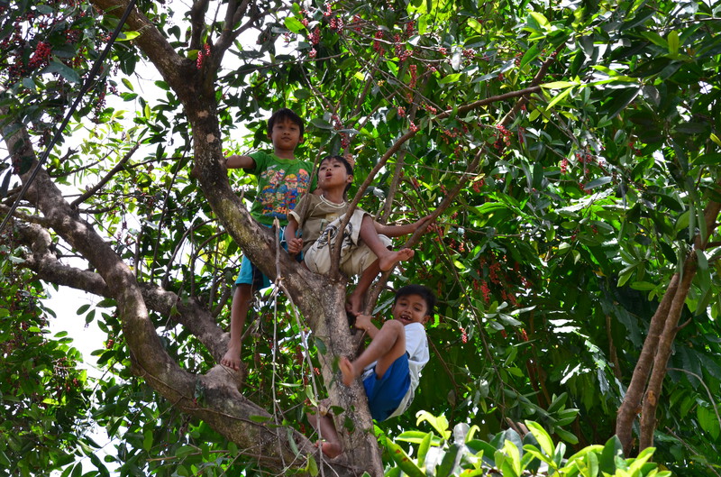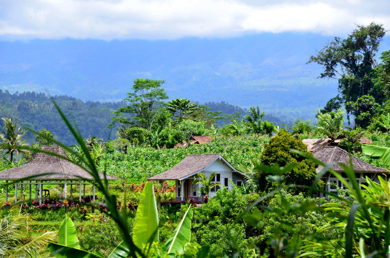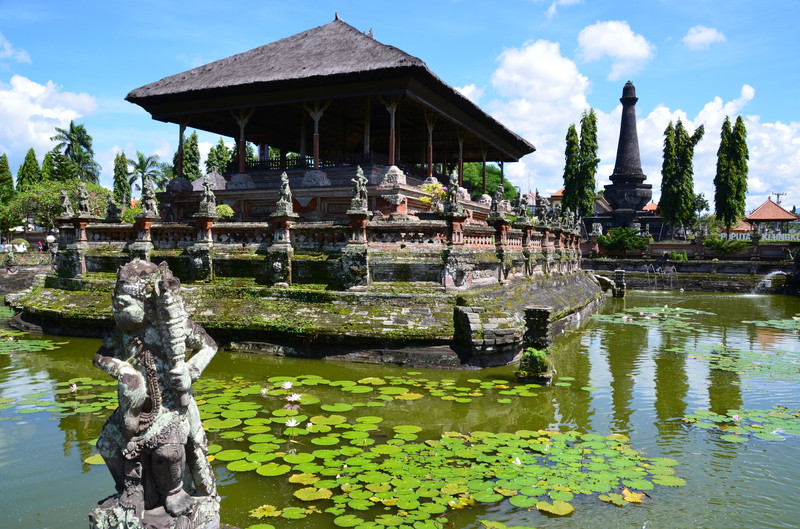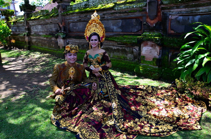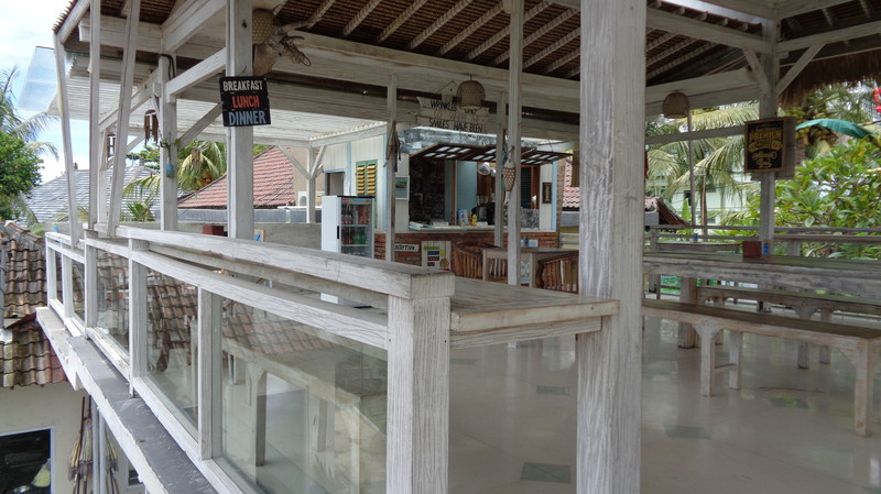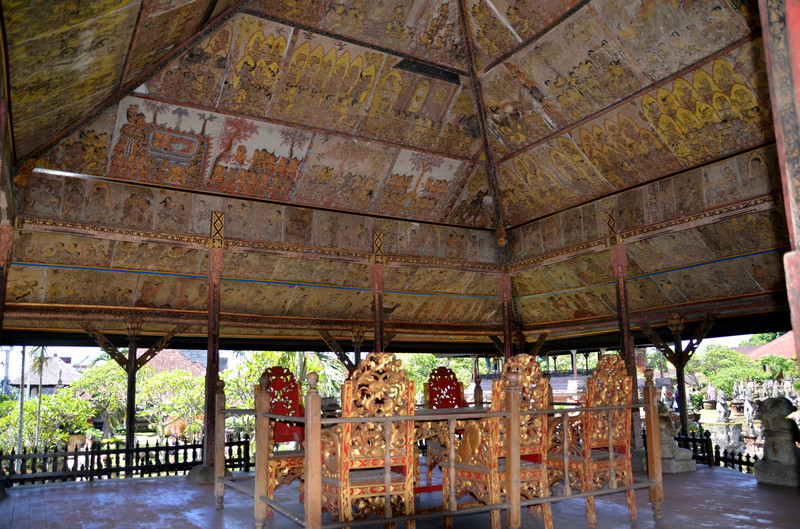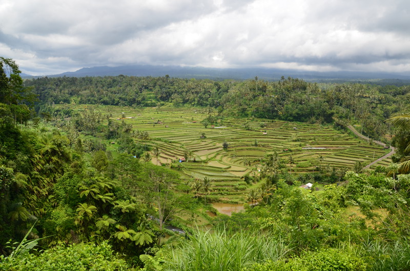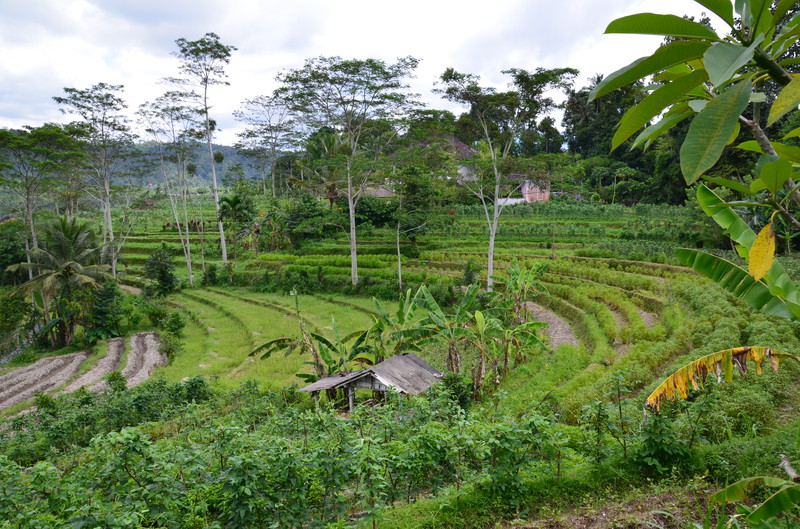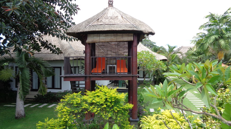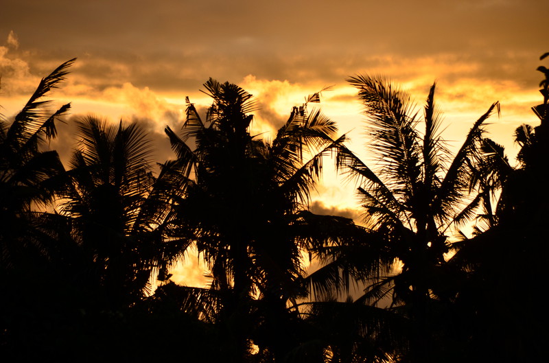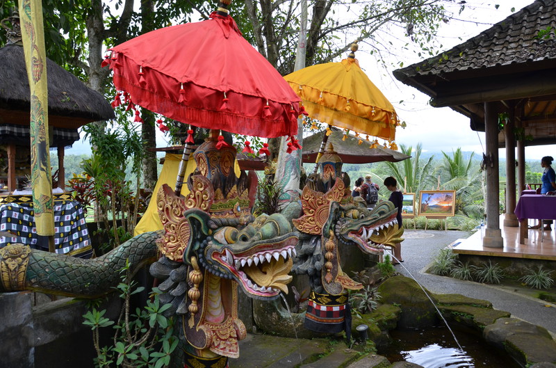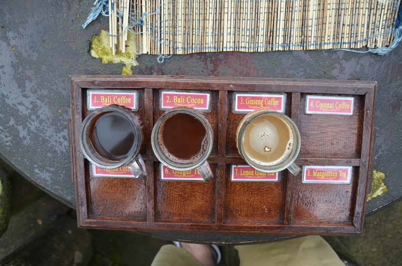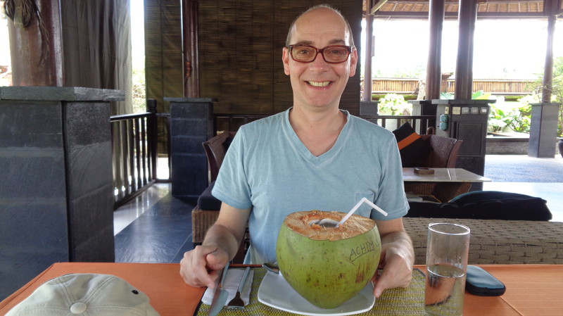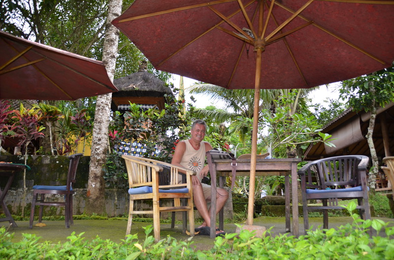 Den Ausflugstag möchte ich extra erwähnen. Damit wir etwas von der Umgebung sehen, haben wir uns in der Anlage ein Auto mit Fahrer gemietet. Er sollte uns eigentlich um neun Uhr abholen, rief aber dann um 23 Uhr zurück, um uns zu sagen, dass er erst um zehn käme. Auch gut. In der Stadt Klungkung konnten wir uns die Gerichtshallen anschauen, wo früher Urteilsverkündungen stattfanden. Herrliche Deckengemälde ließen erahnen, wie es dabei zuging. Das Museum nebenan war allerdings in wenigen Minuten erledigt, da es nur wenig von Kultur und Vergangenheit zu sehen gab. Im Garten und am Teich waren dann viele Brautpaare zu sehen, die von professionellen Fotografen abgelichtet wurden. Den einheimischen Markt haben wir nur kurz gestreift, da wir uns dafür später in Ubud Zeit nehmen werden. Das Mittagessen war dann sensationell: hoch oben am Berg gab es ein Restaurant, welches fast nur von Einheimischen besucht war. Gegenüber lag der Vulkan Agung in Wolken. Das ganze Tal war mit Reisterrassen und Wald bedeckt. Ein fantastischer Ausblick. Wir eroberten einen Tisch, direkt am Ende der Plattform. Das angebotene Buffet war vielfältig und köstlich, die Säfte frisch gepresst. Das Ganze kostete dann zu Dritt 24 Euro ! Im „Urwald“ ließ uns der Fahrer raus, damit uns einer aus der Bauernkooperative die Bäume, Gewürze und Kaffee erklären konnte. Natürlich endete dies dann im Shop, wo all diese Gewürze auch zu kaufen waren. Auch davon machten wir dann gebrauch. Der Ausflug dauerte 6 ½ Stunden und war die 45 Euro (inkl. Trinkgeld) wert.