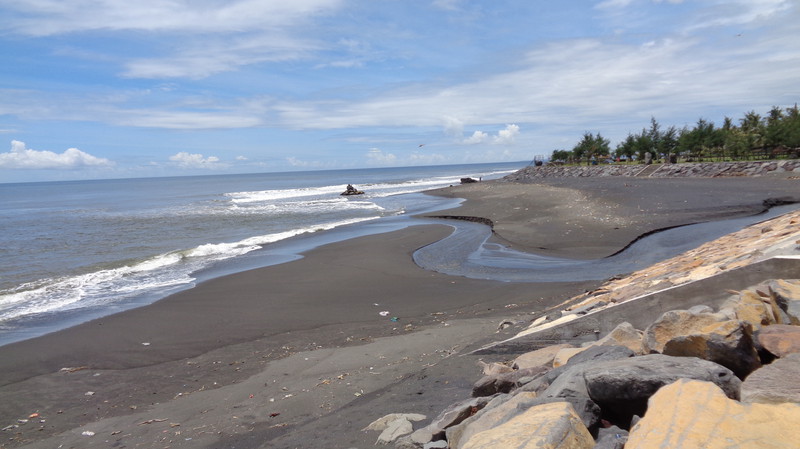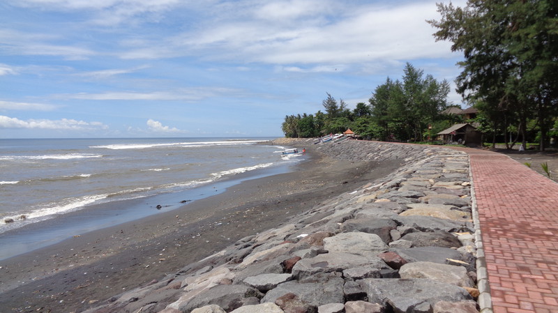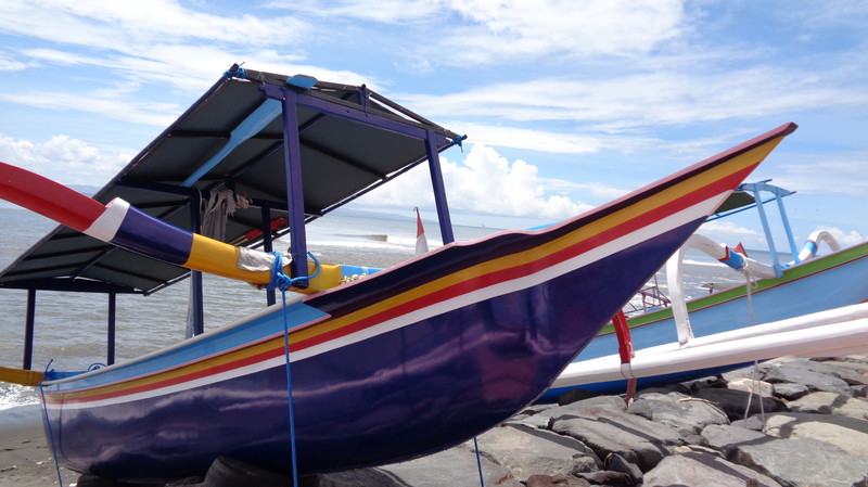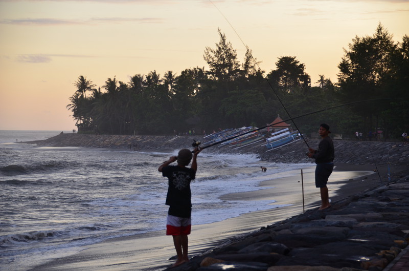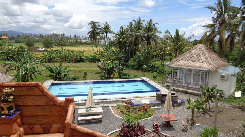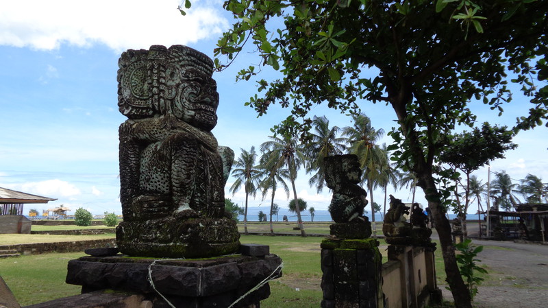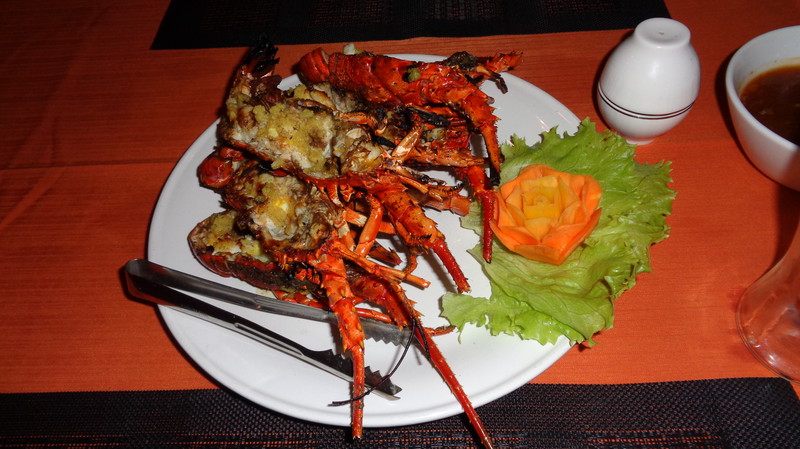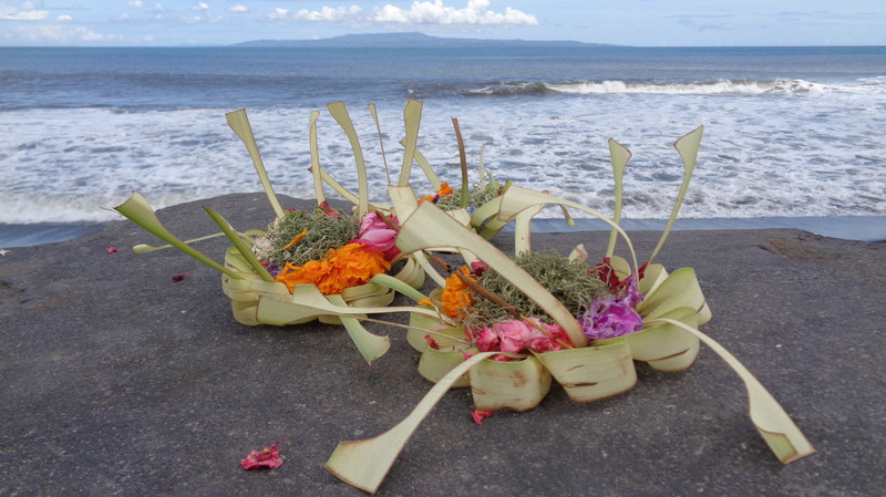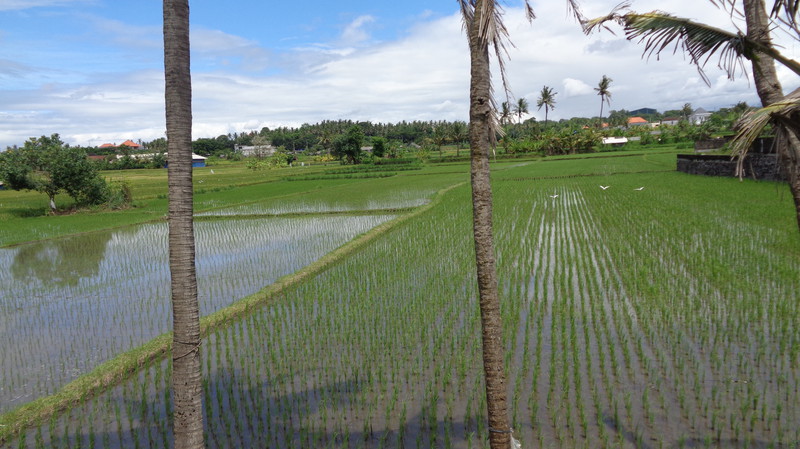 Die Anlage, die wir dann vorfinden ist fantastisch. Die Lage, direkt am Meer, einen sauberen, großen Pool und sehr freundliches Personal. Was will man mehr. Die Küche wurde extra für uns nochmals geöffnet und wir bekamen das erste Essen auf Bali. Es schmeckte köstlich. Dazu ein kaltes Bier! Danach, mittlerweile war es 23 Uhr bekamen wir unsere Zimmer gezeigt, die etwa 50 Meter außerhalb der Anlage liegen. Gefüllter Kühlschrank, Klimaanlage, weiche Betten und ein Bad, welches nach oben hin offen ist. Das Ganze für knapp 30 Euro pro Zimmer, inklusive leckerem Frühstück. Hier kann man sich nur wohlfühlen. Am nächsten Morgen erkunden wir die Umgebung, wo es leider nicht viel zu sehen gibt. Damit Regula sich akklimatisieren kann, lassen wir es ganz ruhig angehen. Wir gehen ein Stück am Strand spazieren, essen in der Anlage und genießen den herrlichen Pool. Das Wasser ist warm wie eine Badewanne, was sich aber bei 35°C nicht vermeiden lässt. Zum Abendessen bestellen wir uns Lobbster, den uns eine der Angestellten empfiehlt, da ihr Mann ihn selbst fischen geht. Zwei Kg kosten rund 50 Euro. Zu Hause ein unbezahlbares Vergnügen. Mit einer Flasche balinesischem Wein wird es ein kulinarisches Vergnügen und wir sind rundum satt. Bevor wir ins Restaurant gehen, muss ich noch für „kleine Jungs“. Keiner kann sich den Schreck vorstellen, als ich, auf der Toilette sitzend im Blumentopf gegenüber direkt einer Schlange in die Augen sehe. Nach und nach registrierte ich allerdings, dass der kleine Wurm vor mir ebenso viel Angst hat, wie ich vor ihm. Achim kam schnell, als ich ihn rief und bekam die rund 30 cm lange, Kinderfinger dicke Schlange noch fotografiert. Später wurde sie vom Personal eingefangen und außerhalb der Anlage wieder freigelassen, da Schlangen unter Schutz stehen. Am nächsten Tag finden wir auf unserer Strandwanderung ein kleines Dorf und gehen dort in einem einheimischen Lokal Mittagessen. Wir sitzen hoch oben über den Reisfeldern, immer von einem leichten Wind umweht und bekommen gebratene Nudeln, Reis und Gemüse serviert. Ein frisch gepresster Saft und Wasser füllen unser Flüssigkeitsdefizit wieder auf. Das Ganze kostet zu Dritt keine 10 Euro. An unserem letzten Tag gehen wir nochmals da essen und erleben unterwegs am Meer eine Beerdigungszeremonie. Faszinierend zu sehen, wie rund 200 Leute vom Verstorbenen Abschied nehmen und dann gemeinsam am Ufer essen. Allerdings ist es ernüchternd zu sehen, wie sorglos die Balinesen mit dem Müll umgehen. Als wir vom Essen zurückkommen, ist alles mit Plastikabfällen übersät. Schade. Den Nachmittag verbringt Regula in ihrem Lieblingshochsitz, lesend im Liegestuhl mit Blick über das Meer und die hohen Wellen. Im Pool treffen wir uns dann wieder.