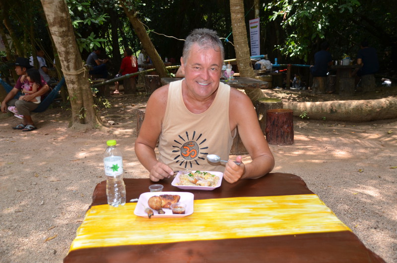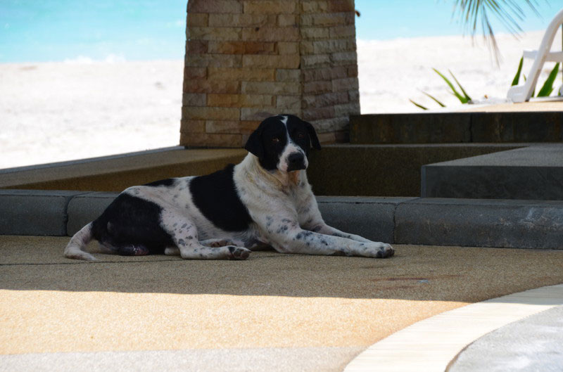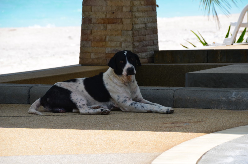 Was wir richtig genossen haben, war der Strand. Hier gibt es zwar auch viele Hunde, aber alle friedlich und meist sehr scheu. Zum Mittagessen liefen wir in den Tagen öfters die zwei Kilometer bis zum nächsten Restaurant am Strand. Leckeres Essen, eine Bedienung, die verstand, was wir wollten und annehmbare Preise. Bei Dunkelheit war es uns dann doch nicht ganz geheuer, diesen Spaziergang am Strand zu machen. So nahmen wir es in Kauf, in der Anlage auch mal falsch verstanden zu werden. Wenn Om im Dienst ist, klappt es mittlerweile ganz gut. Vor allem hat sie verstanden: no chilli, mei pet (nicht scharf). Bei jedem Essen sind wir natürlich von den (meist) wilden sechs Hunden umgeben, die hoffen, etwas vom Teller abzubekommen. Mein gefleckter Liebling, der zwar der scheueste von allen ist, hatte heute beim Frühstück echtes Glück. Vier Würstchen und die zwei Eigelb von meinen „zweiseitig gebratenen“ Eiern flogen durchs offene Fenster, genau vor seine Schnauze. Fast wie im Paradies.
