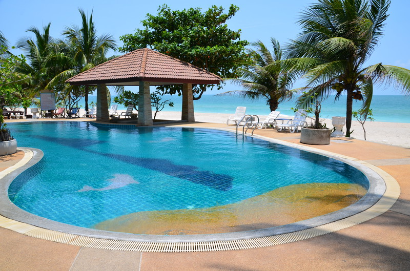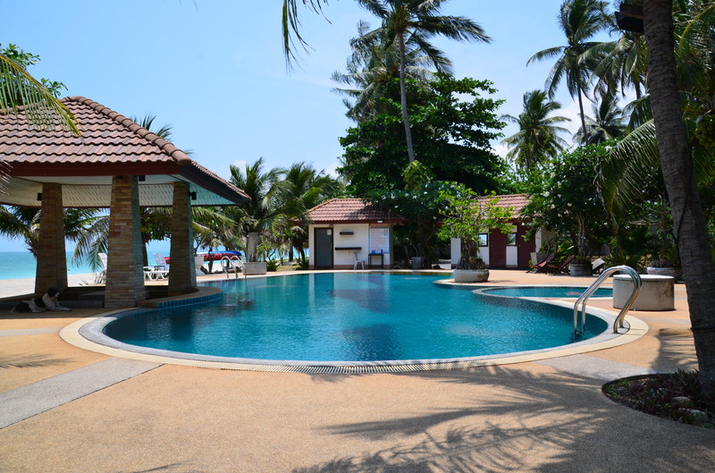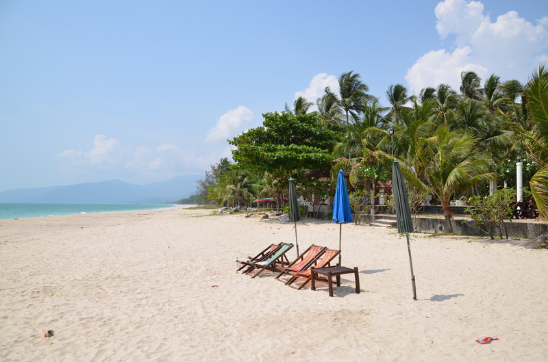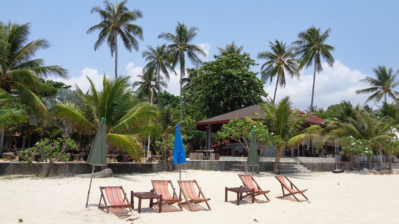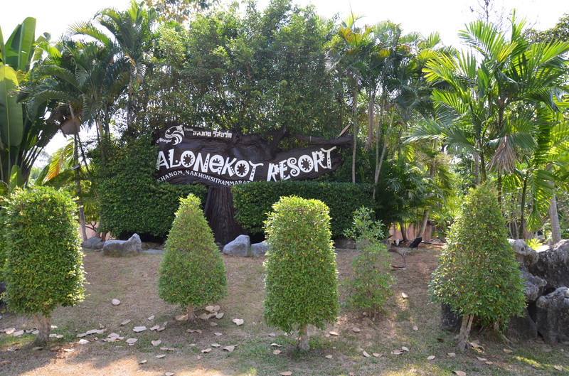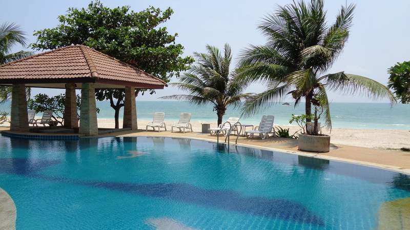 Ja, so flogen die fünf Tage dahin. Für die Weiterreise nach Surat Thani und dann zum Khanom Beach hatten wir uns Bahnkarten besorgt. Die schweren Koffer mussten wir leider ins obere Gepäcknetz hieven, da sonst kein Platz im Waggon war. Kaum saßen wir auf unseren reservierten Plätzen, bekamen wir schon warmes Essen. Welch ein Service. Leider ging das Ganze dann aber völlig in die Hose. Beim Anfahren im nächsten Bahnhof rutschte mir das ganze Tablett auf den Schoß, da ich nicht gesehen hatte, dass die Ablage defekt war und eine enorme Schräglage hatte. So bekam ich das Essen statt in, auf den Bauch. Das Curry hing in meinem Shirt, die Soße lief mir in den Schritt. Ihr könnt euch bestimmt vorstellen, wie schnell meine gute Laune in den Keller rauschte. Beim nächsten Halt hievten wir meinen Koffer herunter und ich zog ein frisches T-Shirt an. „Oben ohne“ im klimatisierten Zugabteil kann ganz schön kalt werden. In Surat Thani wurden wir direkt von den Schleppern abgepasst. Jeder wollte natürlich seinen Wagen an den Mann bringen, doch keiner wollte zum Khanom Beach, da dieser viel zu weit entfernt liegen würde. Schließlich bot sich ein Taxi an, uns für 45 Euro ins Hotel am Khanom Beach zu bringen. Er müsse allerdings unterwegs noch Gäste zum Bus fahren, da diese die Fähre erreichen müssten. Tatsächlich fielen wir auf den Trick herein und zahlten ein Schweinegeld, nur um im Minibus zu unserem Hotel zu kommen. Unterwegs lud der Fahrer genau die Leute an verschiedenen Stellen ab, die uns im Zugabteil am meisten störten: zwei Männer, die so dicht von Alkohol und Drogen waren, dass sie sich kaum auf den Beinen halten konnten und eine junge Mutter mit einem kaum dreijährigen Kind, die das Kind machen ließ, was es wollte. Sie schlief, während das Kind sich mit den Nachbarn beschäftigte. Auch beim Aussteigen (am falschen Pier) lief sie los und ließ das Kind einfach hinter sich. Schließlich kamen wir im Dunkeln im Alongkot Resort an. Unser erster Eindruck war sehr gut. Wir bekamen direkt ein Upgrade in einen größeren Bungalow, der in der Nähe des Pools lag. Fing gut an. Eine junge Frau brachte uns die 80 Meter zu unserer Unterkunft, zeigte uns per Handzeichen: dort Pool, dort Restaurant – und war weg. So packten wir das Nötigste aus und machten uns auf den Weg, Pool und Restaurant zu erkunden. Tatsächlich war die Anlage genau das, was wir uns für die letzten Tage am Meer gewünscht hatten.