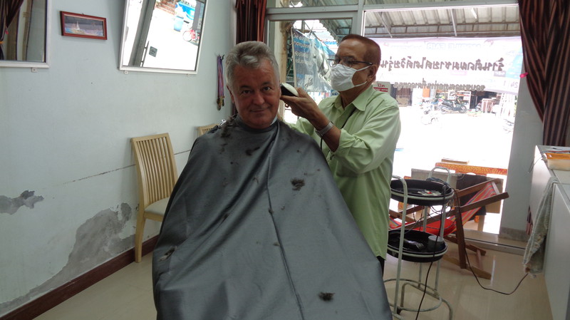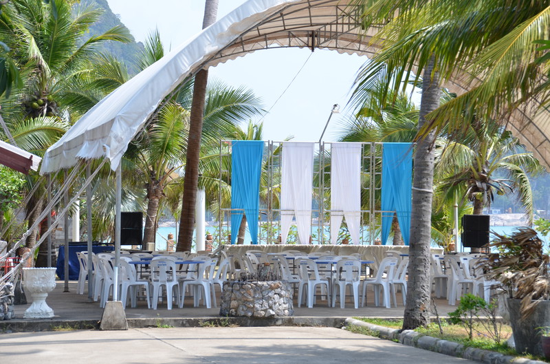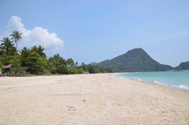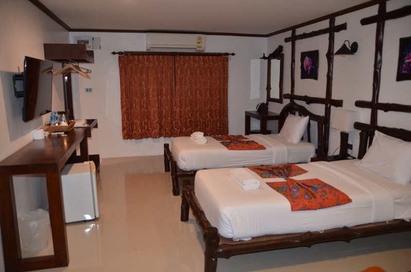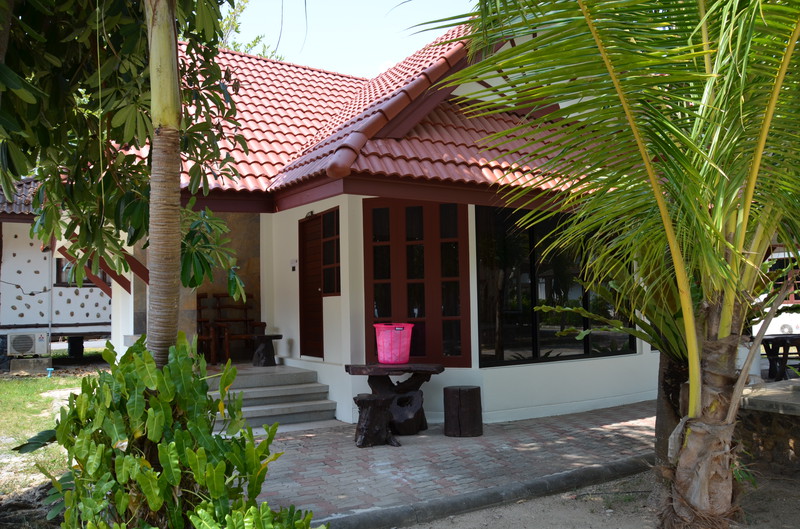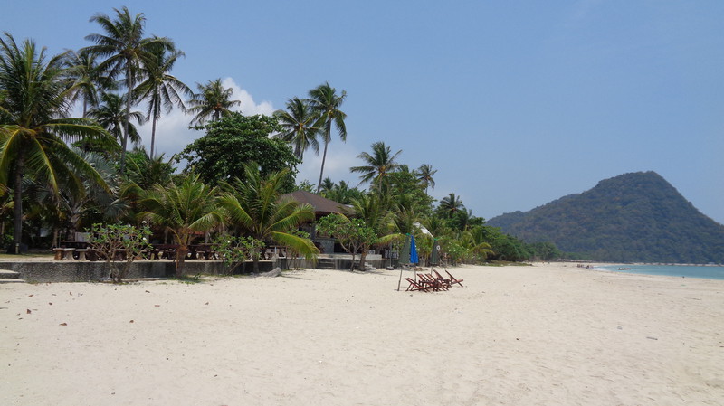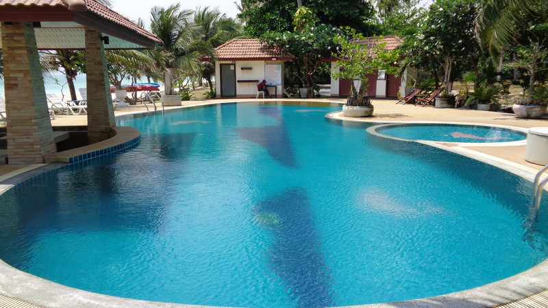 Der Pool lag so, dass man das Meer beobachten konnte und keine fünf Meter vom breiten, weißen Strand entfernt war. Am nächsten Morgen sahen wir, dass wir in beide Richtungen herrliche Spaziergänge unternehmen konnten. Das Restaurant war auch nicht schlecht. Die Karte war mit Bildern versehen und in Englisch und Thai beschriftet. Kann ja nichts schief gehen – haben wir gedacht und ein leckeres Essen bestellt. Allerdings überhörte die Bedienung unseren Wunsch: nicht scharf und keinen Chili. So bekam ich meinen Tintenfisch, ertränkt im gehackten Chili. Umgehend brachte ich diesen zurück und bekam ihn fünf Minuten später völlig ohne jedes Gewürz. Die gleiche Chilisoße wurde jedoch in einem extra Schüsselchen mitgeliefert. Das jemand den trockenen, gekochten Tintenfisch ohne Soße essen konnte, war dem Koch doch zu suspekt. Achim brachte die Soße wieder zum Tresen und bat um eine einfache Limetten-Knoblauch-Soße. Oh Wunder, es klappte. Dass in diesem Restaurant kaum einer von den rund 15 Bedienungen der Englischen Sprache mächtig war, stellten wir schnell fest. Beim Frühstück am nächsten Tag ging das gleiche Spiel wieder los. Spiegeleier, beidseitig gebraten. Ein Abenteuer. Bis die endlich geliefert wurden, vergingen Tage und benötigten der Übersetzung der Managerin in dieser Anlage. So musste ich mich mal mit kalten, einseitig gebratenen, mal mit frittierten Spiegeleiern begnügen. Nok, die junge Managerin hatte genug mit ihrem halbjährigen Kind zu tun und hatte eigentlich keine große Lust, ihre Aufgaben zu bewältigen. Stattdessen träumte sie davon, Europäer zu finden, die ihre Anlage in ganz Europe bekannt machen würden. Dabei bekommen die vielen Angestellten die rund 70 Bungalows nicht auf die Reihe. Die Außenanlage ist gepflegt und recht sauber. Dafür versteht der Zimmerservice seine Aufgabe nur darin, täglich die Betten frisch zu beziehen, Wasser und Kaffeebeutel zu verteilen und die Abfalleimer zu leeren. Die Armaturen im Bad kleben noch vom Vor-Vorgänger. Als wir uns bei Nok über den Zustand beschwerten, wurden am nächsten Tag die Armaturen auf Hochglanz poliert, dafür aber kein Bett mehr angefasst und kein Handtuch mehr gewechselt. Ebenso war das Problem im Restaurant. Nur zwei Mitarbeiter sprachen etwas Englisch, was zu langen Erklärungen führte, die dann doch nicht verstanden wurden. Mein größtes Problem beim Frühstück bestand darin, dass es nur Tassen und Kännchen aus fleckigem Plastik gab. Als ich dies Nok erzählte, dass dies für mich ein no Go ist, bekamen wir ab sofort zum Frühstück und zum Abendbrot eine Tischdecke aufgelegt und Porzellan gereicht. Für Europäer ist diese Anlage überhaupt nicht geeignet, da in den zehn Tagen unseres Aufenthalts sieben Tage Party war. Mal war es ein Beamtenbund, der bis Mitternacht lauten Krach machte, mal ein Klassentreffen. Danach waren es verschiedene Schulklassen, die im Saal ihre Feiern und den Unterricht abhielten und das Restaurant zu allen Mahlzeiten blockierte. Der Pool ist den größten Teil des Tages mit Familien mit Kindern belegt, die herumtollen, Kopfsprünge und Arschbomben machten (laut Punkt 5 der Poolregeln verboten) oder ins Wasser spuckten.