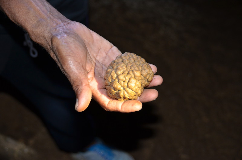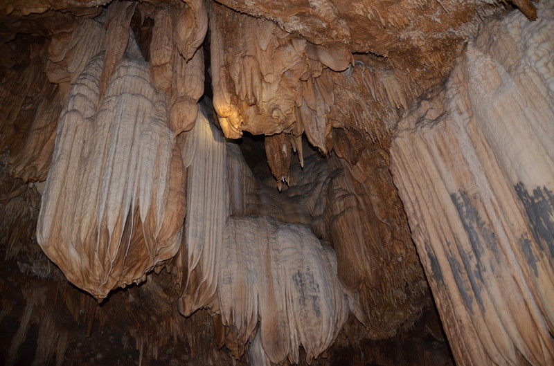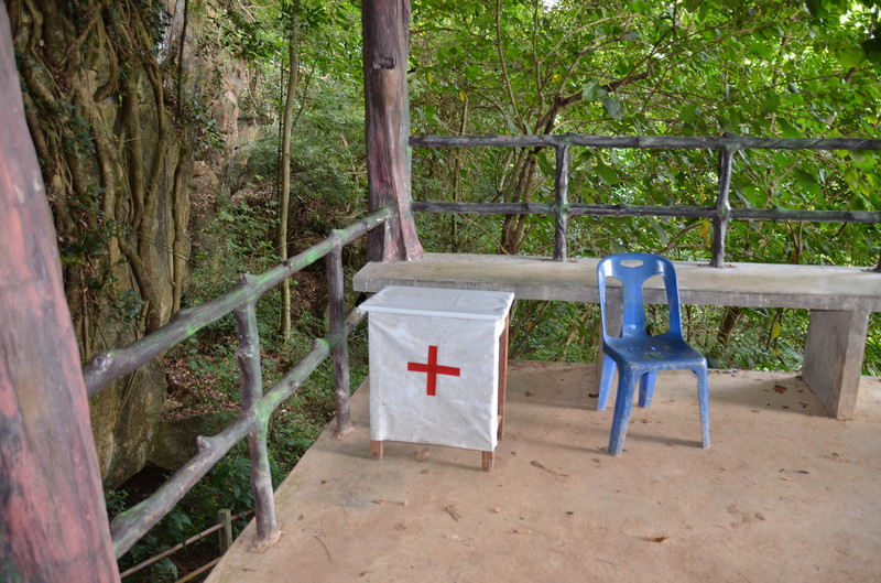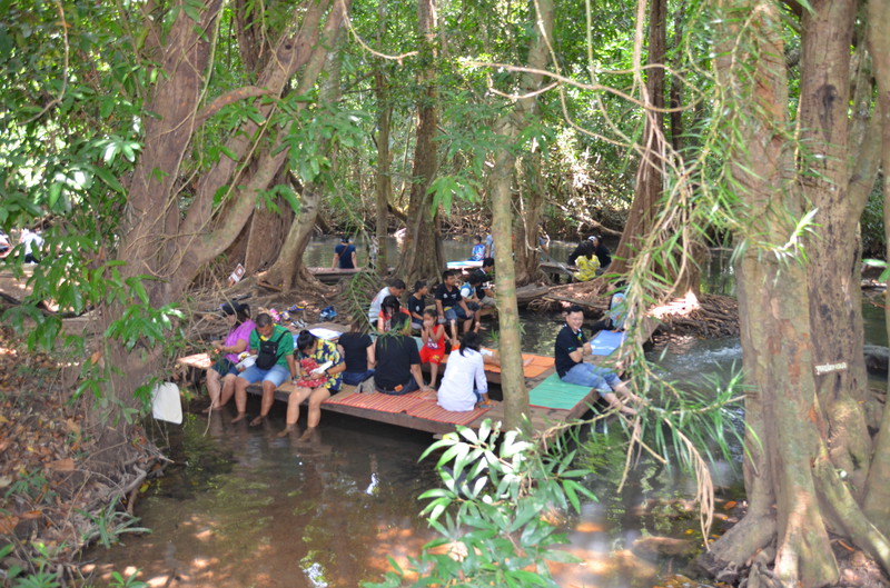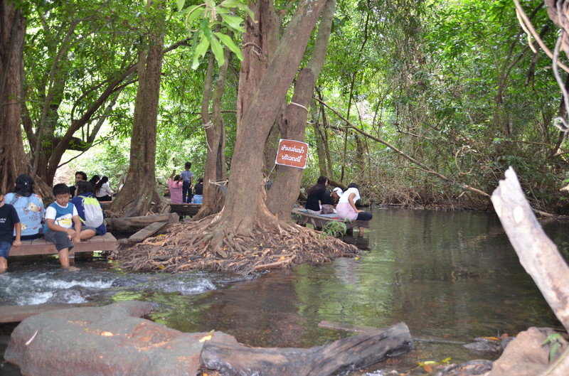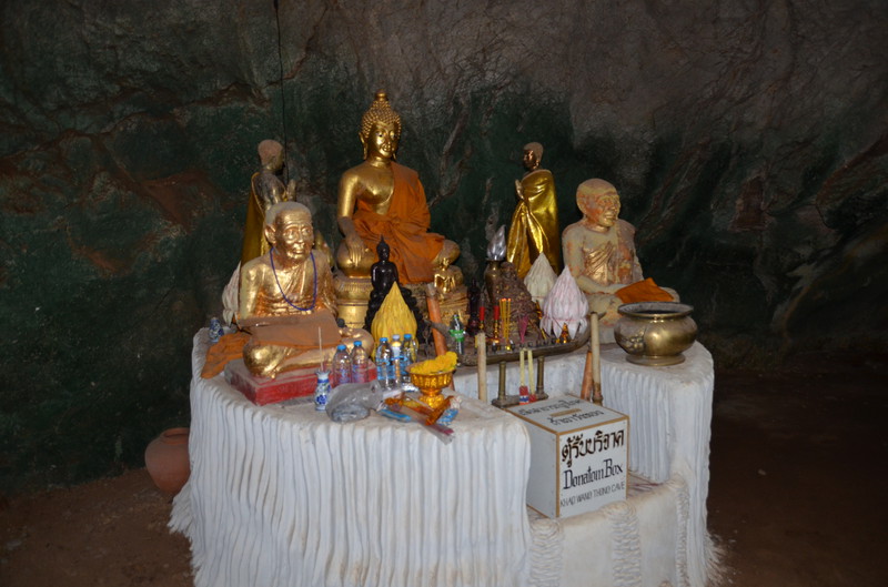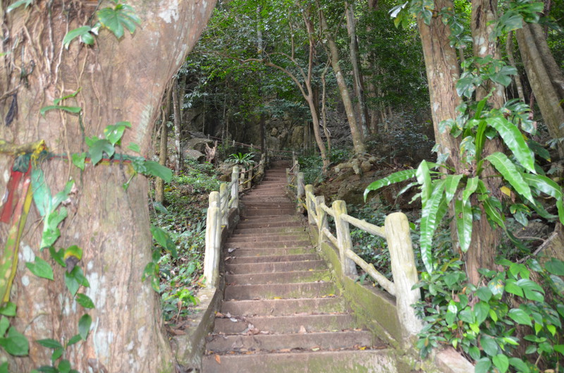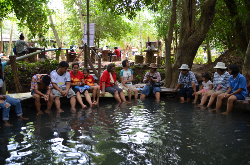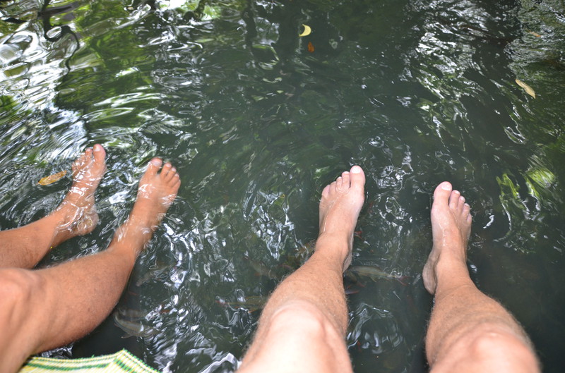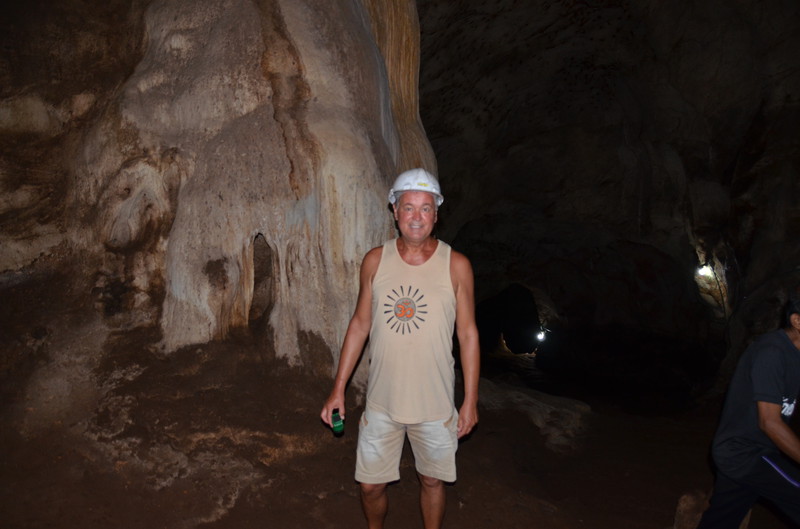 Gestern war mein Geburtstag. Da wir an diesem Tag nicht das „normale Pool- und Strandprogramm“ alleine wollten, buchten wir einen Ausflug in eine Tropfsteinhöhle und zum Natur Fisch Spa. Beides tolle Erlebnisse. Zunächst fahren wir mit Nay, dem Bruder der Managerin unserer Anlage und einem thailändischen Fahrer zur Höhle. Wir bekommen alle einen Arbeiterhelm verpasst und steigen 170 Stufen hoch. Ganz schön anstrengend. Oben angekommen, ruhen wir uns zunächst etwas aus, bevor wir durch ein recht kleines Loch in die Höhle einsteigen. Drinnen begrüßt uns ein Buddha Altar, vor dem sich unser Führer verneigt. Soll das ein Zeichen dafür sein, dass wir den besonderen Schutz Buddhas brauchen. Schaden kann es ja nie. Also verneigen wir uns auch. Nay und unser Fahrer begleiten uns ebenfalls. Die Höhle hat ab und zu mal eine Lampe. Den Rest müssen wir mit Taschenlampen erkunden. Es geht durch enge Spalten, niedrige Löcher und schlüpfrige Wege. Ob wir da je wieder heil herauskommen? Andere Leute haben es ja auch geschafft. Der kleine, magere Führer zeigt uns durch das Licht der Taschenlampe immer wieder tolle Stalaktiten und Stalagmiten. Mal erkennt man den Gott Ganesha mit seinem Rüssel, mal eine Heiligenfigur in weißem Gestein. Dann leuchtet er auf einen riesigen, erigierten Penis, der in Rot leuchtet. Sogar die Farbe sei natürlich. Und überall hängen und fliegen aufgeschreckt die Fledermäuse herum. Es gibt drei Sorten in dieser Höhle. Die ganz kleinen sind kaum 10 cm, die nächsten dann doppelt so groß. Die dritte Sorte ist dann wie eine Hand und noch größer. In der fast dunklen Höhle ein unheimliches Gefühl. Der Boden ist teilweise so glitschig, dass wir sehr vorsichtig einen Fuß vor den anderen setzen müssen. Vielleicht hätte man uns sagen sollen, dass geschlossene, feste Schuhe angebracht sind. Es geht alles gut. In wenigen Jahren wird es bestimmt nicht mehr möglich sein, diese Höhle so einfach zu besuchen. Es ist schade, wie viele der herrlichen Steinskulpturen schon jetzt abgerissen am Boden liegen. Kein Wunder, wenn Kinder alleine durch die Höhle springen dürfen. Kurz vor unserem Einstieg kamen zwei Jungs, im ungefähren Alter von 12 Jahren aus der Höhle, völlig verdreckt. Sie hatten ganz offensichtlich in der Höhle gespielt. Selbst unser Führer klopft immer mal wieder gegen hohle Steingebilde, um uns den dumpfen Klang vorzuführen. An einer Stelle hängt ein Gebilde von der Decke, welches wie ein rund acht Meter langer Vorhang aussieht. Er klopft gegen die einzelnen „Falten“, um uns die Töne vorzuführen. Mein „lass das bleiben“ interessiert ihn nicht. Kein Wunder, sind die meisten Falten schon zur Hälfte abgebrochen. An der tiefsten Stelle der Höhle hängt eine Stromleitung, an der, wie an einer Perlenkette aufgereiht die kleinen Fledermäuse hängen. Danach geht es die gleiche, rutschige, enge Strecke wieder bergauf. Da kommen uns die ersten zwei europäischen Touristen mit Führer entgegen. Gut, dass wir einen Helm tragen, sonst hätte ich mir einige Male den Kopf ganz gewaltig angeschlagen. Am Altar des Buddhas bedanken wir uns artig, dass alles in der letzten Stunde gut gegangen ist. Das letzte Hindernis ist dann noch das kleine Loch, welches aus der Höhle nach Draußen führt. Geschafft. Ich bin nass geschwitzt und der Schweiß tropft mir vom Gesicht. Das Shirt kann man auswringen. Wir erholen uns etwas, bevor es die 170 Stufen wieder abwärts geht. Schade, dass solch herrliche Naturschauspiele durch die Unaufmerksamkeit verloren gehen. Entweder wird in wenigen Jahren alles kaputt, oder es wird eine touristische Attraktion sein. Ich hoffe, das letztere wird das Rennen machen. Unten angekommen drücken wir unserem Führer jeder 100 THB / 2,80 Euro als Trinkgeld in die Hand. Zusätzlich geben wir 200 THB in den „Opferstock“, der dazu dienen soll, die Höhle zu erhalten. Für die Spende bekommen wir ein Bündel mit rund 20 Fingerbananen in die Hand gedrückt. Die anderen Touristen haben vermutlich weniger gegeben, sie bekommen nur jeder zwei Bananen. Und weiter geht es zum Natural Fisch Spa. Wir wissen nicht genau, was uns da erwartet. Bei unserer Ankunft stehen unzählige Autos auf dem Parkplatz unter den Palmen. Unten am Fluss sind Sitzbänke über dem Wasser aufgebaut, die alle von Thais belegt sind. Wir sind die einzigen Touristen. An einem der Sitzecken wird eben eine Seite frei und Nay deutet uns an, dahin zu sitzen. Das Wasser ist herrlich kalt und die Fische machen sich sofort über unsere Füße her. Im Norden Thailands haben wir vor Jahren eine solche Behandlung über uns ergehen lassen. Da waren es kleine, maximal 10 cm große Fischlein im Aquarium. Hier sind es Fische, die bis zu 20, 25 cm groß sind. Die ersten Knabbereien sind unerwartet und fühlen sich an, als sei ein Hai dabei, uns die Füße zu küssen. Quietschend ziehe ich meine Füße aus dem Wasser. Den Nachbarn, die sich zu uns setzen geht es sehr ähnlich. Neben mir kreischt ein junger Mann auf, als sei er die geborene Tunte. Nach einiger Zeit gewöhnt man sich an die zärtlichen Bisse. Immer wieder muss ich meine Füße aus dem Wasser ziehen, da es mir zu kitzelig ist. Nach rund 20 Minuten habe ich genug Fischfutter geliefert. Ich gehe an den in der Nähe aufgebaute Essensstand und suche mir mit Hilfe von Nay eine Mahlzweit für 110 THB aus: gebratenen Reis und eine Hähnchenkeule. Dazu gibt es eine Flasche Wasser. Achim hält viel länger durch und nimmt seine Füße erst dann aus dem Wasser, als die Fische langsam das Interesse an seinen Haxen verlieren. Er möchte jetzt aber nichts essen und holt sich nur eine geeiste Kokosmilch. Insgesamt war es ein herrlicher Tag, der mir lange in Erinnerung bleiben wird – mal mindestens so lange, wie der Muskelkater in meinen Oberschenkeln anhält.