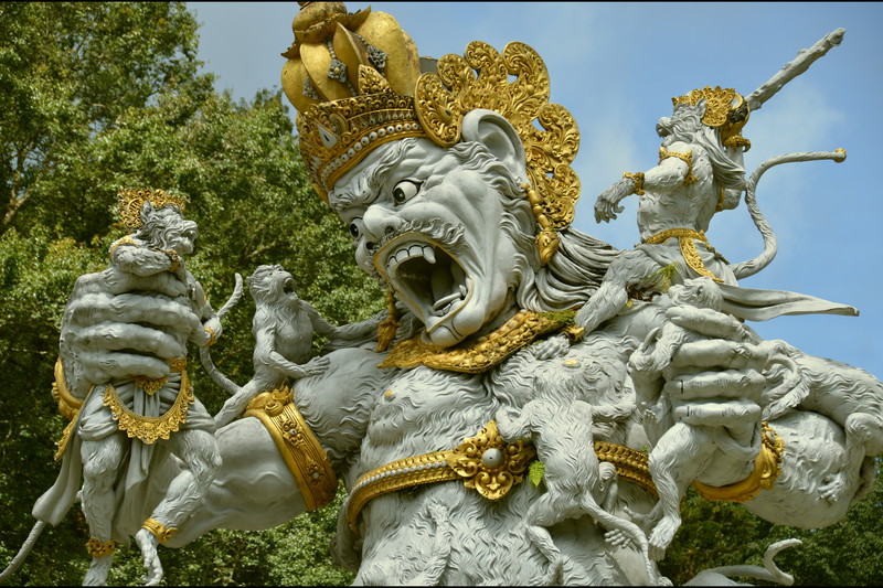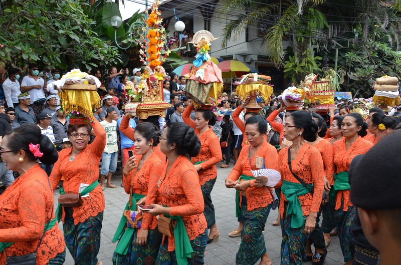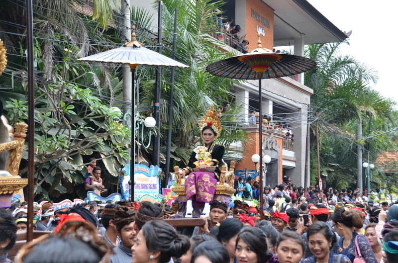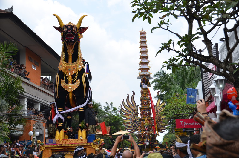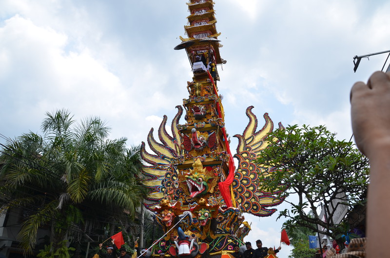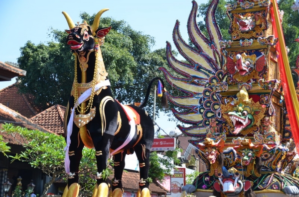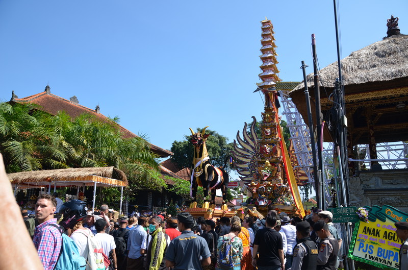 Unser neues Hotel liegt etwas außerhalb vom Zentrum und trotzdem gut zu Fuß zu erreichen. Da wegen der drumherum liegenden Reisfelder kein Autoverkehr möglich ist, herrscht hier absolute Ruhe. Die freundlichen Bedienungen des Surawan Bisma halfen uns gerne, unser schweres Gepäck die rund 200 m bis zur Anlage zu schleppen. Es gibt nur zehn Zimmer, die fast immer belegt sind. Der kleine Pool würde aber auch nicht mehr Urlauber verkraften. Zum Essen gehen wir immer ins Zentrum, welches rund zehn Gehminuten entfernt liegt. Dort gibt es unzählige Möglichkeiten, sich kulinarisch verwöhnen zu lassen. Gleich am ersten Abend kaufen wir uns Karten für ein Gamelankonzert mit Tänzen aus dem Ramajana. Diese Darbietung unter freiem Himmel in einem sphärisch beleuchteten Tempel tat unserer Seele sehr gut. Anschließend gingen wir indonesisch Essen und waren rundum glücklich und zufrieden. Allerdings kamen wir an diesem Abend so spät, wie lange nicht mehr ins Bett; es war fast halb elf. Trotzdem waren wir am nächsten Tag um sieben wach, wie fast täglich. Der Chef des Hauses erklärte uns schon vor dem Frühstück, dass am 02.März ein sehr seltenes Ereignis in Ubud stattfinden würde, welches wir unbedingt anschauen müssten. Die alte Fürstin von Bali, hier auch Königin genannt ist mit über 90 Jahren verstorben und sollte an dem Tag verbrannt werden. Dazu würden tausende aus nah und fern erwartet. Am Zentraltempel waren die Vorbereitungen in vollem Gange und führten täglich zu einem Verkehrschaos im Dorf. Die rund acht Meter hohe Kuh, in welcher die Leiche später verbrannt werden sollte und der rund 15 Meter hohe „Transportturm“ für den Sarg wurden schon seit Tagen aufgebaut. Im Tempel probten die Orchester und hielten die Priester und Gläubigen die notwendigen Zeremonien ab. So machten wir uns am Donnerstag früh genug auf den Weg, um noch einen guten Platz am Straßenrand zu ergattern. Nachdem wir auf dem Markt in einer kleinen Kaffeerösterei zunächst den „besten Espresso der Welt“ zu uns nahmen (frisch geröstet, gemahlen und gebrüht! Die Tasse für 90 Cent), gingen wir zurück zur Hauptstraße, wo es zuging, wie am Rosenmontag in Köln. In einem der Lokale am Straßenrand saßen drei Polizisten auf der Bank, die uns gerne den Platz abtraten, da sie weiter mussten. Welch ein Glück. So hatten wir einen guten Sitzplatz, den wir auch bis zum Schluss verteidigten. Die bestellten Getränke waren allerdings nur zum Teil verfügbar, da auf dieser Seite der Straße allen Geschäften der Strom gekappt wurde, da die Leitungen über die Straße störten. Und dann kam, trotz gesperrter Straße die Prominenz aus Politik und Showbusiness. Rund 50 Autos mit Kennzeichen der „Extraklasse“ fuhren vor und entluden ihre wertvolle Fracht. Danach drehten sie um und standen in Richtung der Prozession. Als die Autos nach über zwei Stunden endlich losfuhren wussten wir, jetzt geht es los.