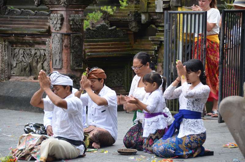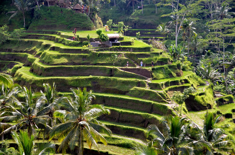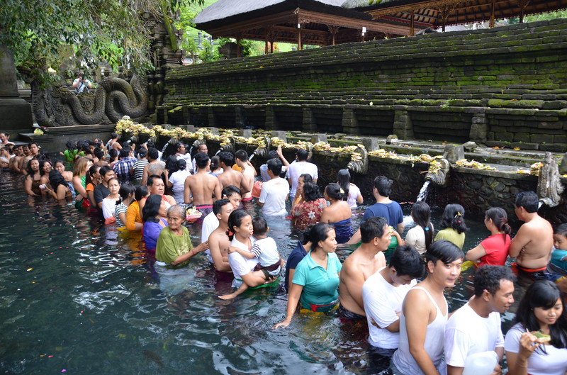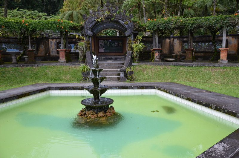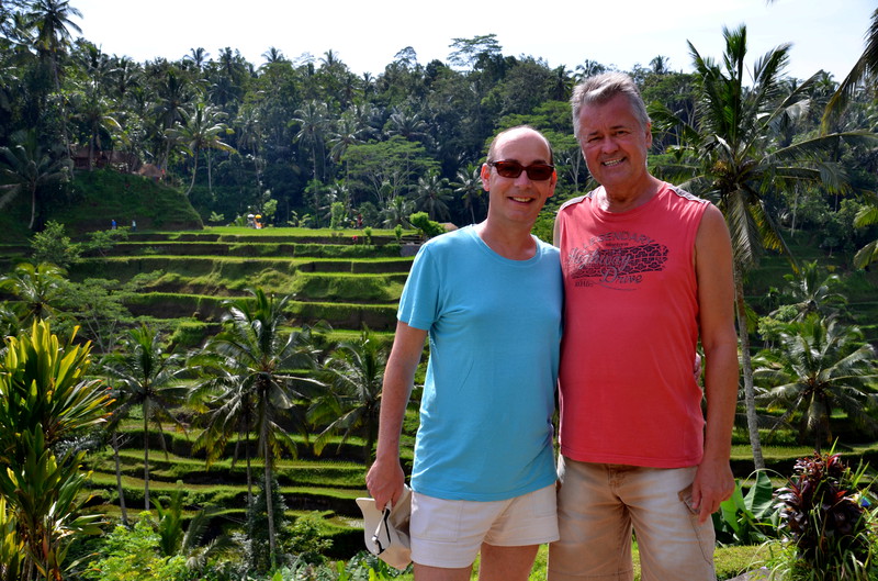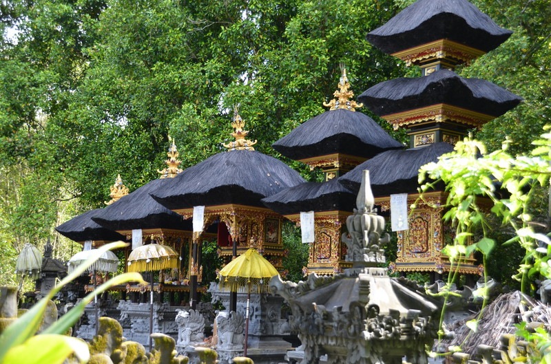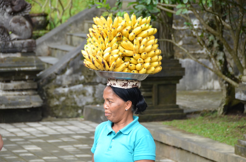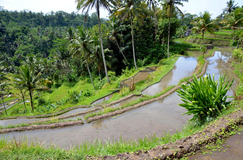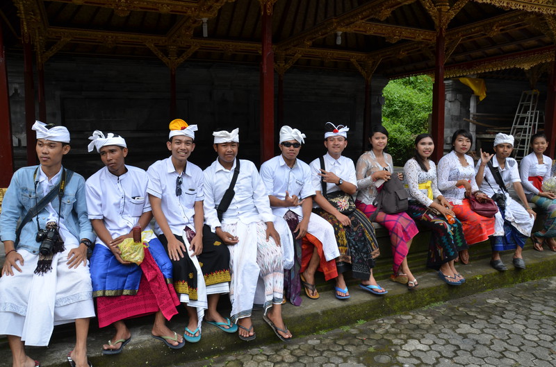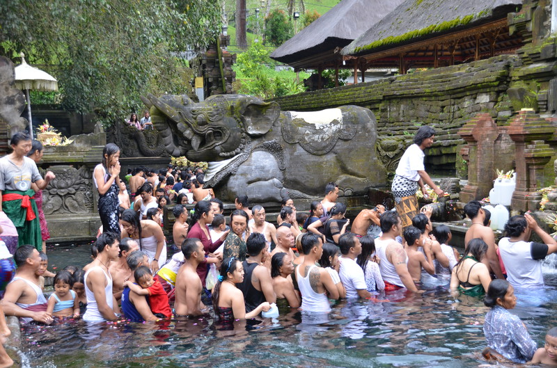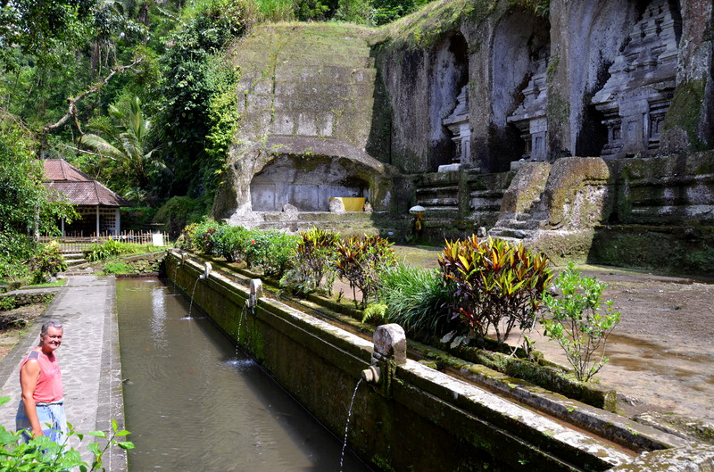 In Munduck machten wir noch einen Tagesausflug bis auf die Höhe von über 1400m.M. Dabei besichtigten wir u.a. einen Tempel, der am Rande eines Sees lag und tatsächlich mal überwiegend neu, bzw. renoviert war. Dafür kamen die Touristen in Massen und man wurde mehr geschoben, als dass man gehen konnte. Den letzten Abend verbrachten wir dann in der Pension Adila und die Chefin kochte uns etwas ganz besonders leckeres: Regula und Achim bekamen ein Fisch Curry nach Art des Hauses. Auf der Fahrt ins „warme Zentrum“ Balis, Ubud, was zugleich das kulturelle Zentrum darstellt, machten wir Halt in Jatiluwi, den größten, zusammenhängenden Reisterrassen Balis, die seit einigen Jahren zum Weltkulturerbe gehören. Eine Wohltat für die Augen, wenn man die unzähligen, grünen Schattierungen anschaut. Das Mittagsbuffet, welches wir dort im Lokal für 7.50 Euro einnahmen, war ebenfalls ein Genuss – für Leib und Seele. Allerdings waren die heißen, heiligen Quellen, die ganz in der Nähe liegen sollten eine Erfahrung der besonderen Art. Allein die Zufahrt war fast kriminell zu nennen und es war erstaunlich, dass unser Fahrer das Auto unbeschadet durch die riesigen Schlaglöcher brachte. Die Quelle selbst war dann verschmutzt und alles andere als einladend. Die Badefläche selbst war kaum größer als eine größere Badewanne. So schauten wir uns die Anlage an, setzten uns wieder ins Auto und schaukelten zurück zur Hauptstraße. In Ubud tobte dann das Leben, wenn auch zunächst nur Verkehrsmäßig.