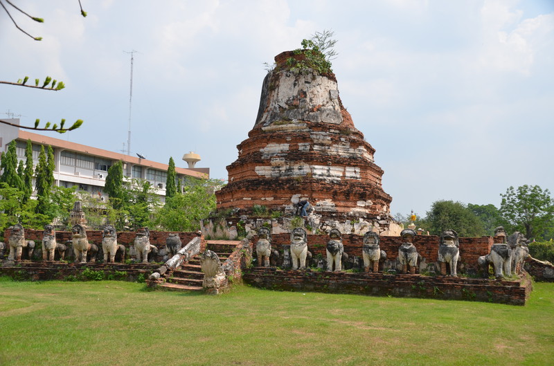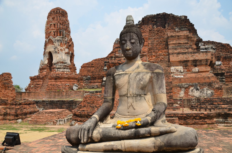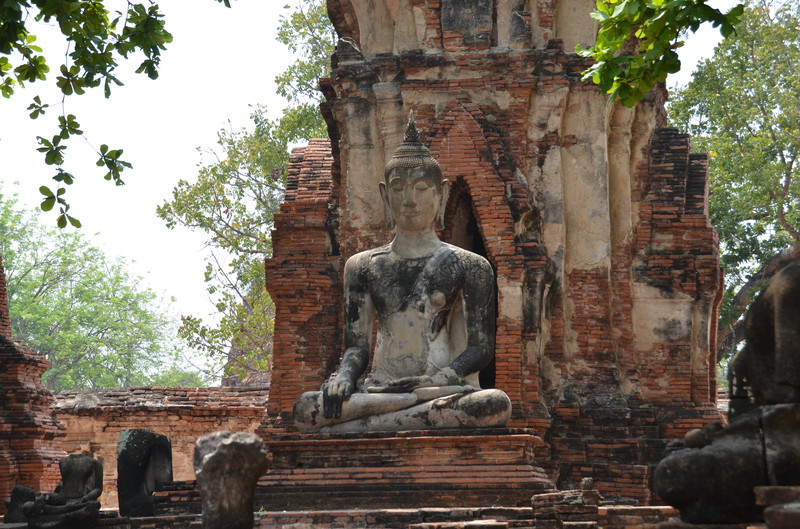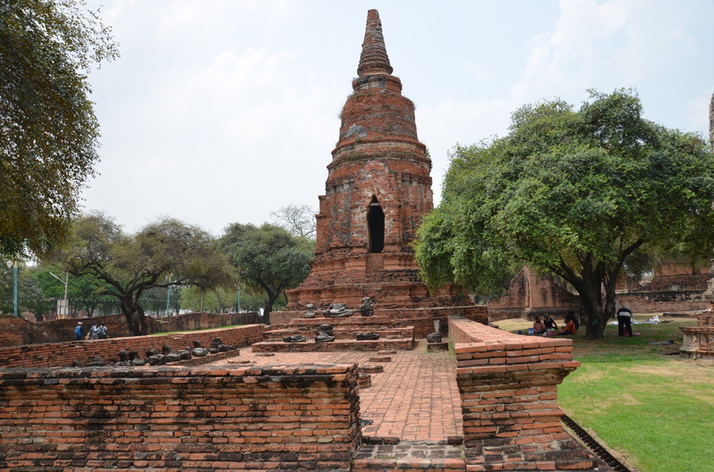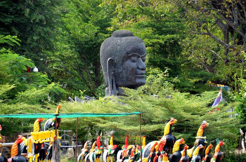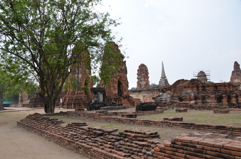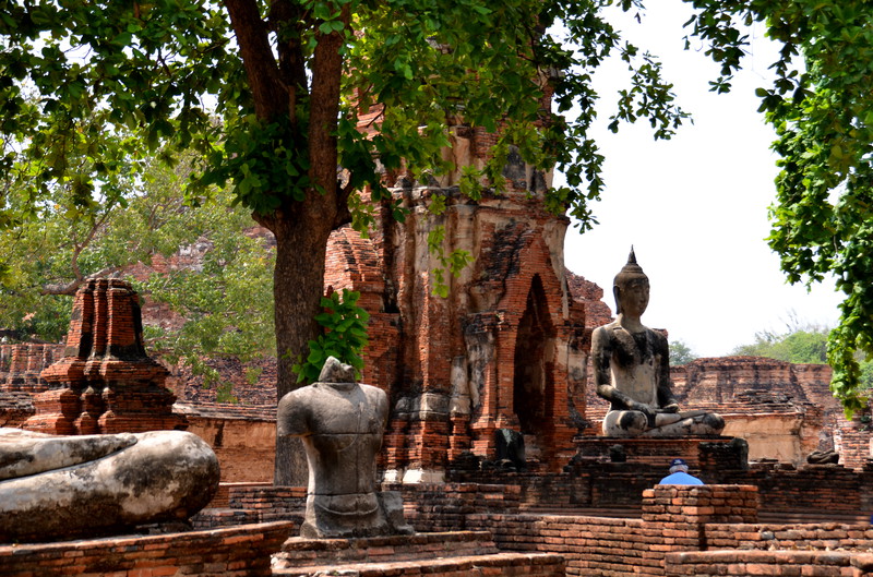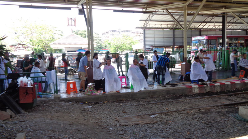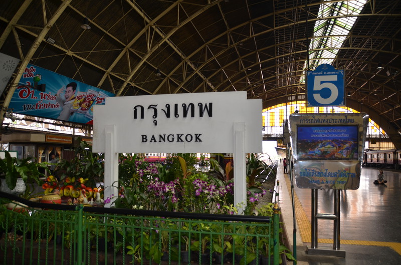 In Bangkok angekommen, lassen wir uns vom Taxi ins Prime Hotel Center Station fahren. Das Hotel liegt 150 m vom Hauptbahnhof entfernt und befindet sich im 6. Bis 16. Stock. Dadurch bekommt man vom Lärm des Verkehrs kaum was mit. In den 54 Euro für die Übernachtung ist bereits das tolle Frühstücksbuffet für zwei Personen enthalten. Gleich am 1.Abend gehen wir zum Bahnhof und kaufen die Bahnkarten nach Ayutthaya, wo wir am nächsten Tag hin wollen und in den Süden nach Prachuap Khirikhan einen Tag später. Alles geht völlig unkompliziert. Wir bekommen Karten für die 2. Klasse nach Ayutthaya und im Schlafwagen in den Süden für insgesamt 1650 THB / rund 48 Euro (für zwei Personen!), da in dem Zug alle besseren Plätze ausverkauft sind. In Ayutthaya machen wir die Erfahrung, dass nicht alle Thais freundlich sind. Zwei Tuk Tuk Fahrer werden laut, beschimpfen uns und geben ihrer Hoffnung Ausdruck, „dass wir nie die Tempel finden mögen“, nur weil wir ihr völlig überteuertes Angebot ablehnen. In einem „Tourenbüro“ geht Achim auf die Toilette und wird anschließend vom Betreiber laut beschimpft, weil das WC nur für Kunden zur Verfügung stünde. Wir nehmen schnell Reißaus. Die riesige Tempelanlage finden wir schließlich, besichtigen aber nur drei der sechs Tempel. Anschließend haben wir genug „Steine gesehen“. Einige der Steintürme machen den Eindruck, als würden sie jeden Moment umfallen. Im 2. Tempel laufen umfangreiche Restaurierungen. Den Kopf des Buddhas, der von den Wurzeln eines Baumes umschlungen und der in allen Reiseführern abgelichtet ist, finden wir auch. Der 3. Tempel ist für uns besonders schön, da er noch von Mönchen betrieben wird und diese im Tempel eine „Notstation“ für über 70 kranke Hunde eingerichtet haben. Auch die Buddhafiguren in den zwei Tempeln sind sehenswert. Achim lässt sich von einem Mönch segnen und bekommt ein buntes Bändchen ans Handgelenk. Danach gehen wir zurück in Richtung Bahnhof und essen unterwegs in einem Lokal noch ein typisches Pad Thai (Nudelgericht). Es ist sehr heiß und die Sonne brennt unbarmherzig vom Himmel. Bis zum Bahnhof laufen wir eine gute 3/4 Stunde. Die Rückfahrkarten, die wir zuvor schon für den Zug um 17 Uhr gekauft haben, können wir unproblematisch umtauschen (40 THB / 1,10 Euro pro Person für 1 ½ Std. Fahrt!). Da eben ein unplanmäßiger Zug nach Bangkok einfährt, steigen wir einfach ein. Allerdings fahren wir in der völlig überfüllten 3. Klasse, da die 2. Klasse ausgebucht war. Jedenfalls ist hier die Lüftung gut, da alle Fenster offen sind. Nach einem Drittel der Fahrt ergattern wir sogar einen Sitzplatz. Abends machen wir einen Spaziergang rund um unser Hotel. Auf dem Nachtmarkt essen wir für 3,50 Euro (zu zweit!) jeder einen Teller Reis mit verschiedenen, teils scharfen Beilagen. Ein Eis aus dem Supermarkt ist unser Dessert und kostet fast so viel, wie das ganze Essen. Von der Dachterrasse unseres Hotels sehen wir ganz in der Nähe einen hell erleuchteten, mehrstöckigen Tempel. Wir nehmen uns vor, diesen morgen noch zu besuchen. Der Besuch von Ayutthaya war so anstrengend, dass wir in der Nacht schlafen wie die toten, obwohl sich die Bewohner im Nachbarzimmer,( nur durch eine einfache Tür getrennt) streiten.