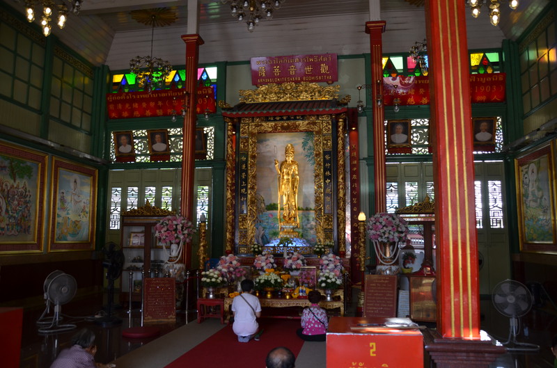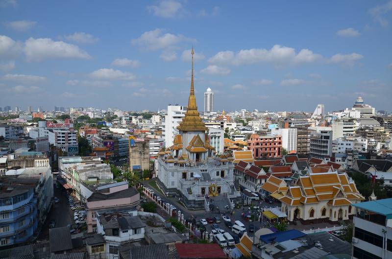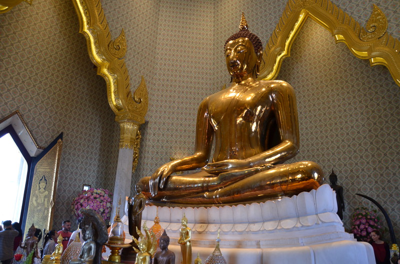 Nach dem köstlichen Frühstücksbuffet machen wir uns auf, den Tempel zu suchen. Dabei merken wir, dass wir uns mitten im Chinaviertel befinden. Eine eigene, sehr schöne Atmosphäre. Als wir schließlich an dem mehrstöckigen Tempel ankommen, sehen wir, dass es sich dabei um den „Goldenen Buddha“ handelt. Diesen Tempel haben wir schon öfters in Bangkok gesucht, bisher aber nie gefunden. Welch ein Zufall. Dafür zahlen wir gerne die 1,10 Euro Eintritt. Es ist der Traimit Witthayaram Tempel. Der Goldene Buddha besteht aus 5,5 Tonnen reinem Gold und ist rund 3,75 m breit und 4,80 m hoch. Die Figur ist 700 Jahre alt und wurde 1931 bei der Verwüstung des Choti – naram Tempels in den Traimit Witthayaram Tempel verbracht. 1955 entdeckte man bei einer Untersuchung, dass unter der aufgetragenen Stein- und Lehmschicht sich eine Figur aus reinem Gold befindet. Dieser Tempel hat regen Zulauf, da die Anbetung dieser Figur jedem Glück und Erfüllung all seiner Wünsche zu jeder Zeit verheißt.