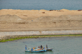 Schon früh am Morgen fährt das Schiff in den Suezkanal ein. Als wir gegen halb neun zum Frühstück an Bord gehen, ist es sehr kühl. Auf der linken Seite zieht der afrikanische, auf der rechten der asiatische Teil des Suezkanals vorbei. Mal ist alles sandig braun, mal sieht man Dörfer und Städte an uns vorbei ziehen. In sicherem Abstand fahren mehrere Schiffe hinter uns her. Im paralel verlaufenden, alten Kanal fahren die Schiffe in entgegengesetzter Richtung.