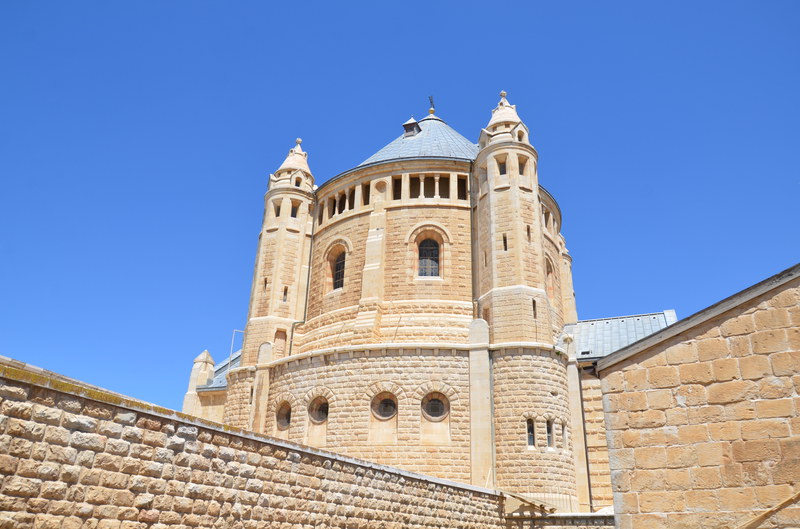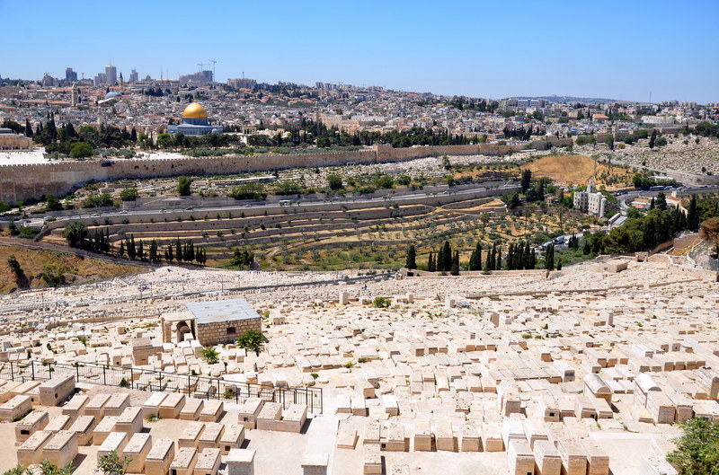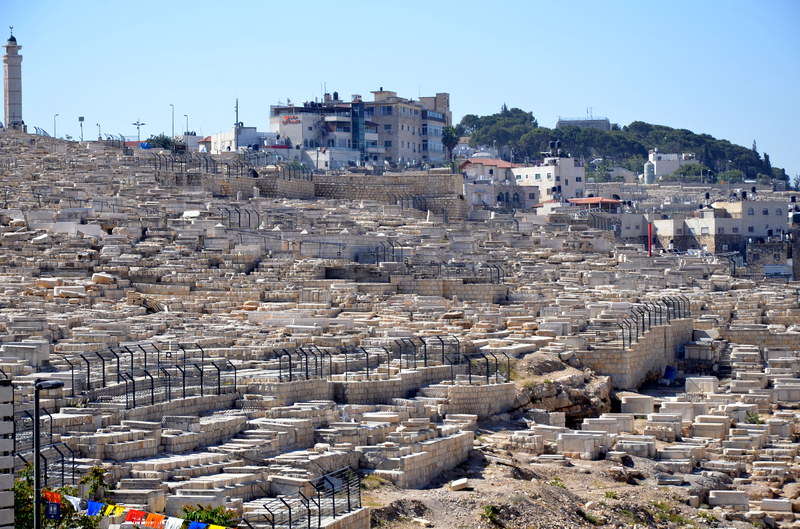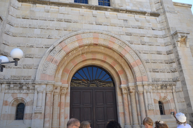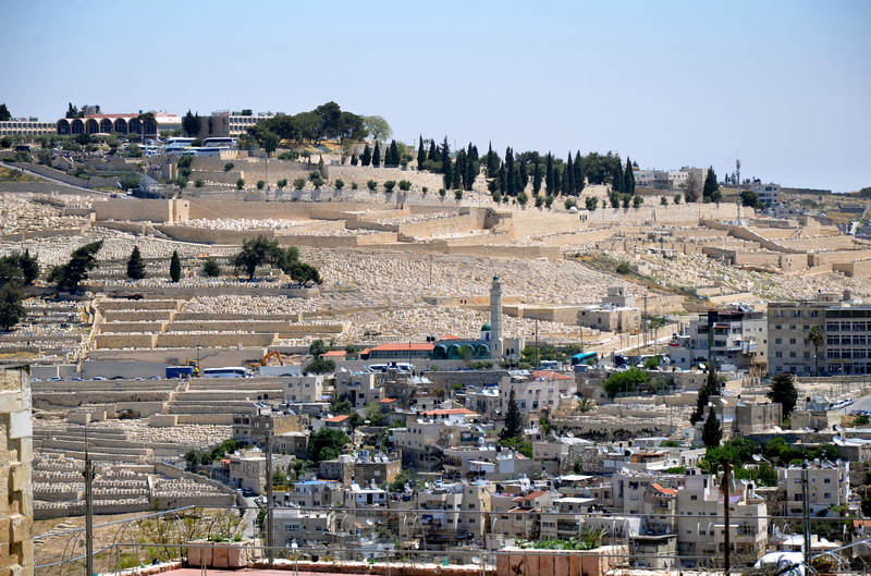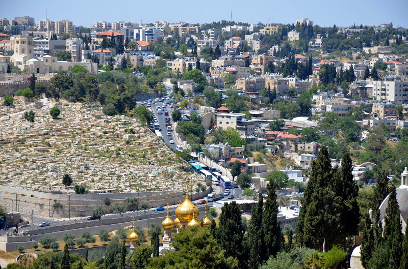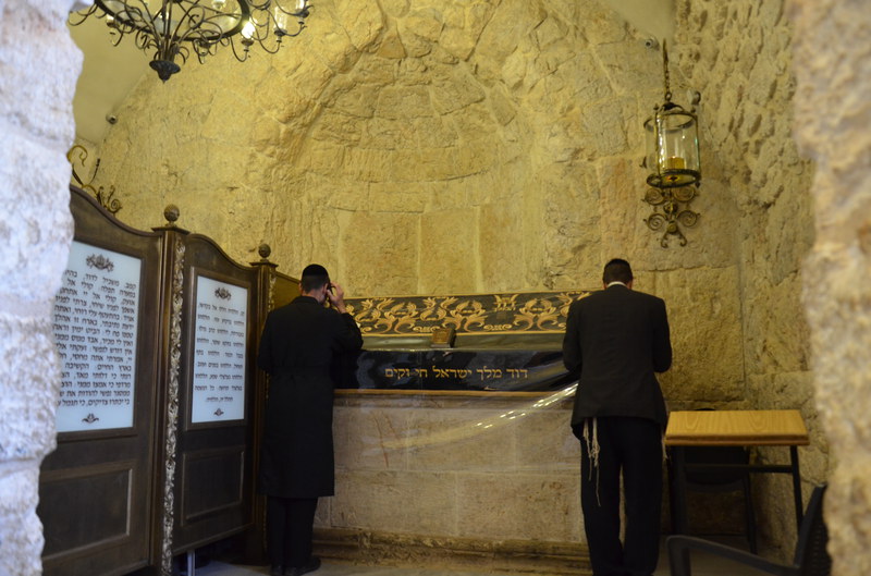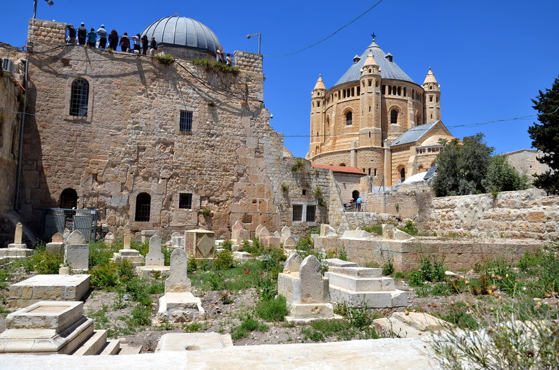 In der Kirche "Davids Grab", mittlerweile wieder eine jüdische Synagoge, ist das Grab von König David und oben der Saal des letzten Abendmahls untergebracht. Ob dies allerdings der tatsächliche Ort dieses geschichtlichen Ereignises ist, wird sehr bezweifelt. Vorbei am "Museum des Holocaust" geht es zurück zum Bus und dann zum Mittagessen. Im "Hotel zum Olivenbaum" werden rund 20 Busse voller Touristen zur gleichen Zeit verköstigt. Ein unmögliches Gedränge. Es bleiben nur 45 Minuten, bevor uns der Reiseleiter wieder zum Bus bittet. Ein letztes Bild vom Ölberg auf die Stadt herunter und es geht nach knapp zehn Minuten weiter in einen Souvenier Shop, vor dem die Busse bereits die Strasse verstopfen und zu einem unmöglichen Verkehrschaos führen. 15 Minuten bleiben, sich den teuren Kitsch an zu schauen. Kaum jemand kauft etwas, auch wenn alles um 50% reduziert wurde. Und dann stehen wir im Stau.