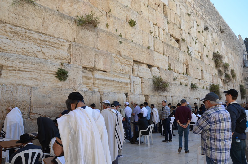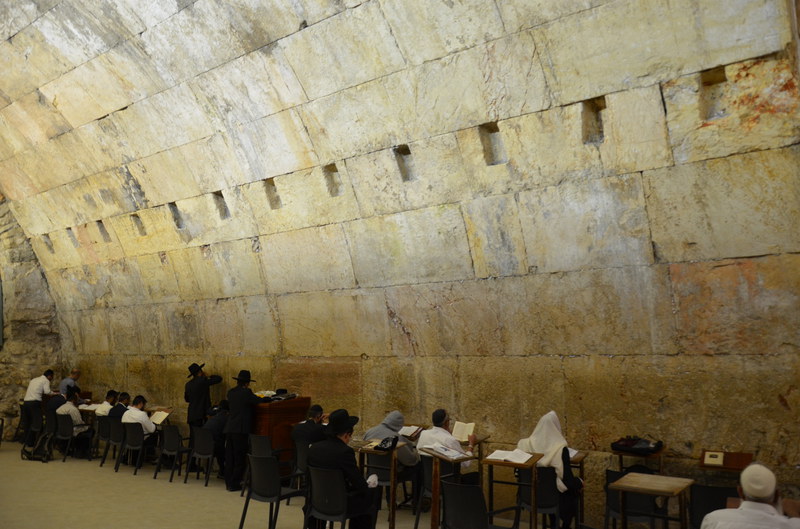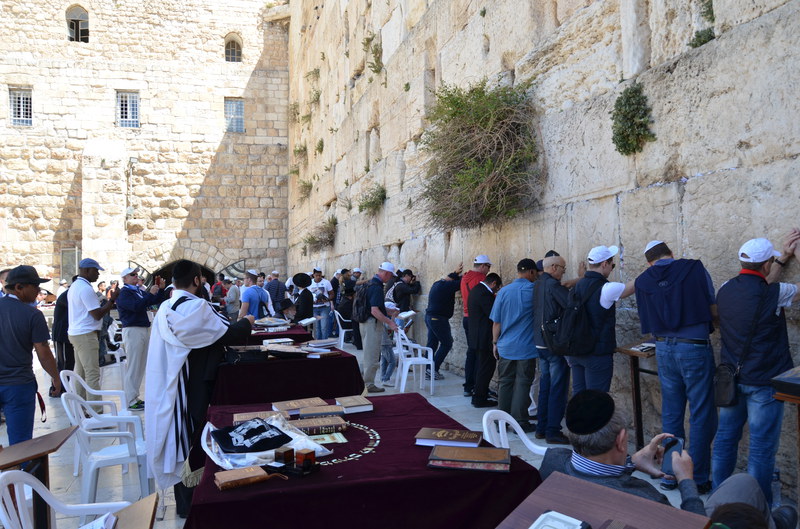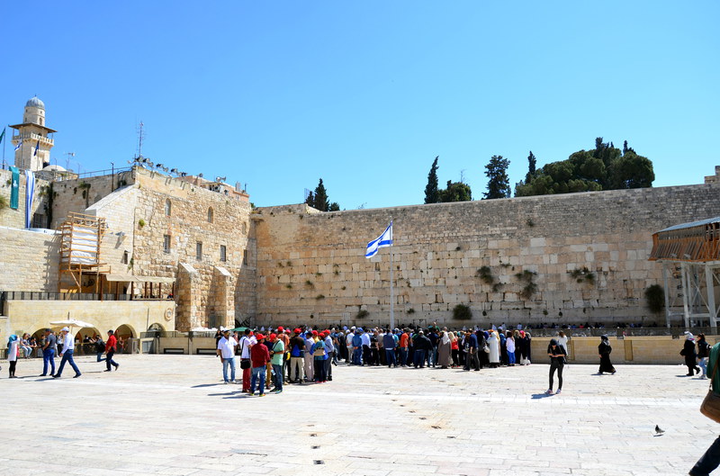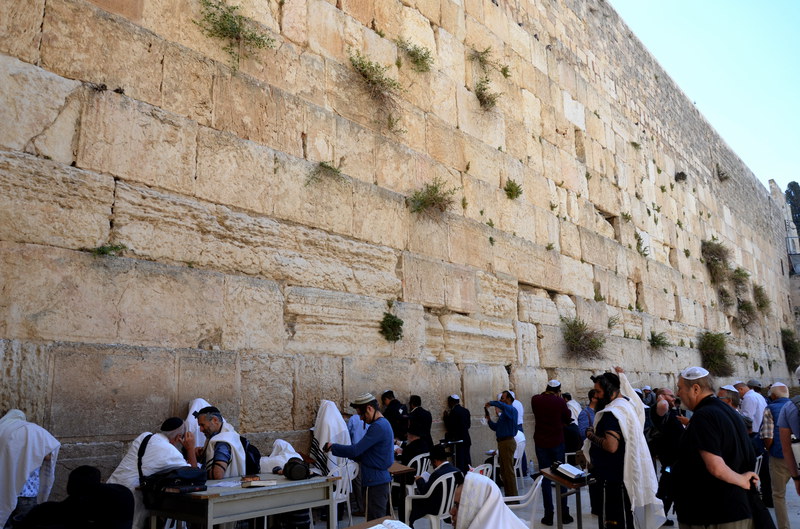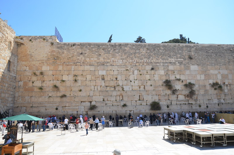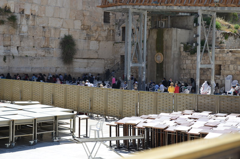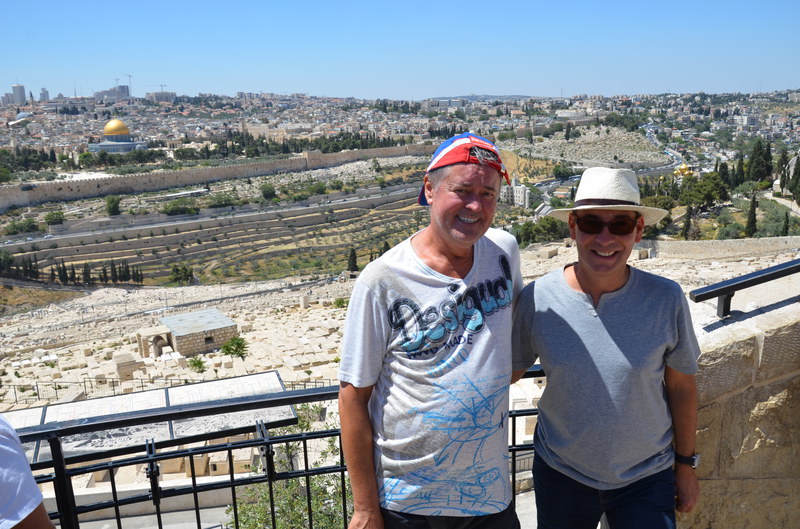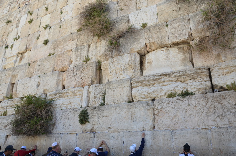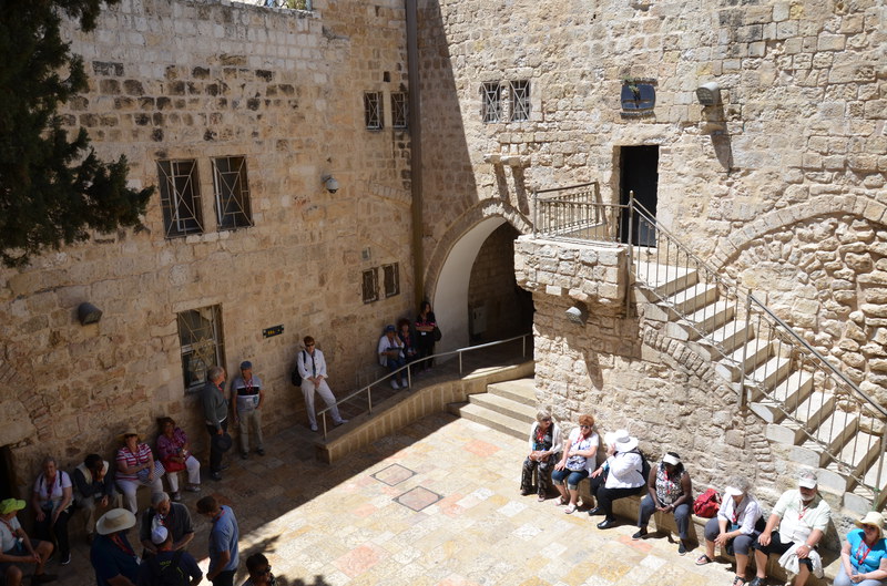 So geht es zunächst in den Garten Gethsemane und die angeschlossene "Basilika der Todesangst". Dort zeigt er uns als wichtigsten Teil den Olivenbaum, den Paul VI. bei seinem Besuch 1964 in Jerusalem gepflanzt hat. Weiter geht es zur Klagemauer. Wir sind erstaunt, wie klein diese ist. Der Teil für die Frauen ist noch wesendlich kleiner, als der für die Männer. Befremdlich ist, die Juden zu beobachten, wie sie beim Beten an der Mauer vor und zurück wippen. Auf dem Weg zum Bus zeigt uns der Reiseführer tiefer unter uns liegend eine uneben, gepflasterte Strasse, auf der es möglich gewesen sein könnte, dass Jesus dort gewandelt ist.