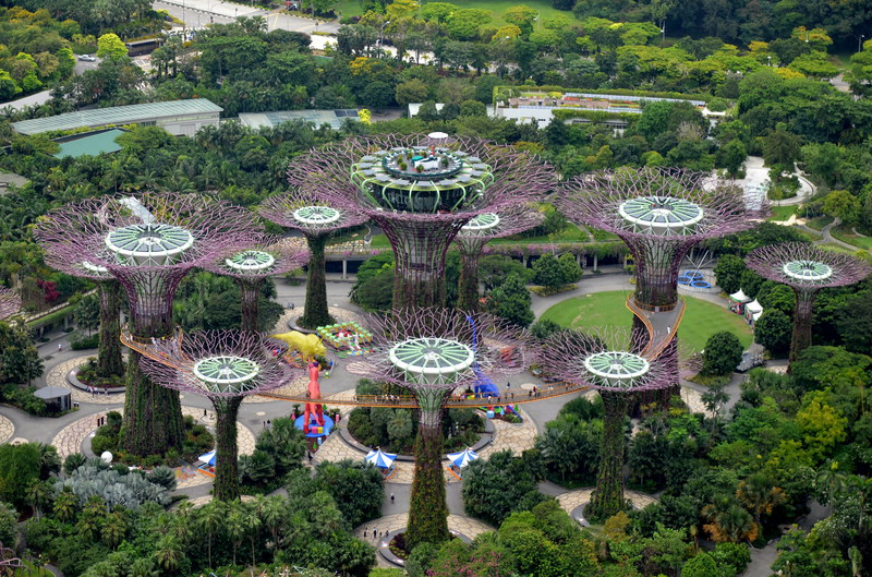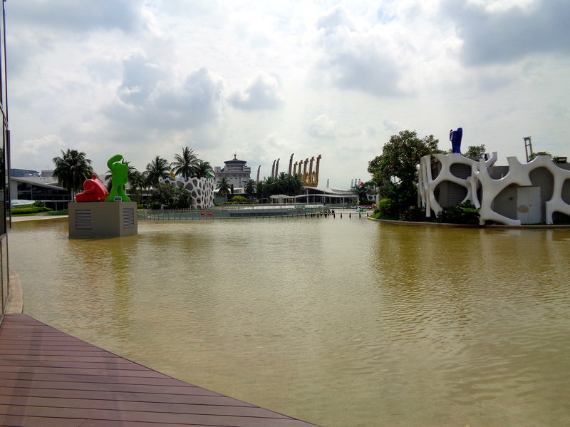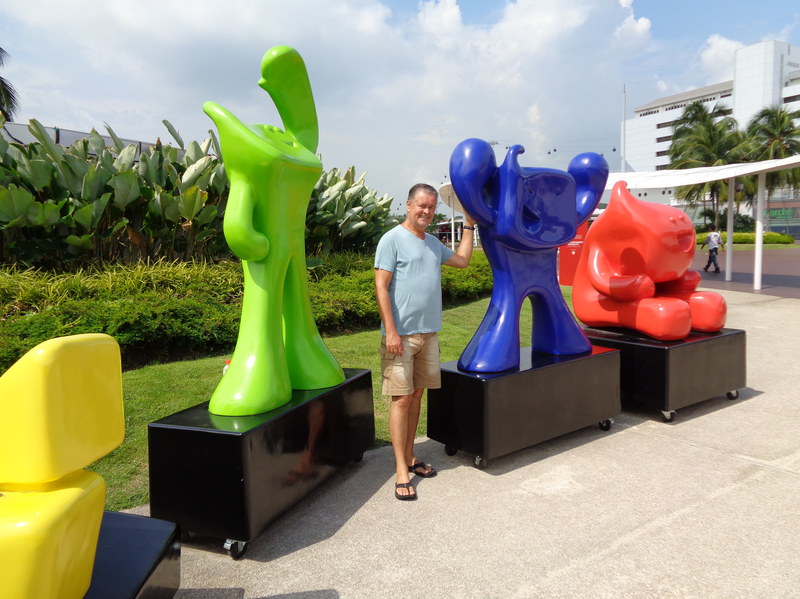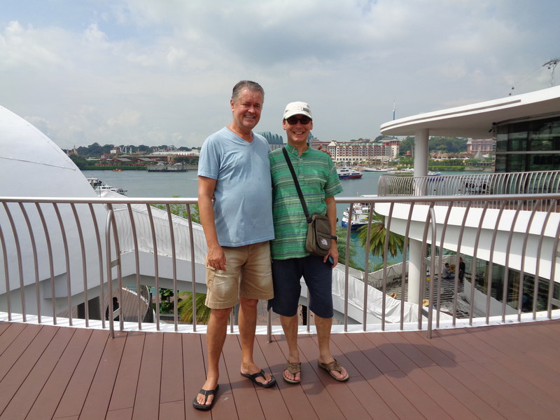 Am nächsten Morgen bleibt Renate lieber auf dem Schiff, da der gestrige Tag doch ganz schön anstrengend für sie war. Wir gehen wieder eine halbe Stunde durch die "Einreise" und sind mitten im Supermarkt. Ein riesiges, verschachteltes Kaufhaus mit 100-ten von Geschäften. Wir laufen einfach los, schauen uns die Auslagen an, treffen überall Leute vom Schiff, die heute die Stunden bis zum Ablegen noch zum Einkauf nutzen und entdecken im 4. Stock eine tolle Parkanlage, mit Bäumen, Büschen und knietiefen Seen. Eine Oase, mitten in der Hektik einer Großstadt. Auf der anderen Seite des Hafens, verbunden mit einem Geh- und Radweg, einer lebhaften Strasse und einer Hochbahn sehen wir den Freizeitpark "Sentosa", vergleichbar mit Europapark Rust oder Phantsialand, nur noch viel größer. Darin befindet sich auch ein Filmstudio.
