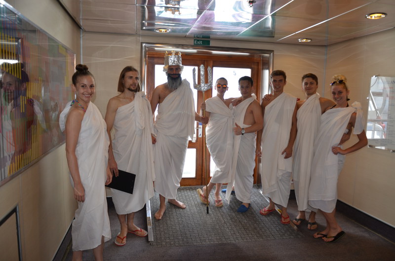 So, ich hoffe, ich habe euch nicht zu sehr mit den "Interna`s" gelangweilt. Im nächsten Blog gibt es dann mehr über die Südsee. Nuku Hiva, Papeete und Bora Bora sind unsere nächsten Ziele. Mir fallen immer wieder tolle Sachen ein, die ich mit euch teilen möchte. Unter anderem haben wir am 01. Februar den Äqutor überschritten. Dazu gab es eine riesige Fete, an welcher fast alle an Bord teilgenommen haben. Nach einer Stunde war das Ganze allerdings vorbei. Wir hatten uns viel mehr davon versprochen, da wir dieses "Großereignis" aus der TV Serie "Verrückt nach Meer" ganz anders erlebt hatten. Nun denn, es war trotzdem schön. Und noch etwas, was nur wenige an Bord erlebt haben, will ich noch kurz erwähnen. Wir saßen vor dem Mittagessen mal wieder an der Reeling, sahen über das Meer und genossen den Wellenschlag. Da kam von unten, keine zehn Meter vom Schiff entfernt ein Hai hoch geschossen, hatte einen großen Tuna vor dem Maul, biss einen riesigen Happen aus dessen Körper und sank wieder, eine riesige Blutspur hinter sich ziehend in die Tiefe. Der Tuna schwamm tot auf dem Meer Kiel oben, um sich eine riesige Blutlache bildend. Leider war er sehr schnell unserem Blick entschwunden. Kurz darauf folgte, vermutlich vom Blutgeruch angelockt ein 3-4 Meter großer Hammerhai. Ein sehr seltenes Schauspiel. Wir haben die Delfine, die Schildkröten und die Haie. Jetzt fehlt uns der Wal und "Mann über Bord". Dann haben wir die Big Five des Ozeans hinter uns.